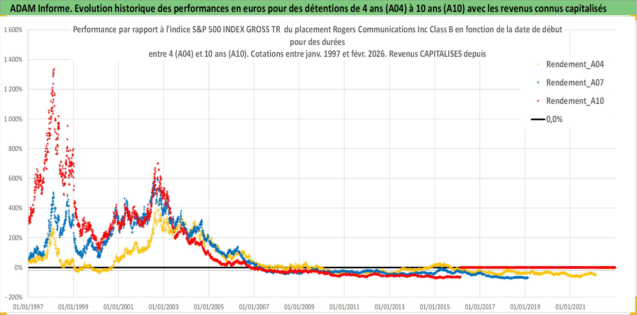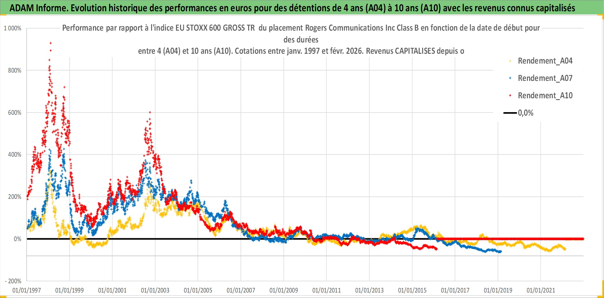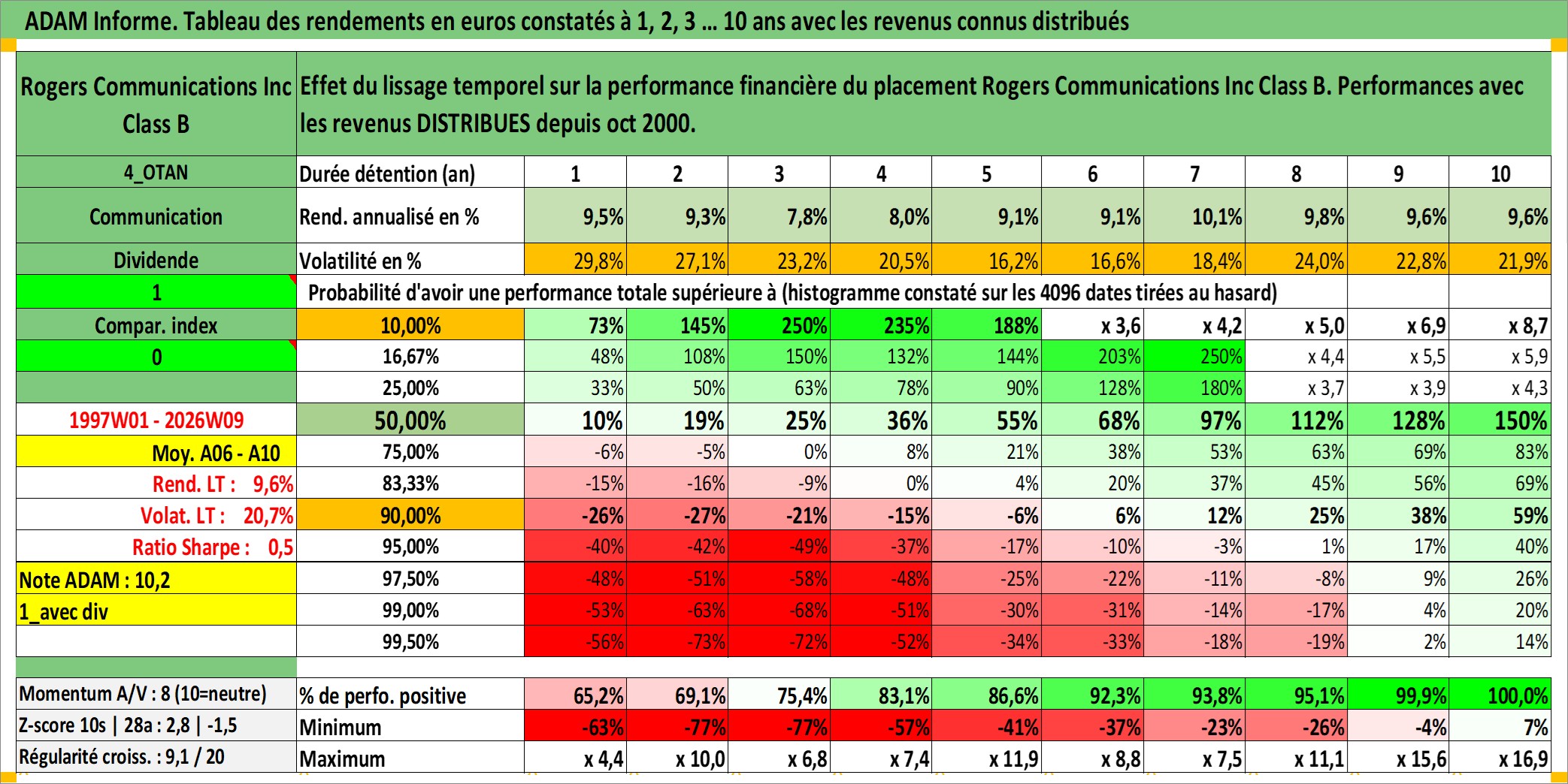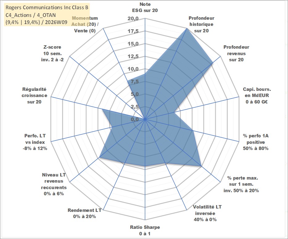 Site dédié aux investisseursPage dédiée sur site financeAnalyse des valorisations hebdomadaires de l'action Rogers Communications Inc Class B. Cet actif est cote en CAD. Les valorisations sont en contrevaleur EURO et couvrent les semaines 1997W01 a 2026W09. Les revenus de cet actif financier sont pris en compte depuis la semaine 2000W41. La note globale ESG de cet actif est estimee a 9.0 (apres rebasage entre 0 et 20).