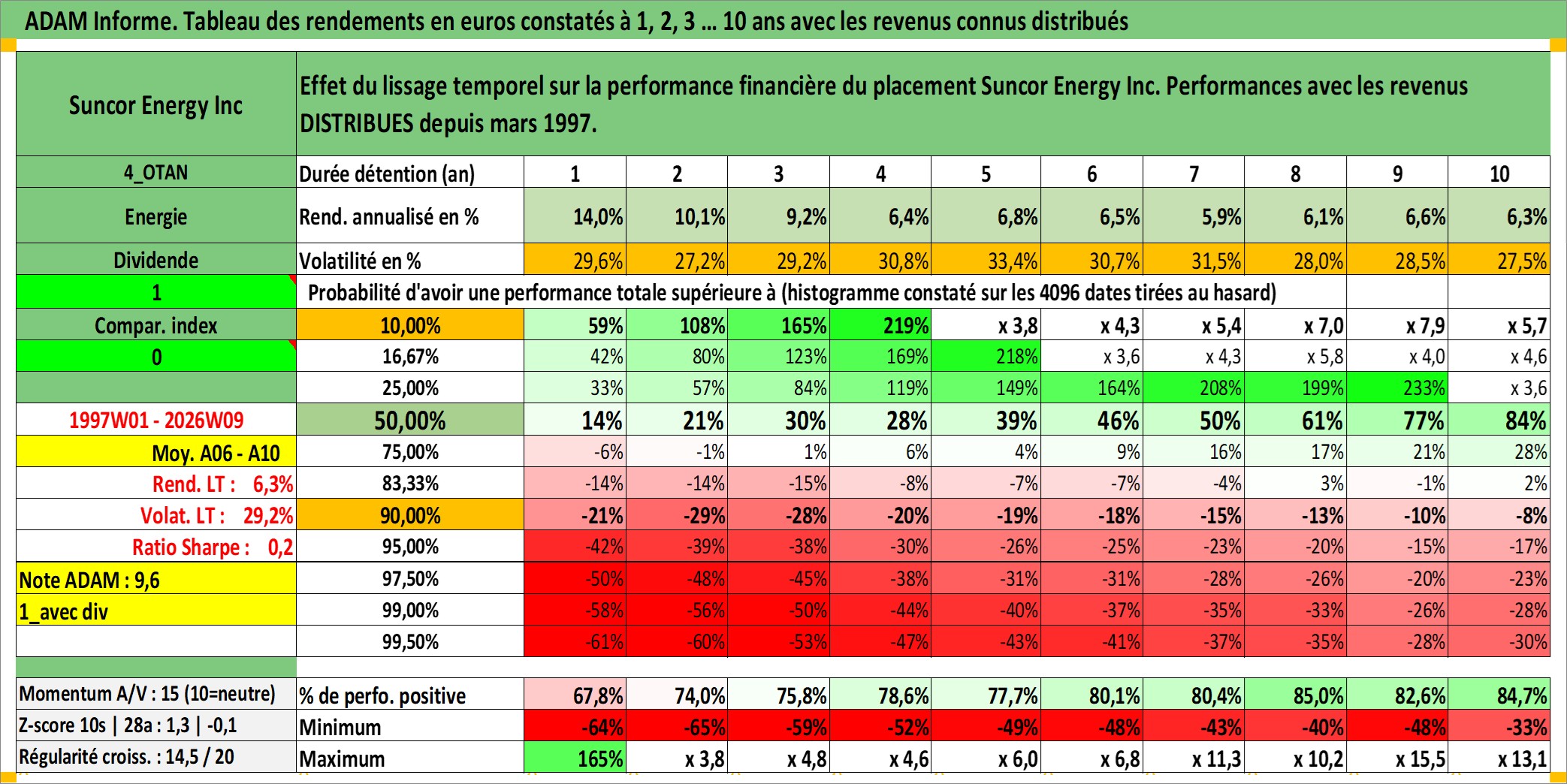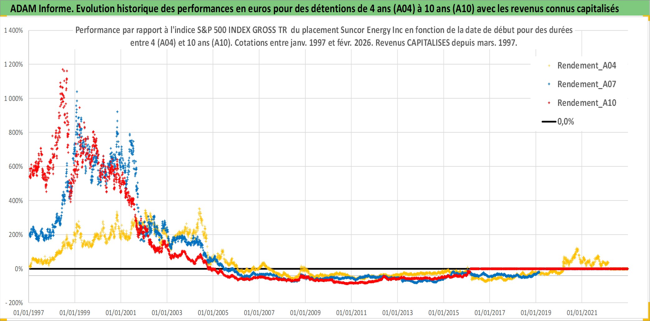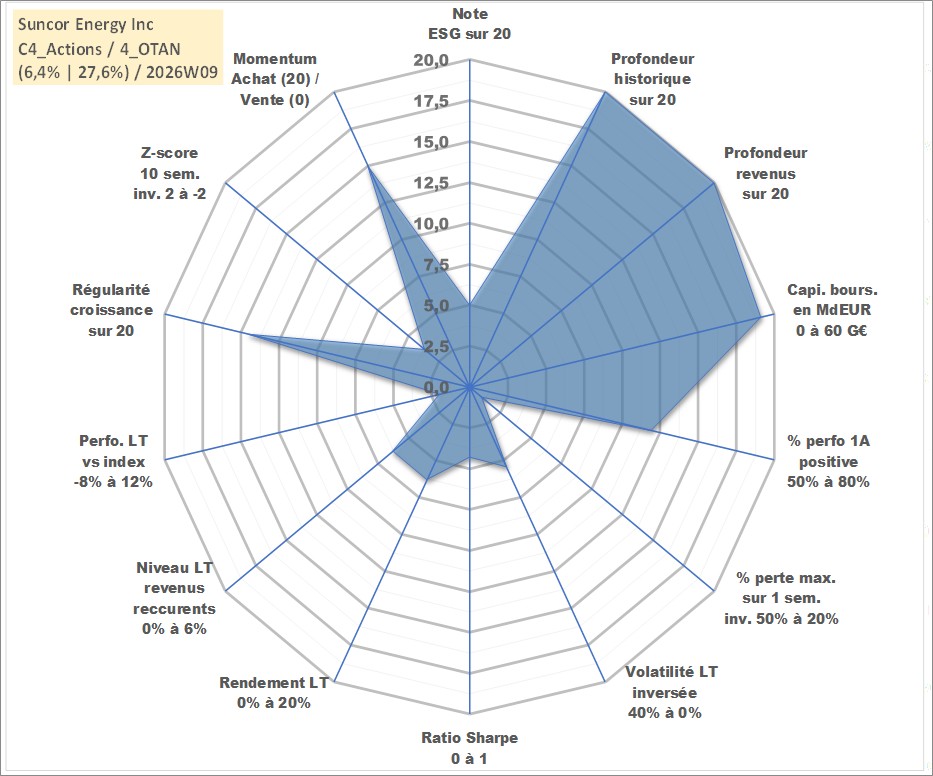 Site dédié aux investisseursPage dédiée sur site financeAnalyse des valorisations hebdomadaires de l'action Suncor Energy Inc. Cet actif est cote en CAD. Les valorisations sont en contrevaleur EURO et couvrent les semaines 1997W01 a 2026W09. Les revenus de cet actif financier sont pris en compte depuis la semaine 1997W11. La note globale ESG de cet actif est estimee a 5.0 (apres rebasage entre 0 et 20).