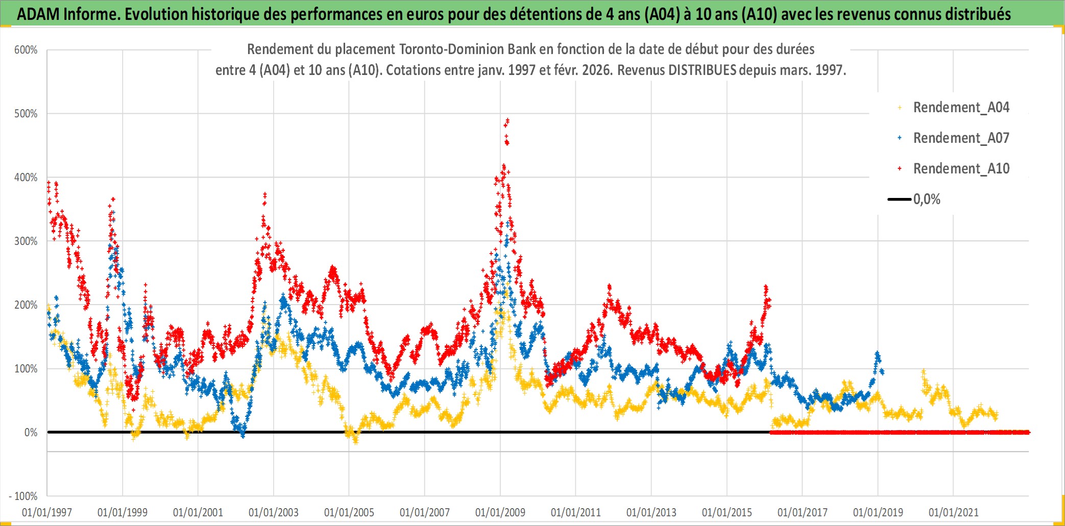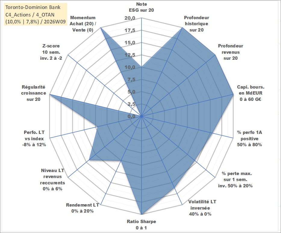 Site dédié aux investisseursPage dédiée sur site financeAnalyse des valorisations hebdomadaires de l'action Toronto-Dominion Bank. Cet actif est cote en CAD. Les valorisations sont en contrevaleur EURO et couvrent les semaines 1997W01 a 2026W09. Les revenus de cet actif financier sont pris en compte depuis la semaine 1997W12. La note globale ESG de cet actif est estimee a 10.0 (apres rebasage entre 0 et 20).