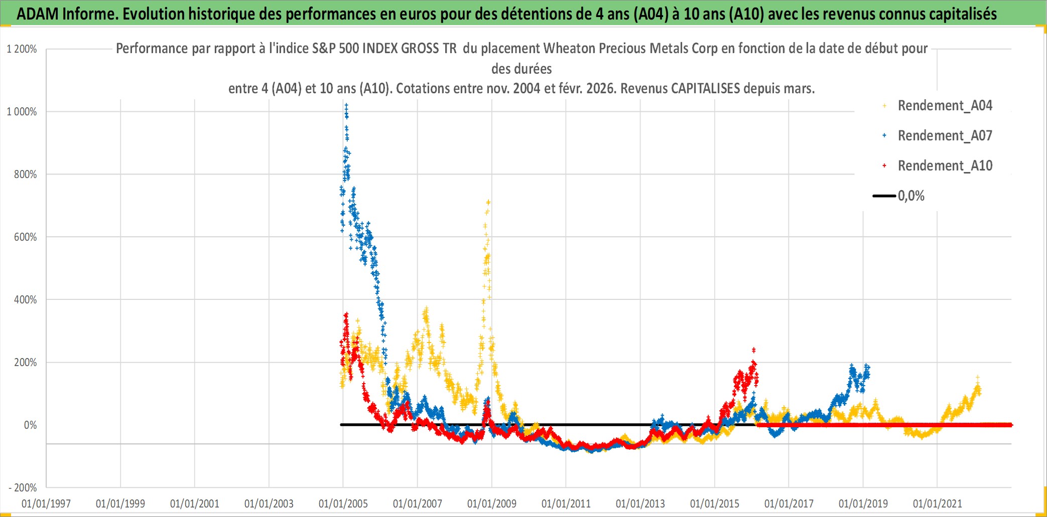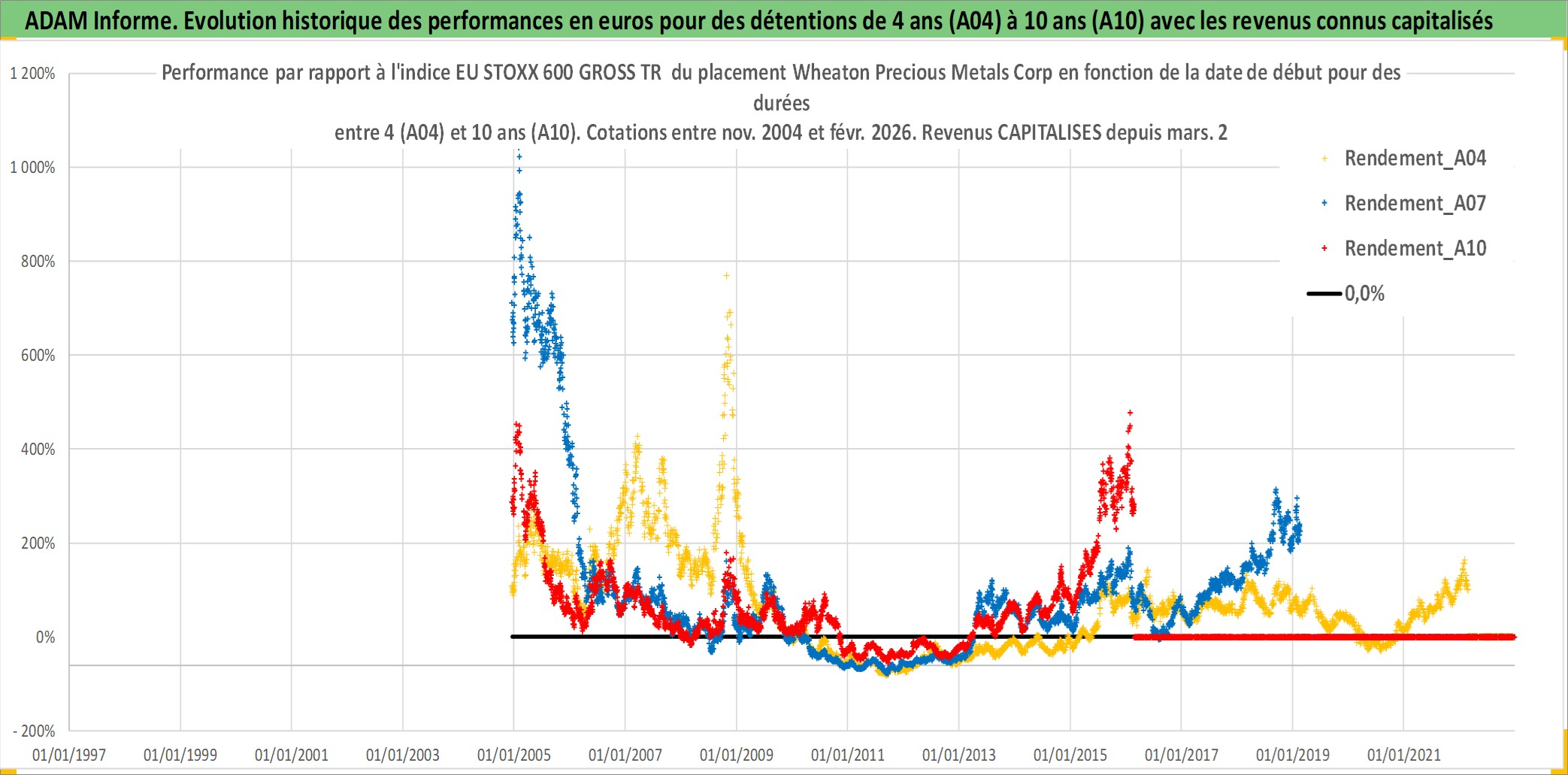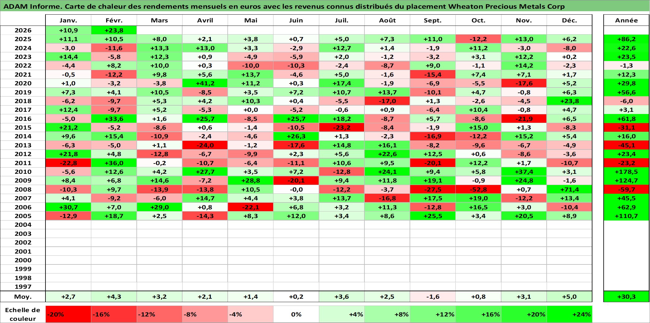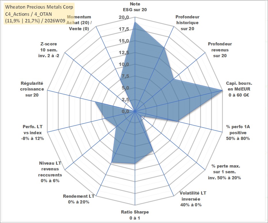 Site dédié aux investisseursPage dédiée sur site financeAnalyse des valorisations hebdomadaires de l'action Wheaton Precious Metals Corp. Cet actif est cote en CAD. Les valorisations sont en contrevaleur EURO et couvrent les semaines 2004W49 a 2026W09. Les revenus de cet actif financier sont pris en compte depuis la semaine 2011W11. La note globale ESG de cet actif est estimee a 19.0 (apres rebasage entre 0 et 20).