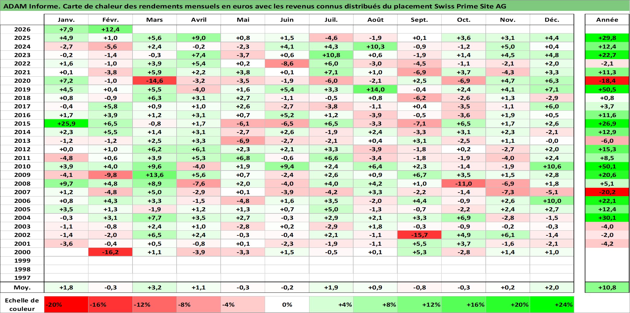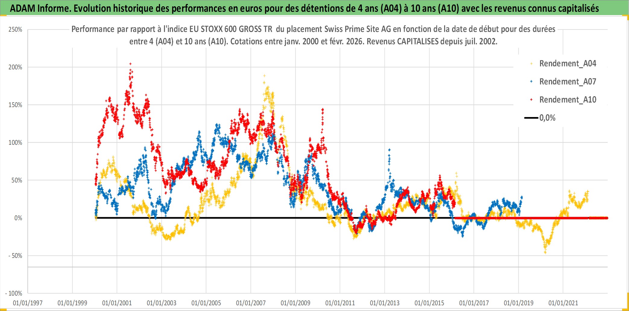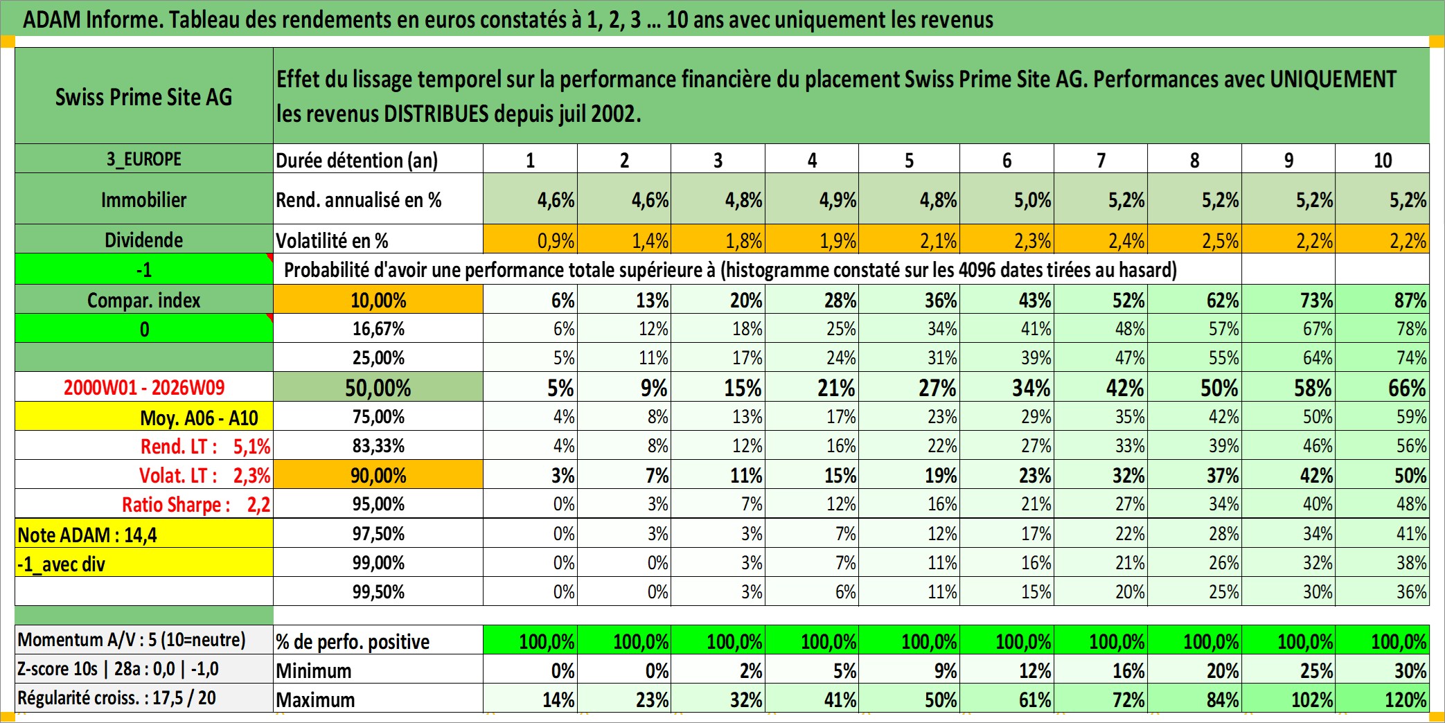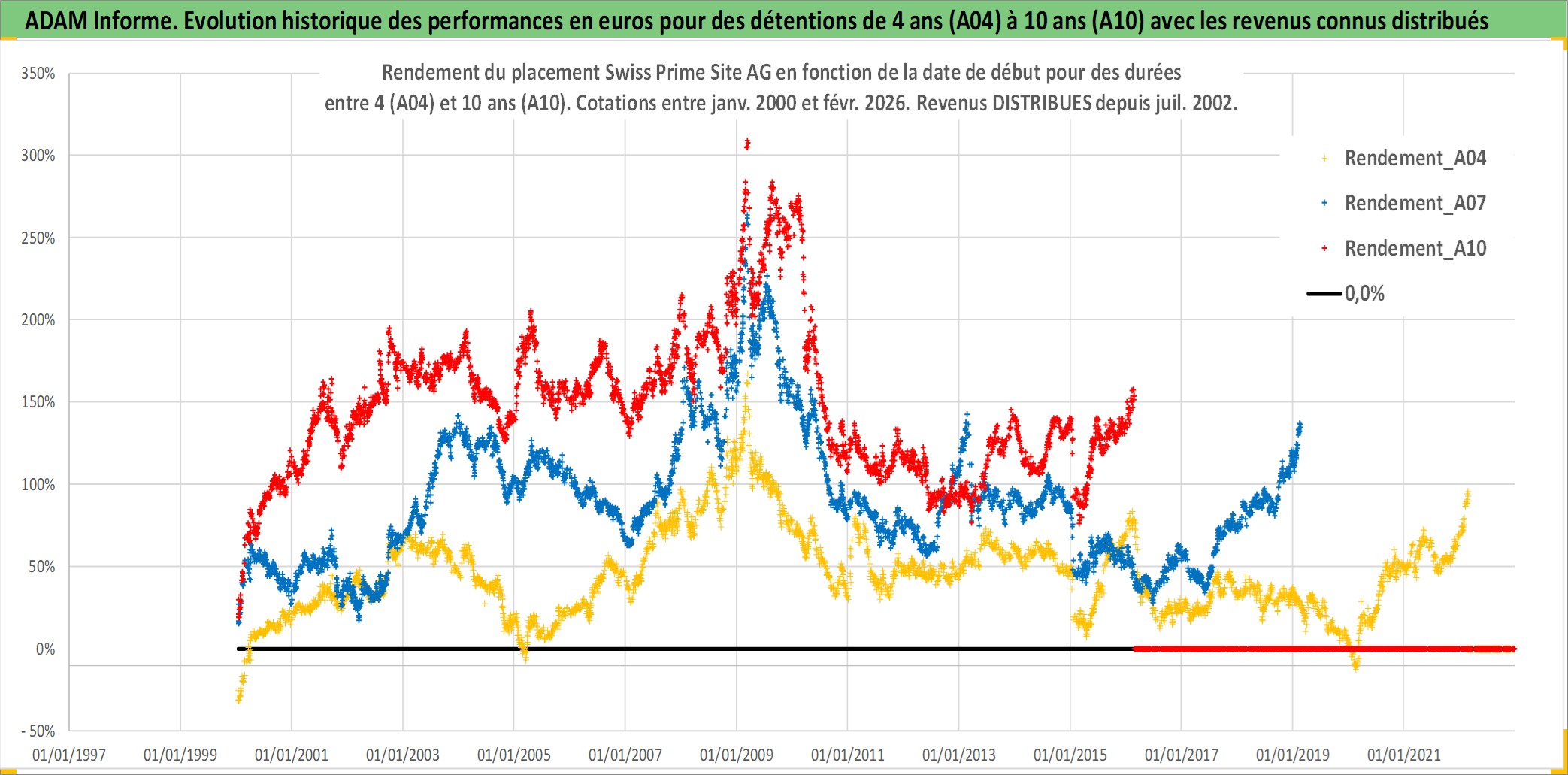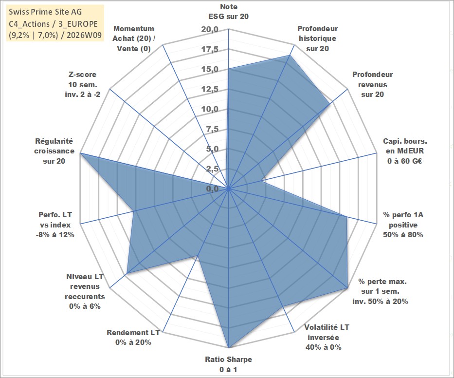 Site dédié aux investisseursPage dédiée sur site financeAnalyse des valorisations hebdomadaires de l'action Swiss Prime Site AG. Cet actif est cote en CHF. Les valorisations sont en contrevaleur EURO et couvrent les semaines 2000W01 a 2026W09. Les revenus de cet actif financier sont pris en compte depuis la semaine 2002W31. La note globale ESG de cet actif est estimee a 15.0 (apres rebasage entre 0 et 20).