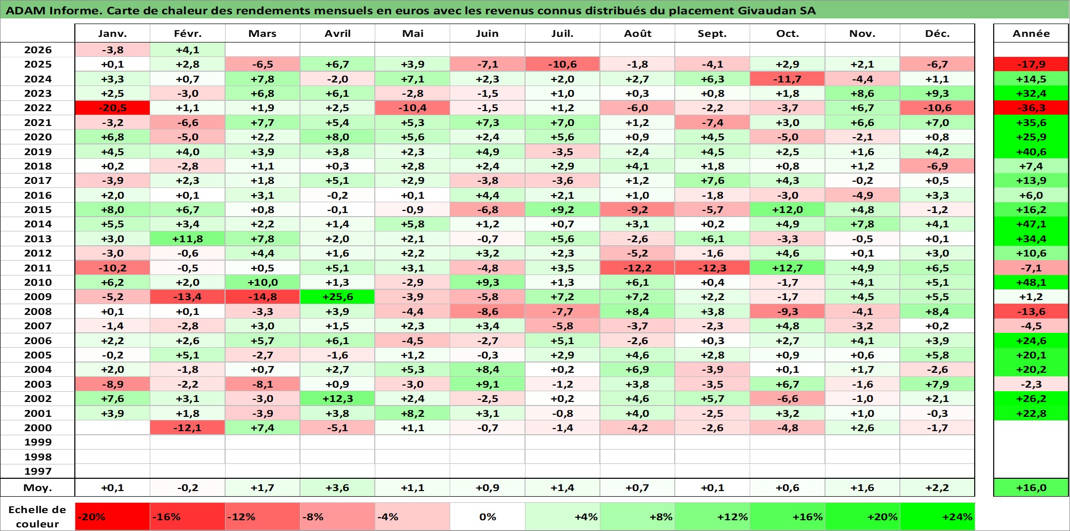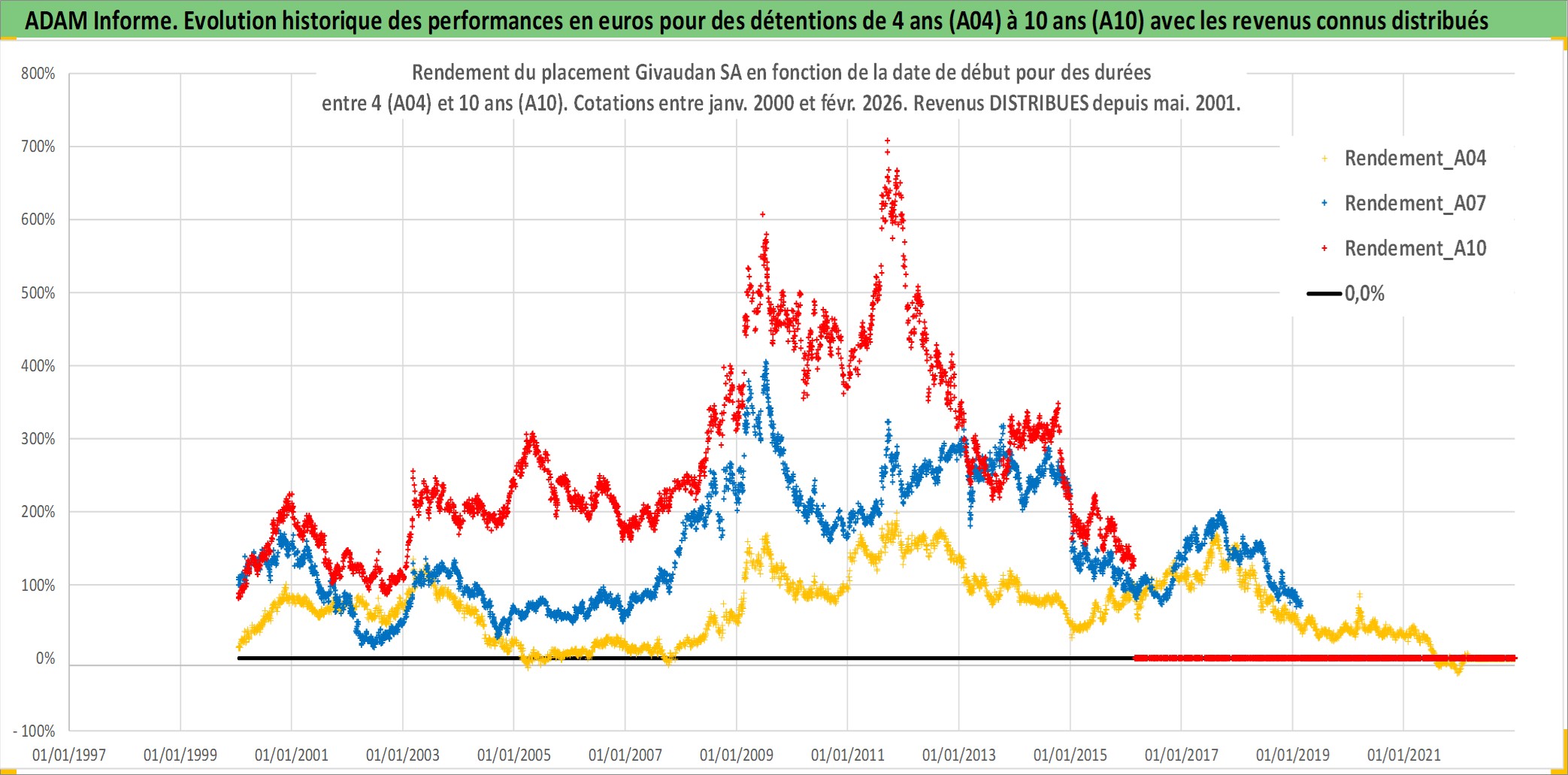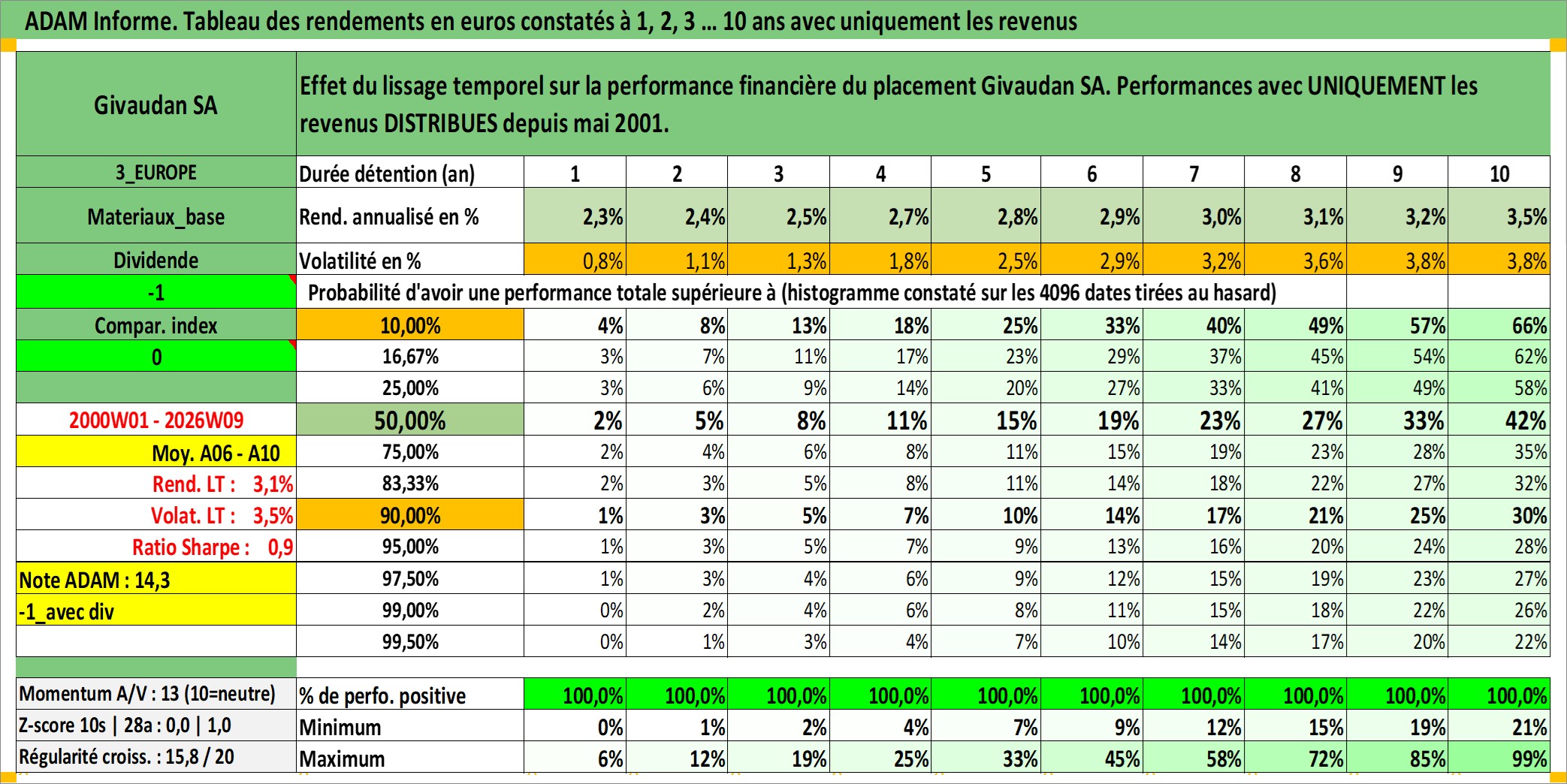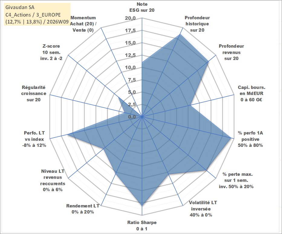 Site dédié aux investisseursPage dédiée sur site financeAnalyse des valorisations hebdomadaires de l'action Givaudan SA. Cet actif est cote en CHF. Les valorisations sont en contrevaleur EURO et couvrent les semaines 2000W01 a 2026W09. Les revenus de cet actif financier sont pris en compte depuis la semaine 2001W21. La note globale ESG de cet actif est estimee a 11.0 (apres rebasage entre 0 et 20).
