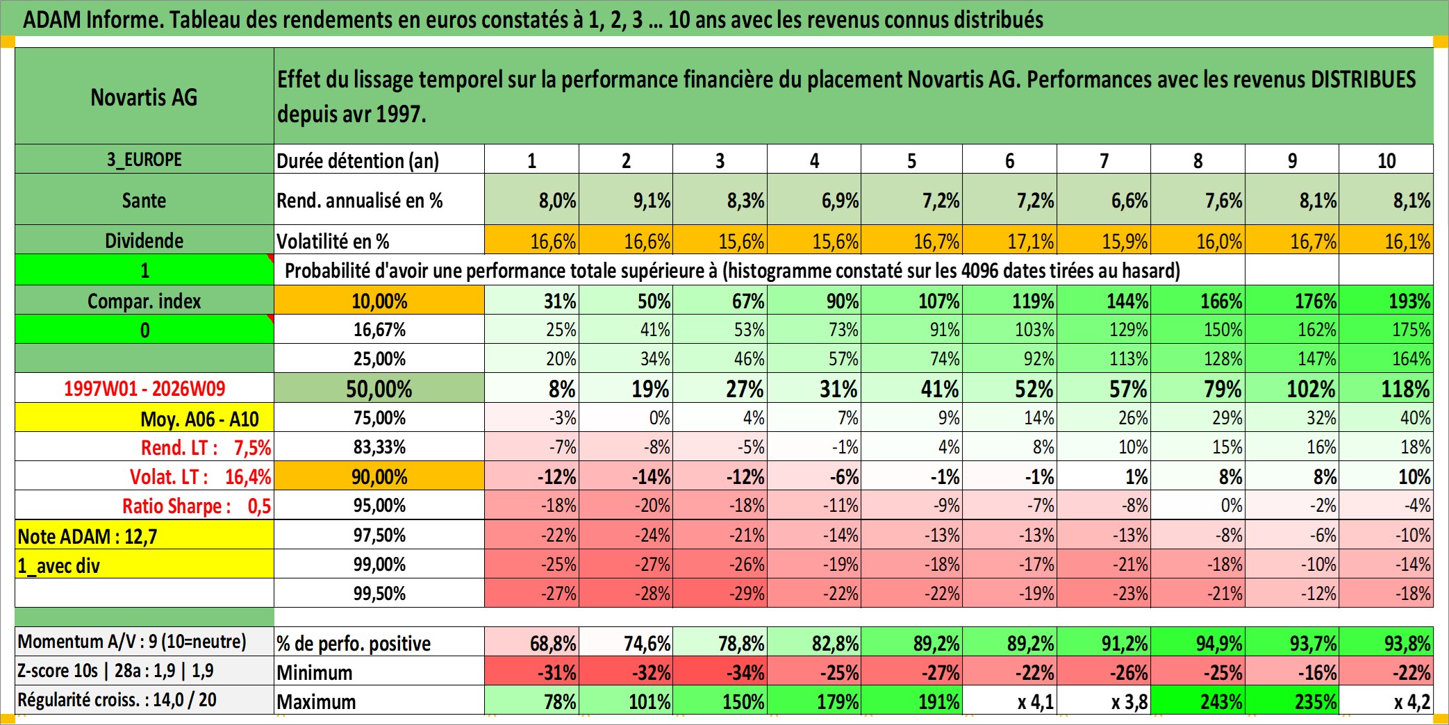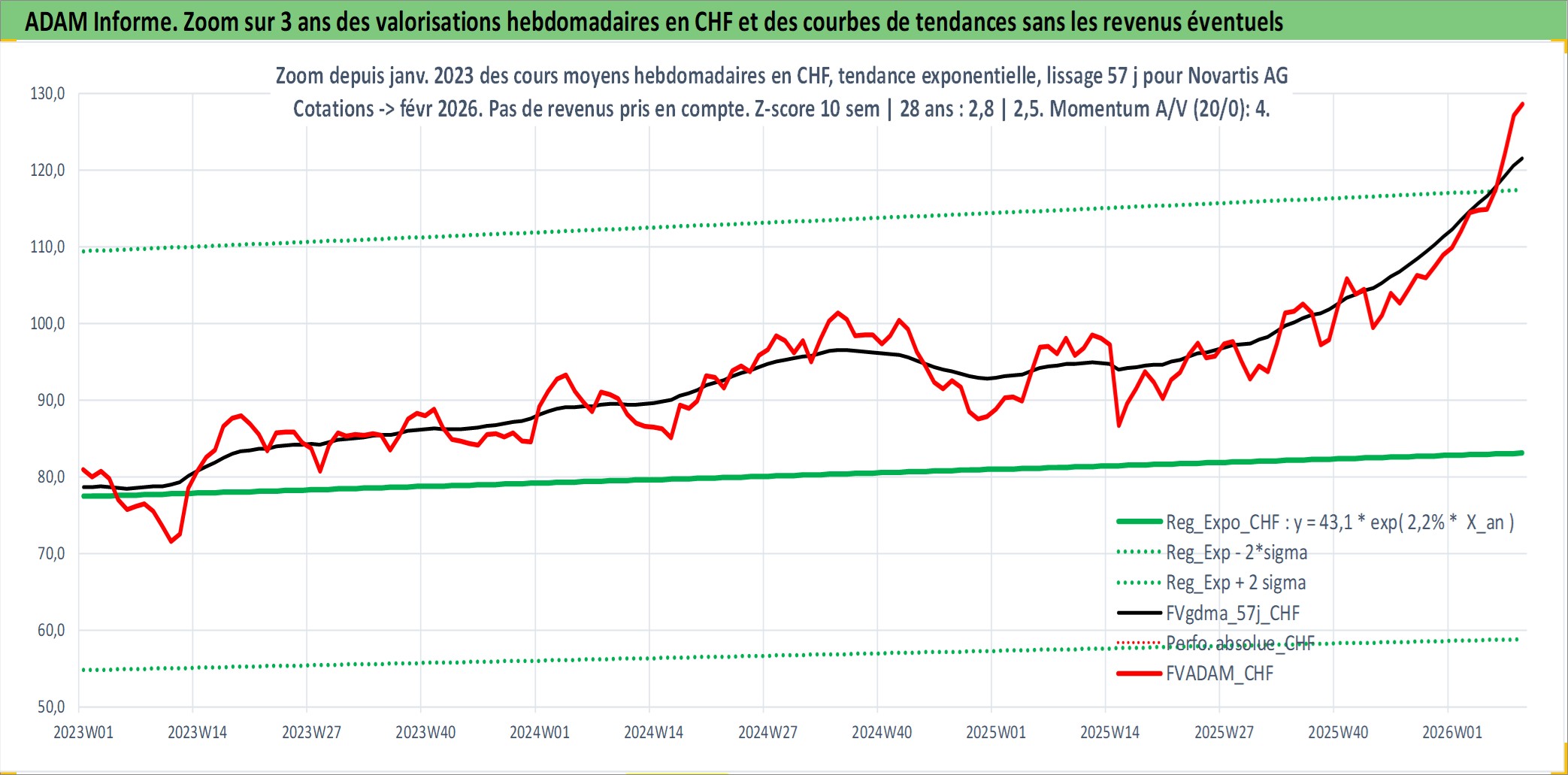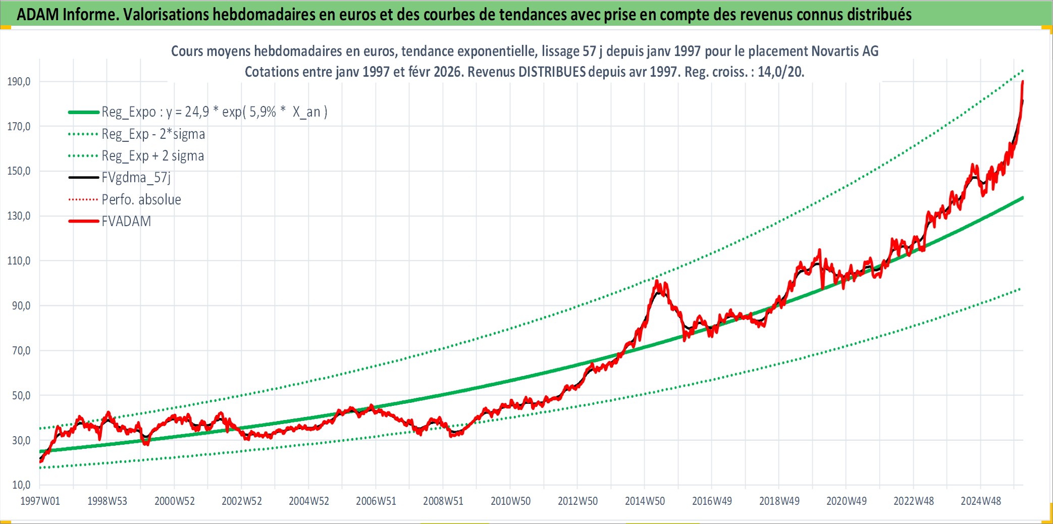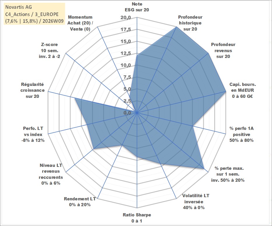 Site dédié aux investisseursPage dédiée sur site financeAnalyse des valorisations hebdomadaires de l'action Novartis AG. Cet actif est cote en CHF. Les valorisations sont en contrevaleur EURO et couvrent les semaines 1997W01 a 2026W09. Les revenus de cet actif financier sont pris en compte depuis la semaine 1997W17. La note globale ESG de cet actif est estimee a 12.0 (apres rebasage entre 0 et 20).