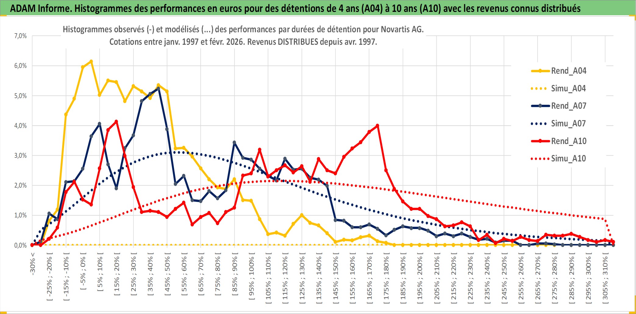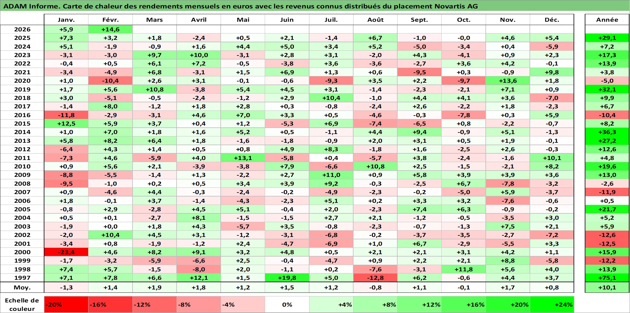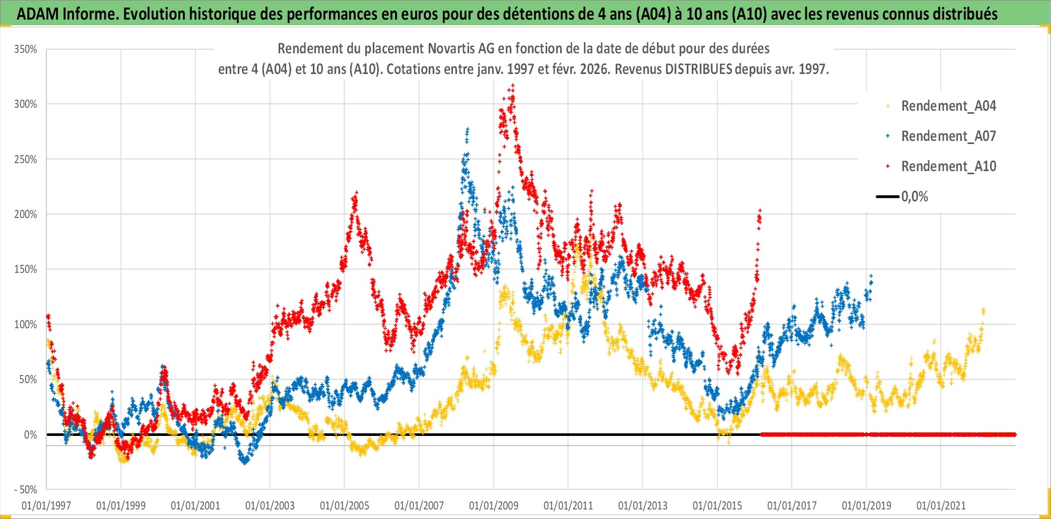 Site dédié aux investisseursPage dédiée sur site financeAnalyse des valorisations hebdomadaires de l'action Novartis AG. Cet actif est cote en CHF. Les valorisations sont en contrevaleur EURO et couvrent les semaines 1997W01 a 2026W09. Les revenus de cet actif financier sont pris en compte depuis la semaine 1997W17. La note globale ESG de cet actif est estimee a 12.0 (apres rebasage entre 0 et 20).