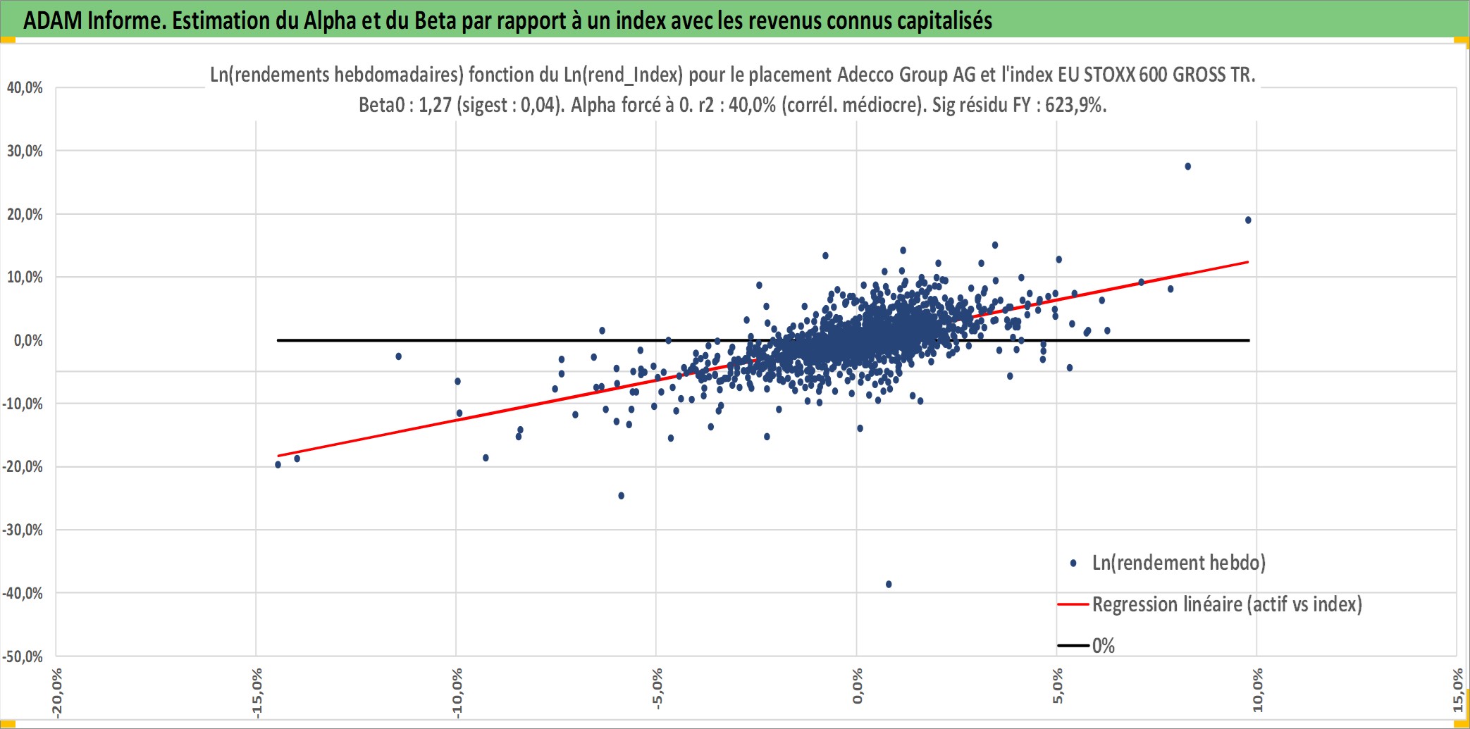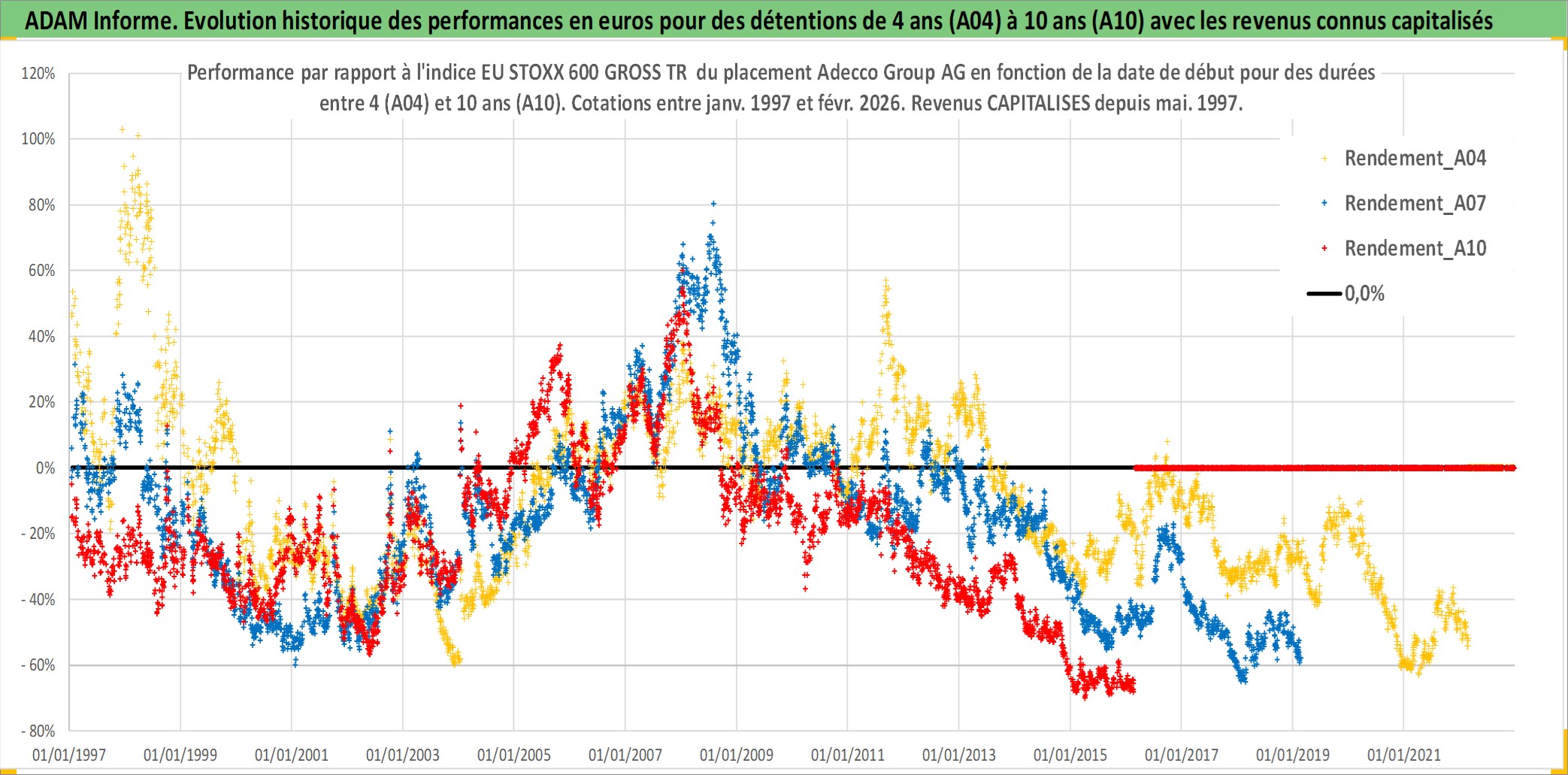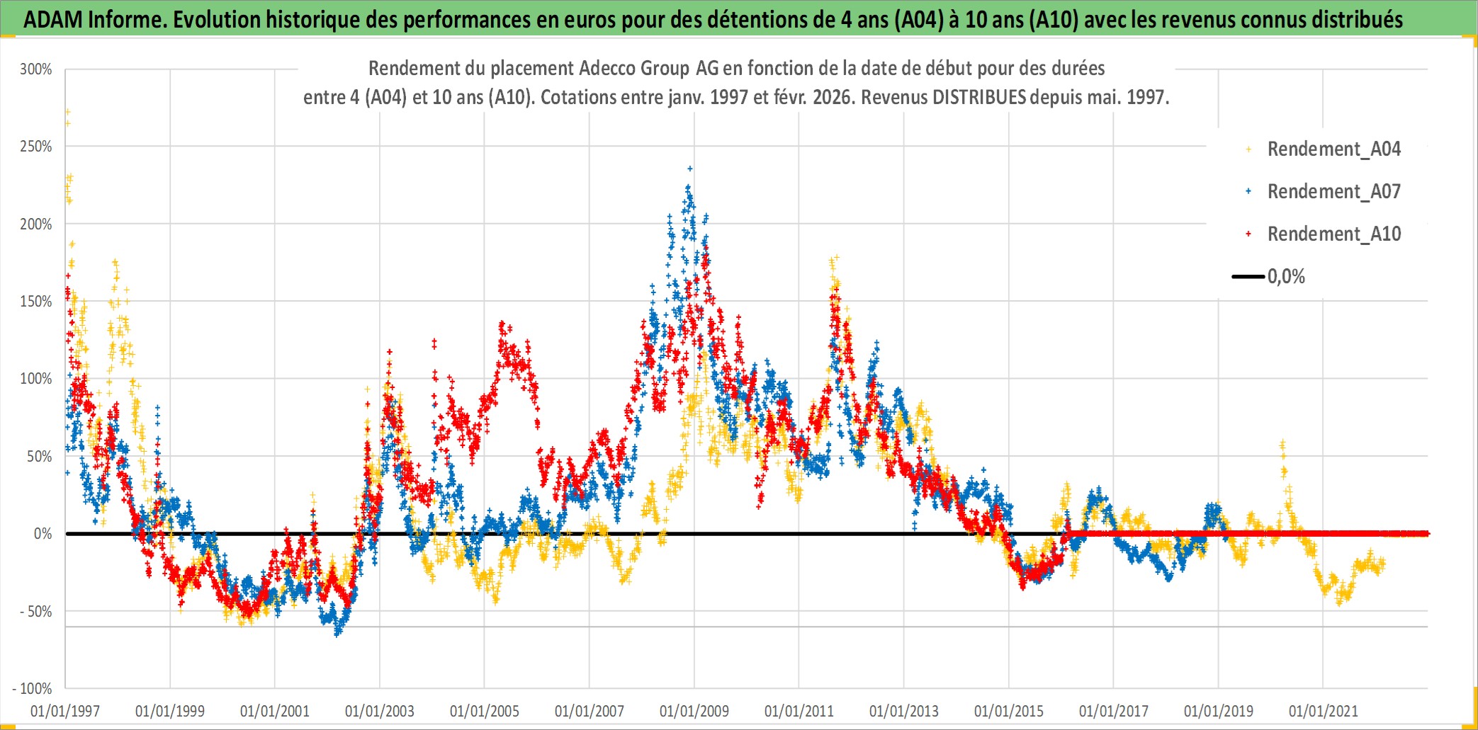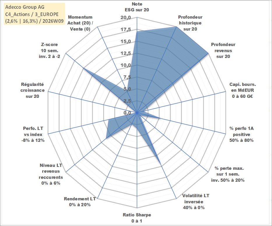 Site dédié aux investisseursPage dédiée sur site financeAnalyse des valorisations hebdomadaires de l'action Adecco Group AG. Cet actif est cote en CHF. Les valorisations sont en contrevaleur EURO et couvrent les semaines 1997W01 a 2026W09. Les revenus de cet actif financier sont pris en compte depuis la semaine 1997W22. La note globale ESG de cet actif est estimee a 17.0 (apres rebasage entre 0 et 20).