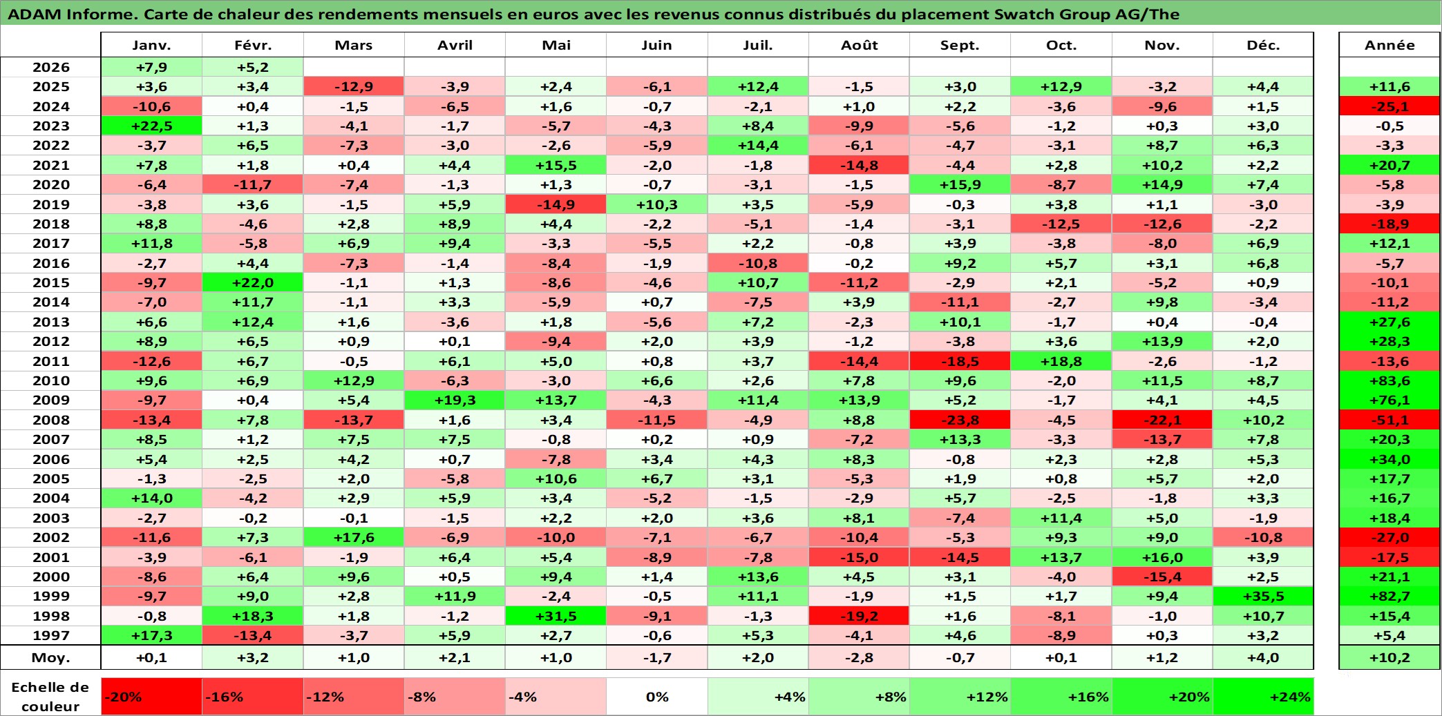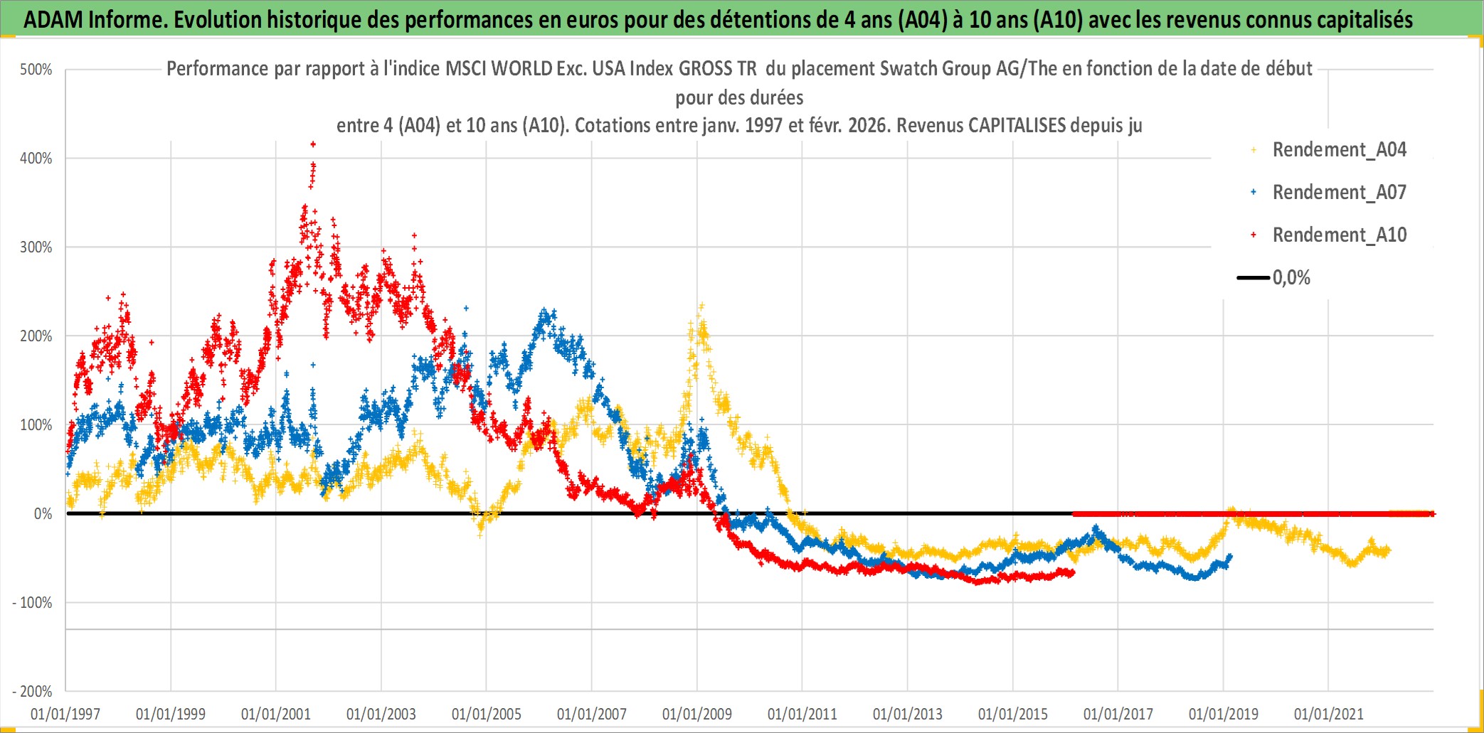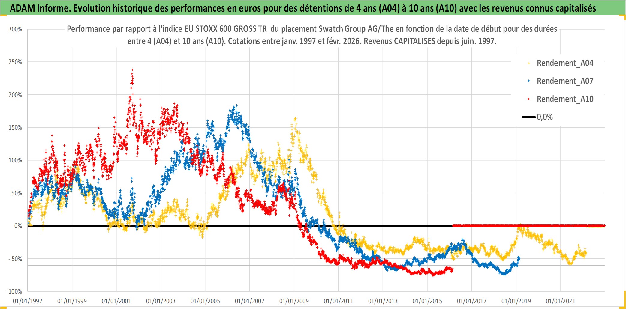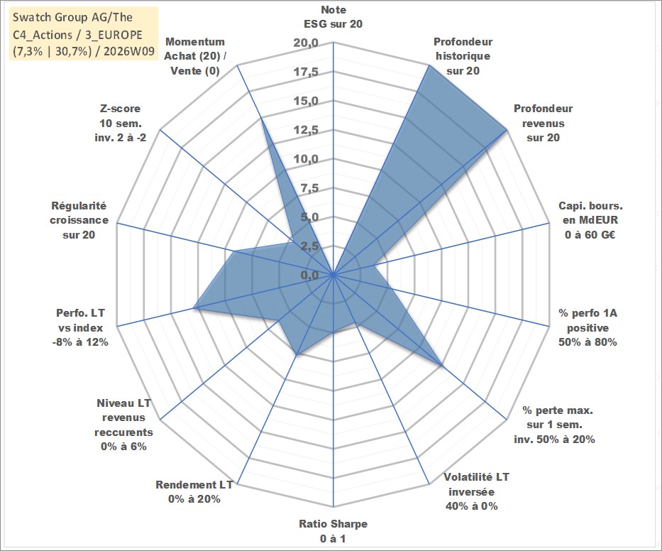 Site dédié aux investisseursPage dédiée sur site financeAnalyse des valorisations hebdomadaires de l'action Swatch Group AG/The. Cet actif est cote en CHF. Les valorisations sont en contrevaleur EURO et couvrent les semaines 1997W01 a 2026W09. Les revenus de cet actif financier sont pris en compte depuis la semaine 1997W26. La note ESG de cet actif n'est pas connue.