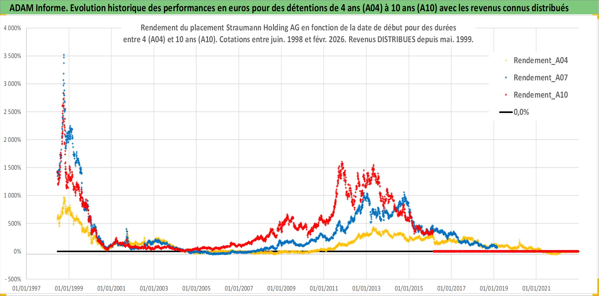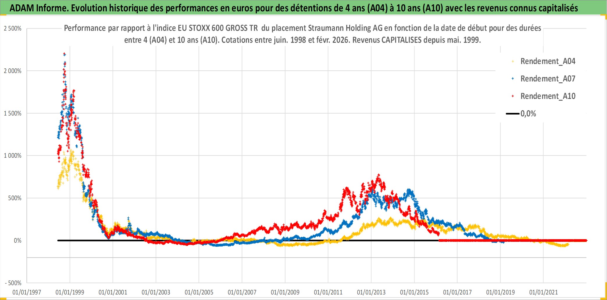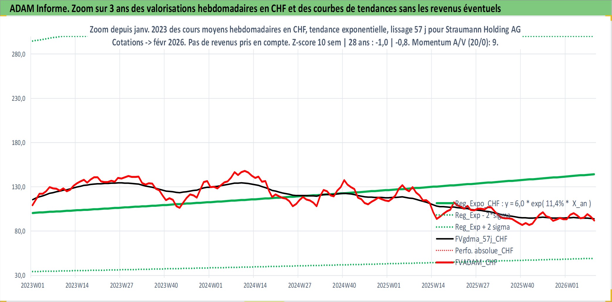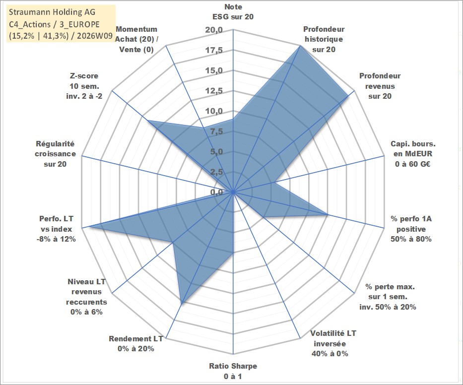 Site dédié aux investisseursPage dédiée sur site financeAnalyse des valorisations hebdomadaires de l'action Straumann Holding AG. Cet actif est cote en CHF. Les valorisations sont en contrevaleur EURO et couvrent les semaines 1998W23 a 2026W09. Les revenus de cet actif financier sont pris en compte depuis la semaine 1999W21. La note globale ESG de cet actif est estimee a 9.0 (apres rebasage entre 0 et 20).