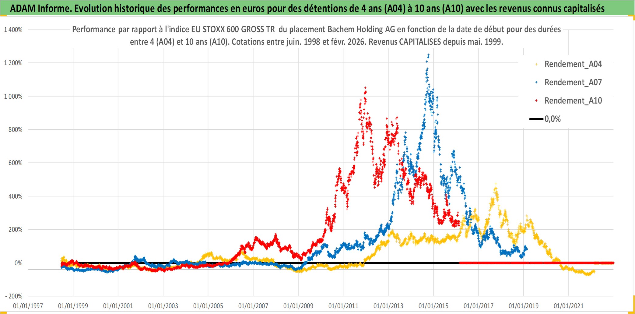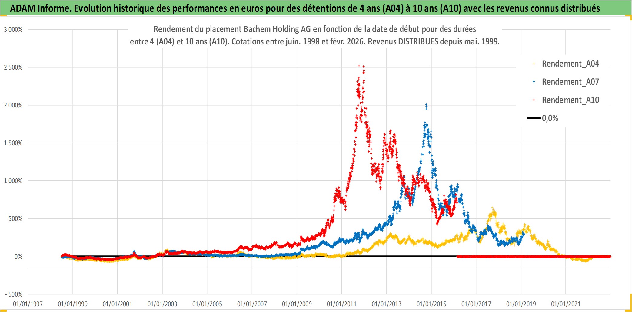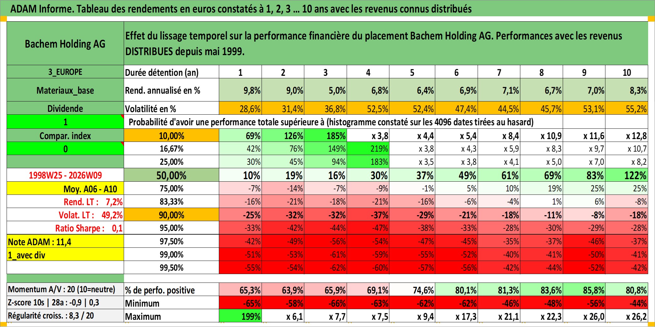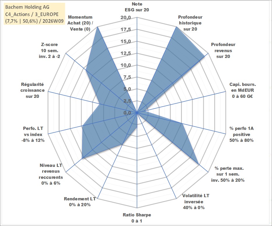 Site dédié aux investisseursPage dédiée sur site financeAnalyse des valorisations hebdomadaires de l'action Bachem Holding AG. Cet actif est cote en CHF. Les valorisations sont en contrevaleur EURO et couvrent les semaines 1998W25 a 2026W09. Les revenus de cet actif financier sont pris en compte depuis la semaine 1999W18. La note ESG de cet actif n'est pas connue.