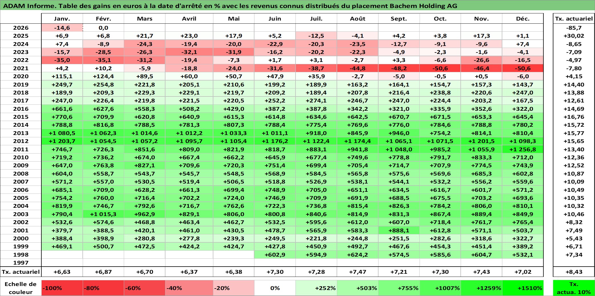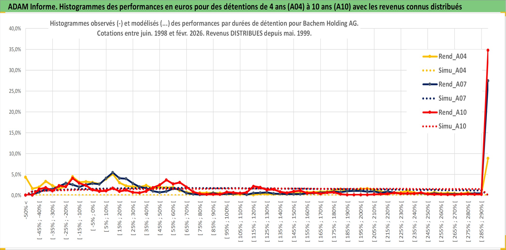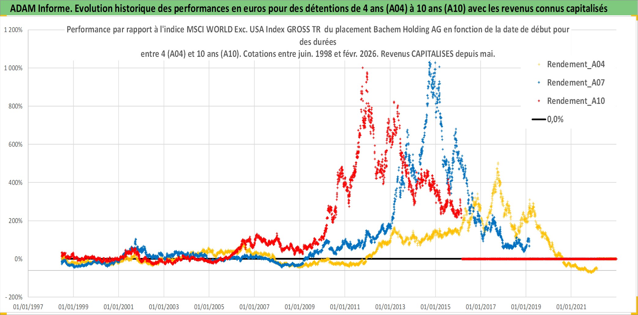 Site dédié aux investisseursPage dédiée sur site financeAnalyse des valorisations hebdomadaires de l'action Bachem Holding AG. Cet actif est cote en CHF. Les valorisations sont en contrevaleur EURO et couvrent les semaines 1998W25 a 2026W09. Les revenus de cet actif financier sont pris en compte depuis la semaine 1999W18. La note ESG de cet actif n'est pas connue.
