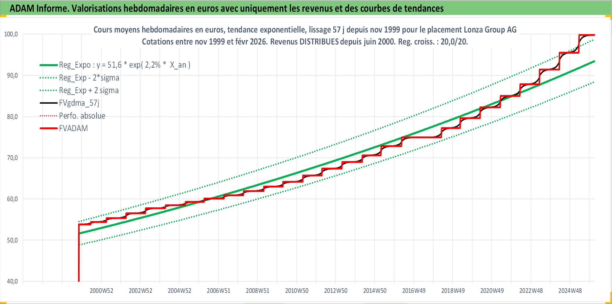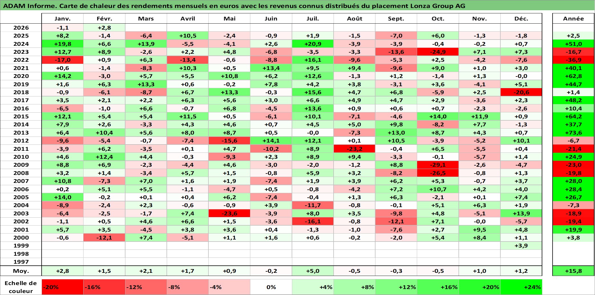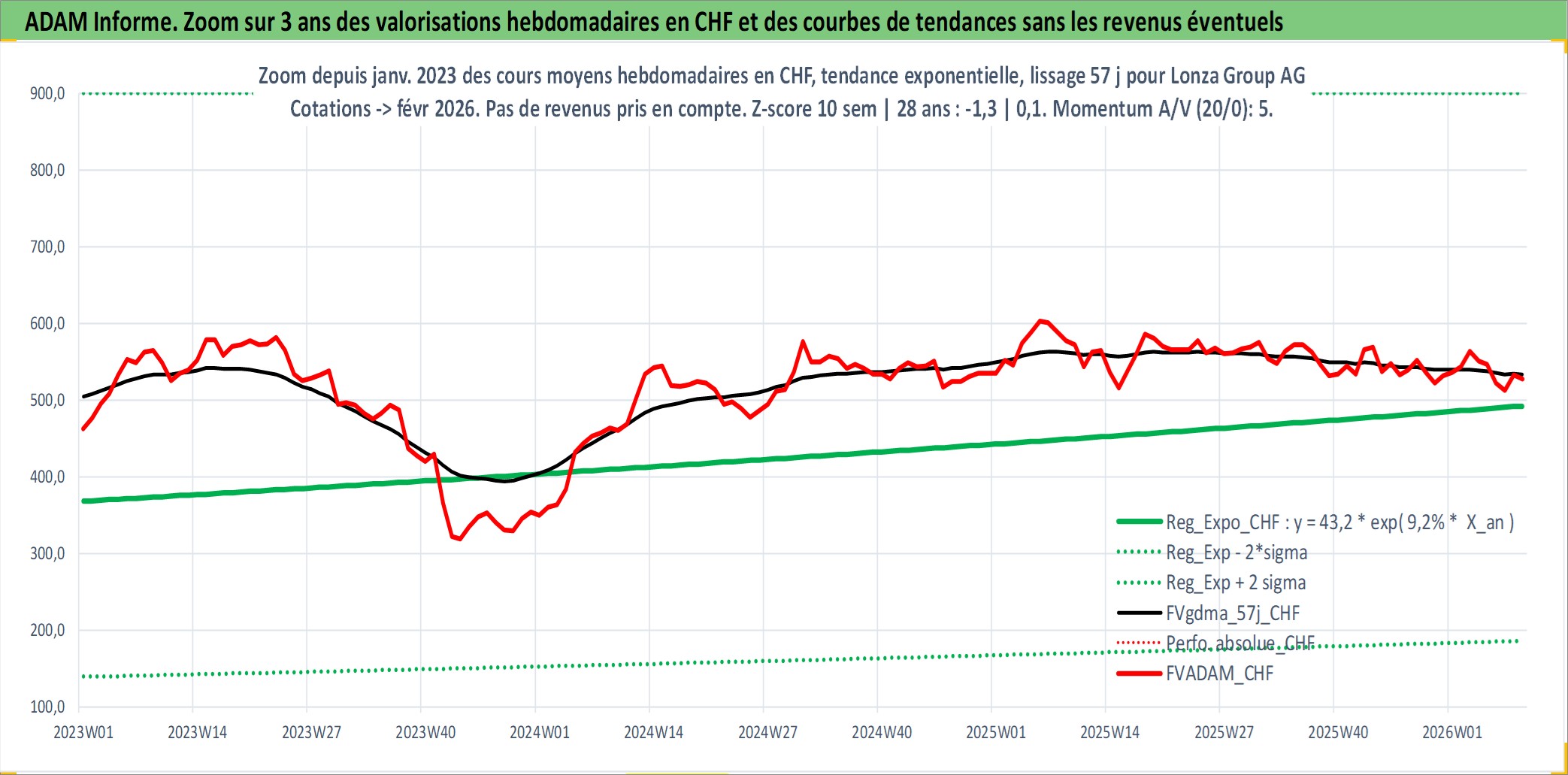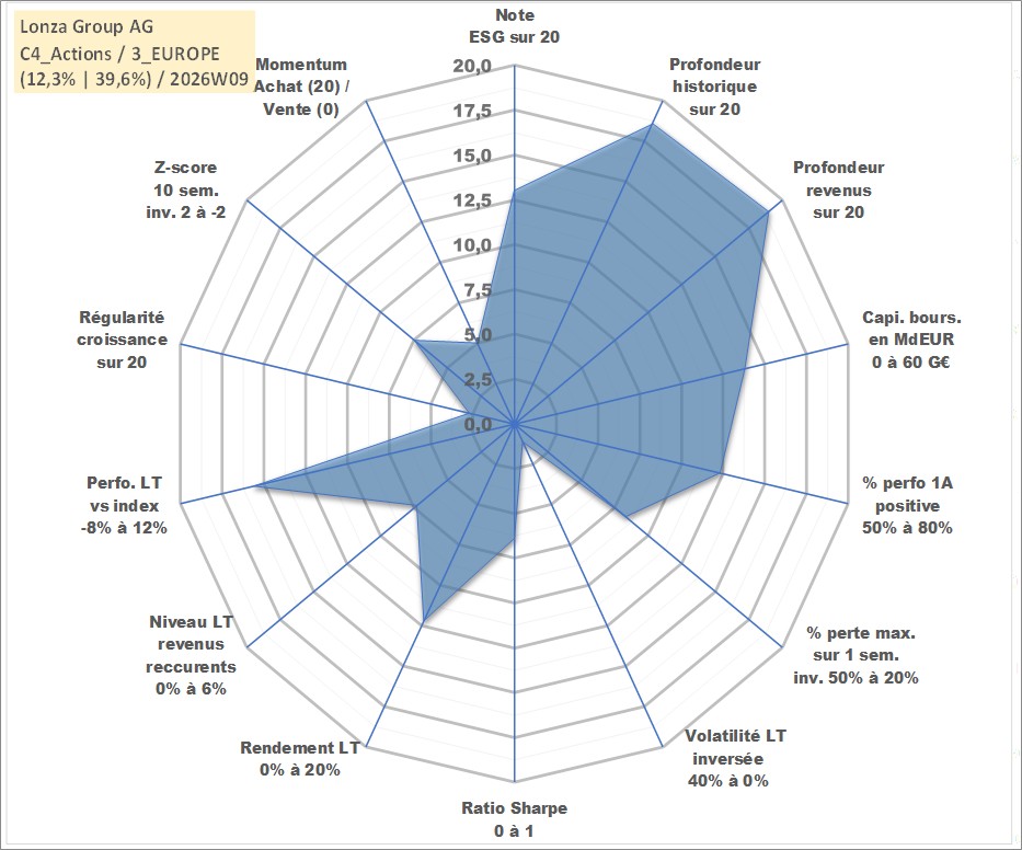 Site dédié aux investisseursPage dédiée sur site financeAnalyse des valorisations hebdomadaires de l'action Lonza Group AG. Cet actif est cote en CHF. Les valorisations sont en contrevaleur EURO et couvrent les semaines 1999W44 a 2026W09. Les revenus de cet actif financier sont pris en compte depuis la semaine 2000W24. La note globale ESG de cet actif est estimee a 13.0 (apres rebasage entre 0 et 20).