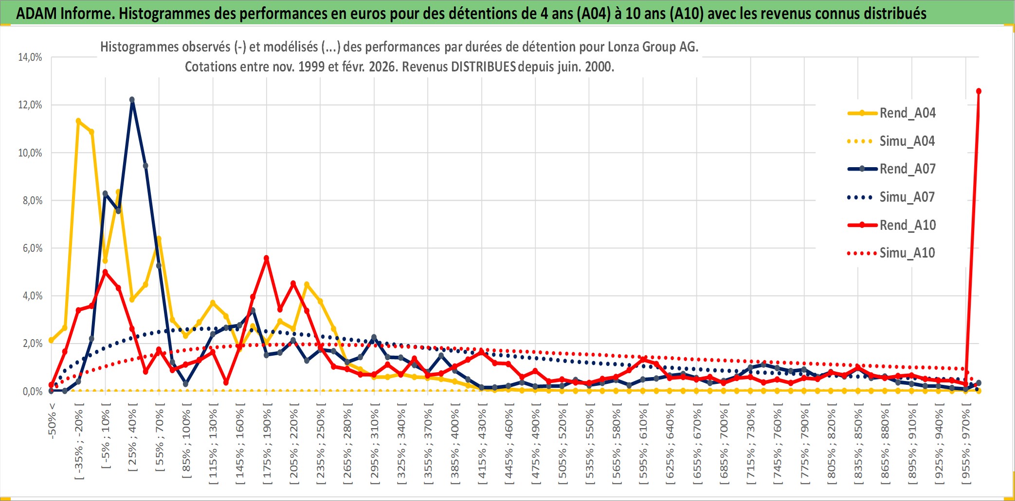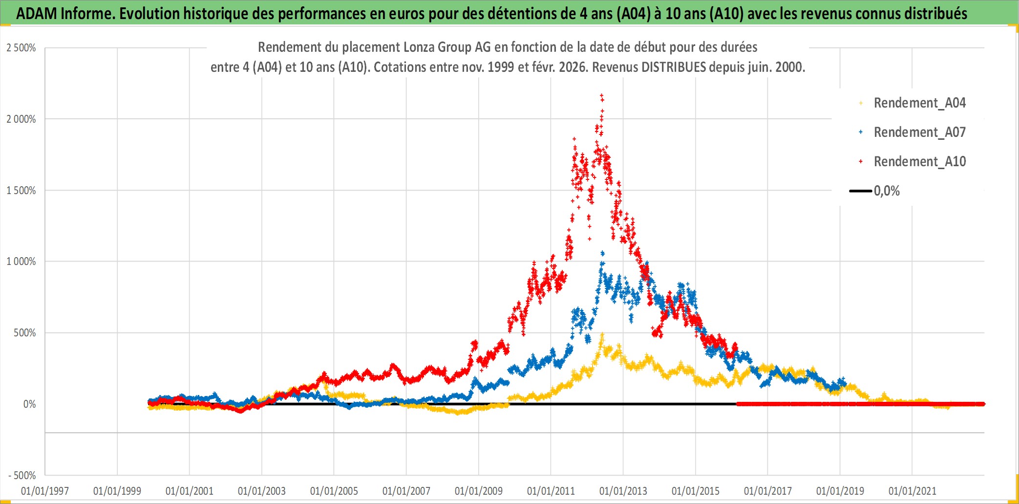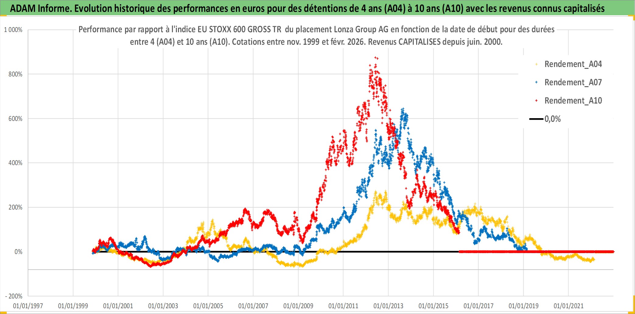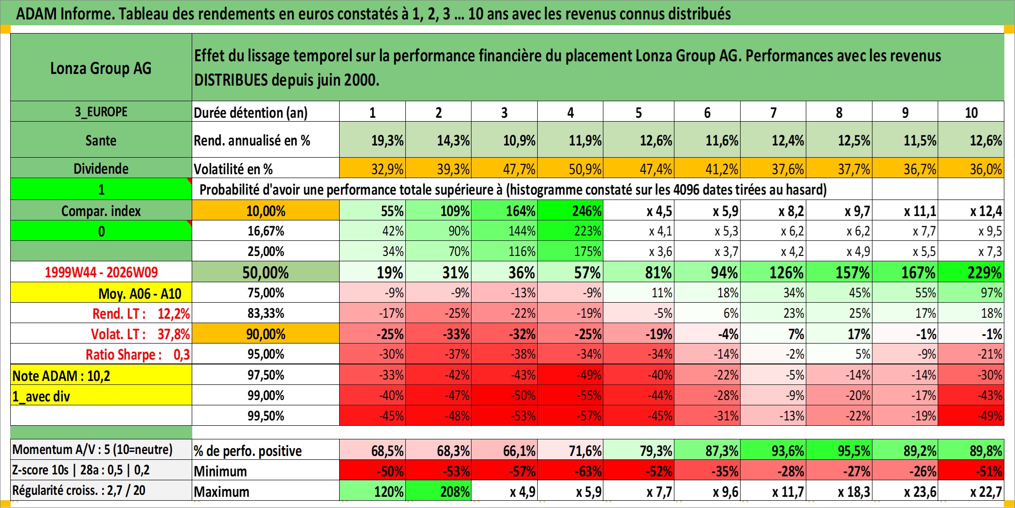 Site dédié aux investisseursPage dédiée sur site financeAnalyse des valorisations hebdomadaires de l'action Lonza Group AG. Cet actif est cote en CHF. Les valorisations sont en contrevaleur EURO et couvrent les semaines 1999W44 a 2026W09. Les revenus de cet actif financier sont pris en compte depuis la semaine 2000W24. La note globale ESG de cet actif est estimee a 13.0 (apres rebasage entre 0 et 20).