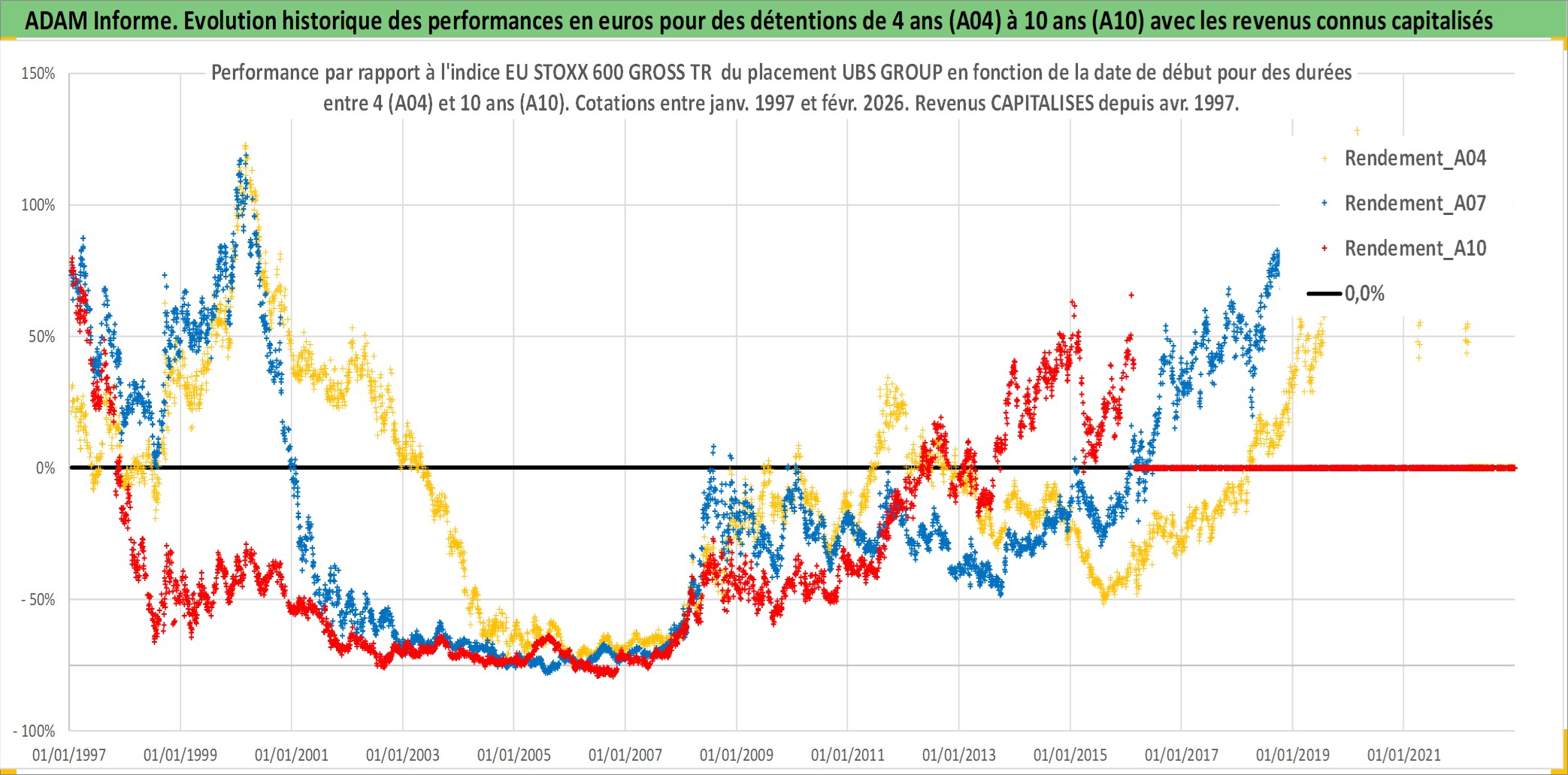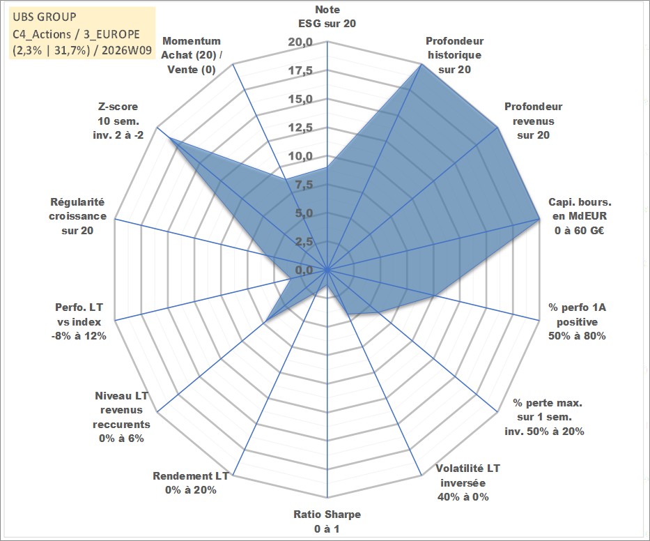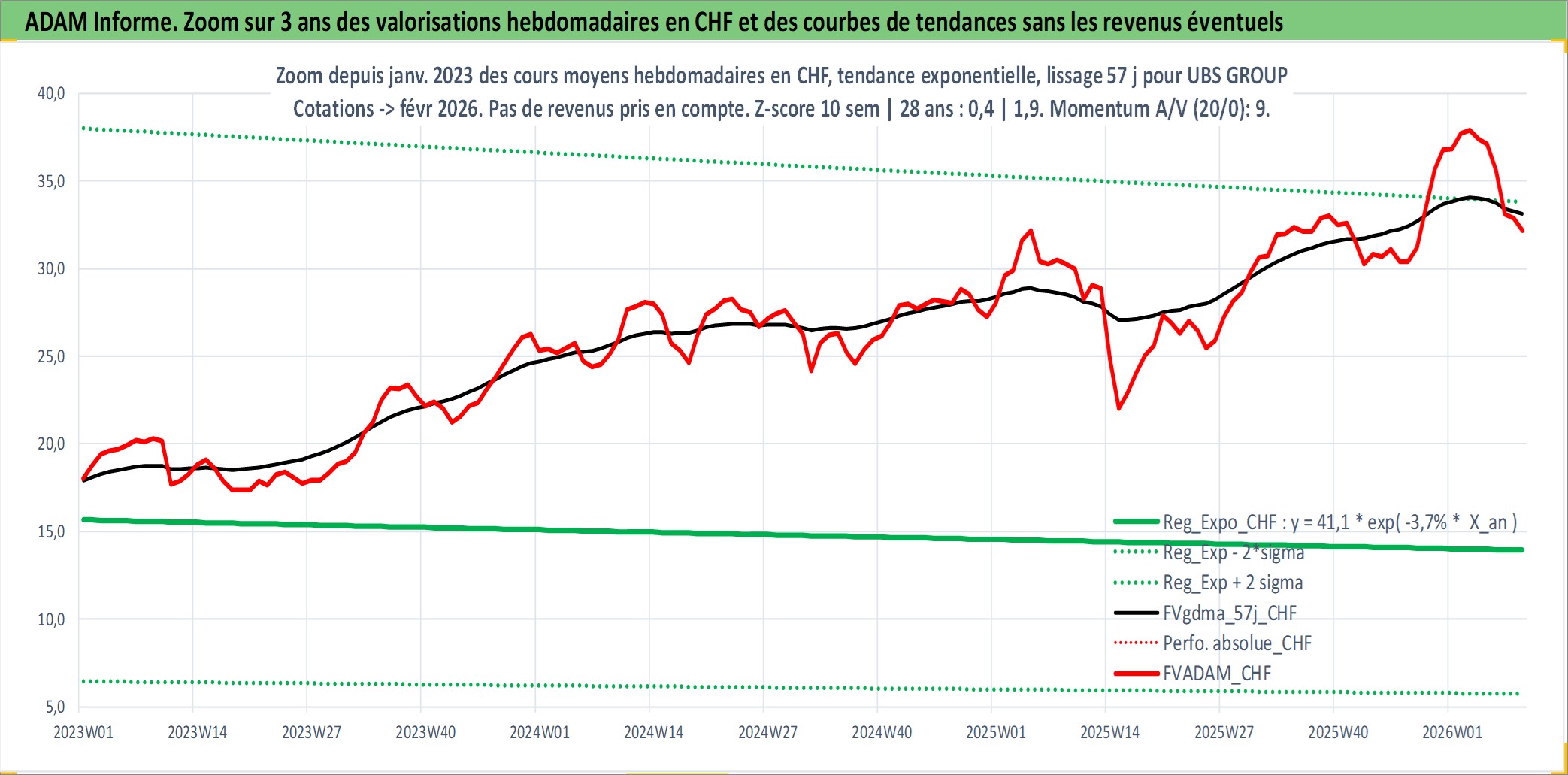 Site dédié aux investisseursPage dédiée sur site financeAnalyse des valorisations hebdomadaires de l'action UBS GROUP. Cet actif est cote en CHF. Les valorisations sont en contrevaleur EURO et couvrent les semaines 1997W01 a 2026W09. Les revenus de cet actif financier sont pris en compte depuis la semaine 1997W17. La note globale ESG de cet actif est estimee a 9.0 (apres rebasage entre 0 et 20).