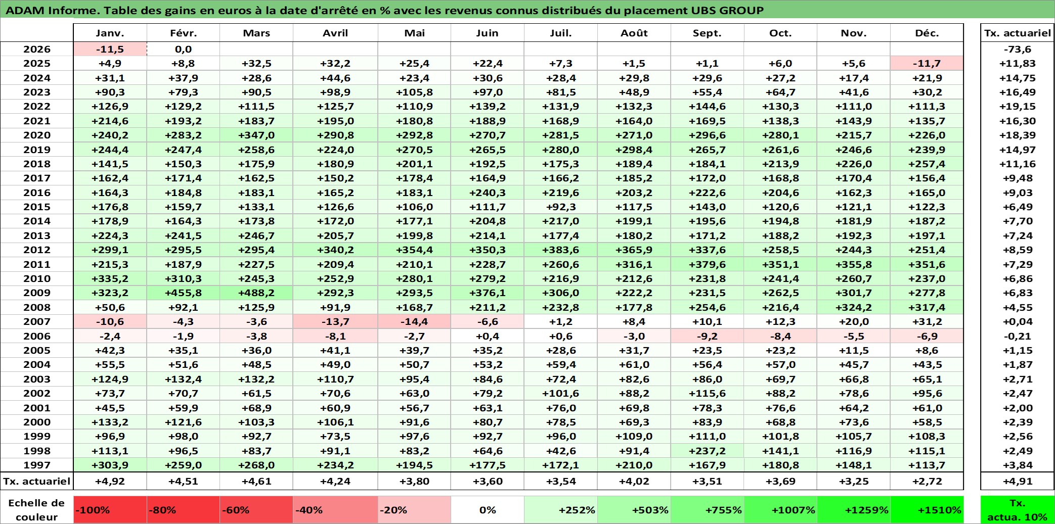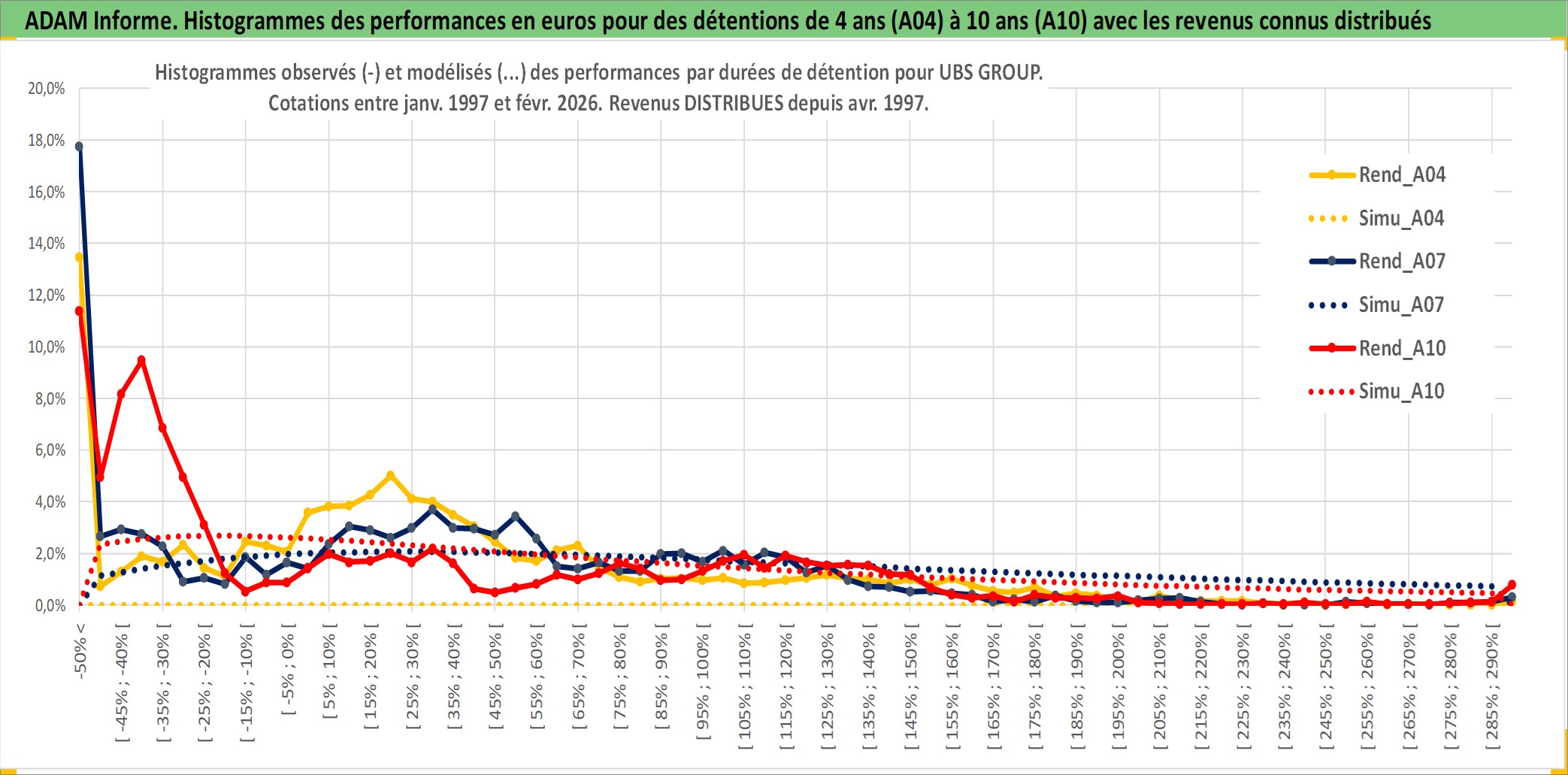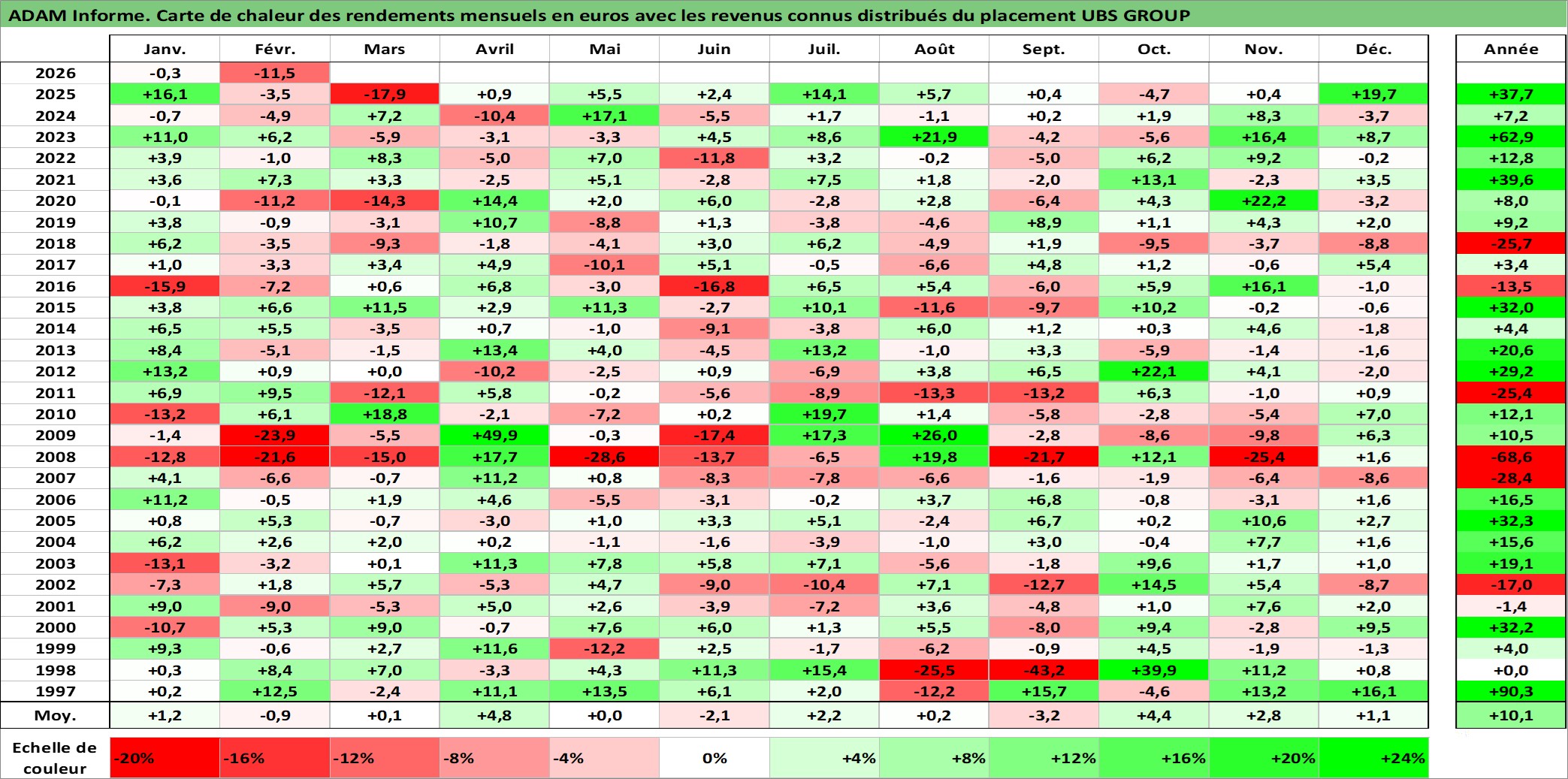 Site dédié aux investisseursPage dédiée sur site financeAnalyse des valorisations hebdomadaires de l'action UBS GROUP. Cet actif est cote en CHF. Les valorisations sont en contrevaleur EURO et couvrent les semaines 1997W01 a 2026W09. Les revenus de cet actif financier sont pris en compte depuis la semaine 1997W17. La note globale ESG de cet actif est estimee a 9.0 (apres rebasage entre 0 et 20).