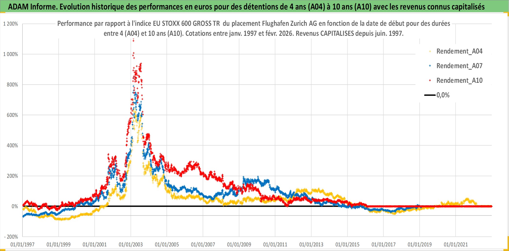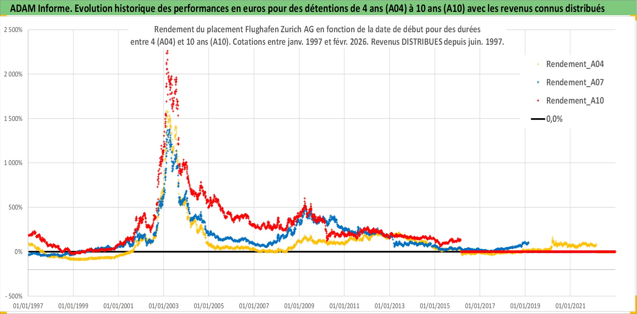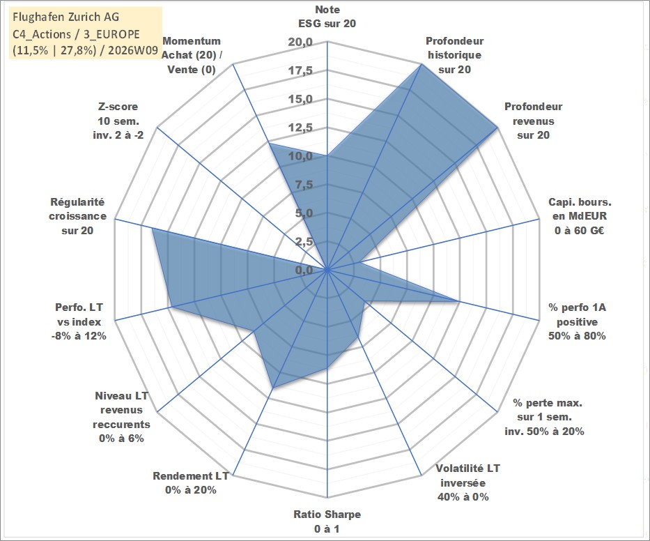 Site dédié aux investisseursPage dédiée sur site financeAnalyse des valorisations hebdomadaires de l'action Flughafen Zurich AG. Cet actif est cote en CHF. Les valorisations sont en contrevaleur EURO et couvrent les semaines 1997W01 a 2026W09. Les revenus de cet actif financier sont pris en compte depuis la semaine 1997W23. La note globale ESG de cet actif est estimee a 10.0 (apres rebasage entre 0 et 20).