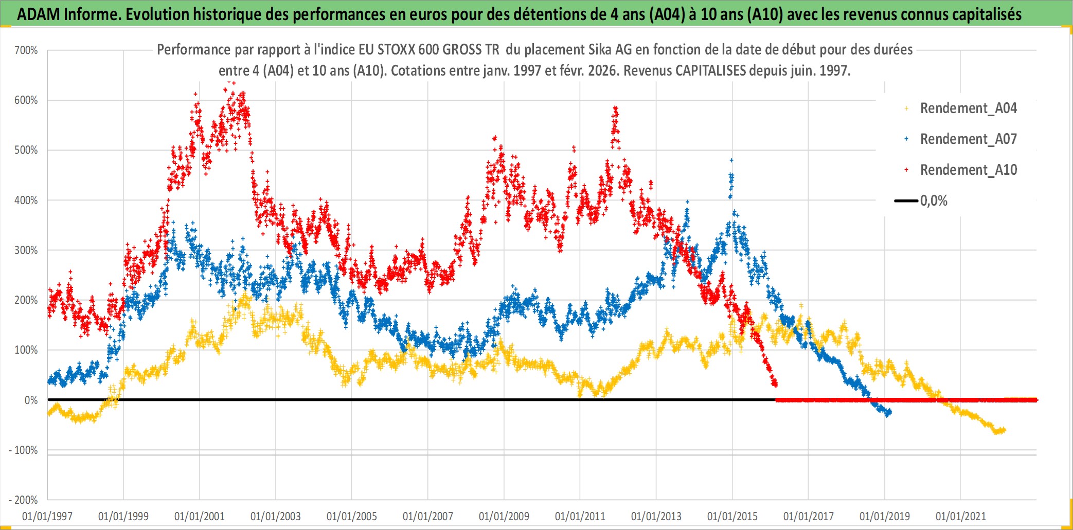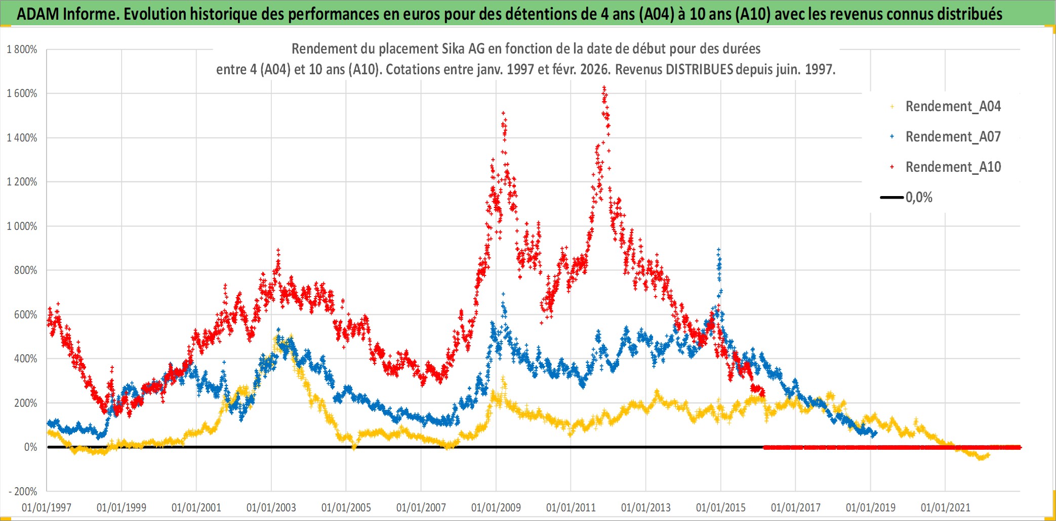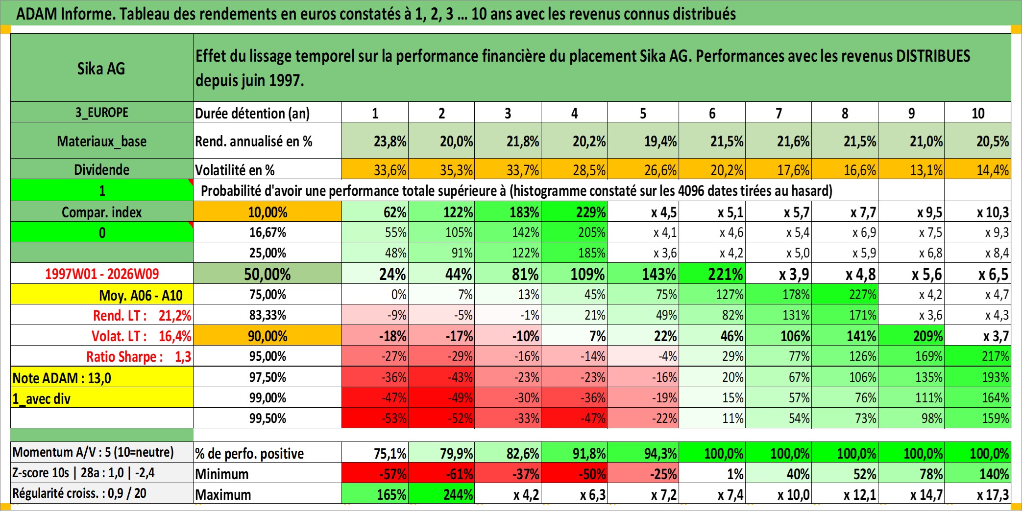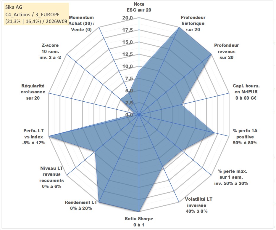 Site dédié aux investisseursPage dédiée sur site financeAnalyse des valorisations hebdomadaires de l'action Sika AG. Cet actif est cote en CHF. Les valorisations sont en contrevaleur EURO et couvrent les semaines 1997W01 a 2026W09. Les revenus de cet actif financier sont pris en compte depuis la semaine 1997W23. La note globale ESG de cet actif est estimee a 9.0 (apres rebasage entre 0 et 20).