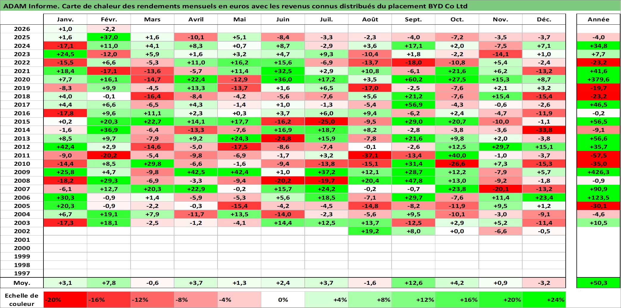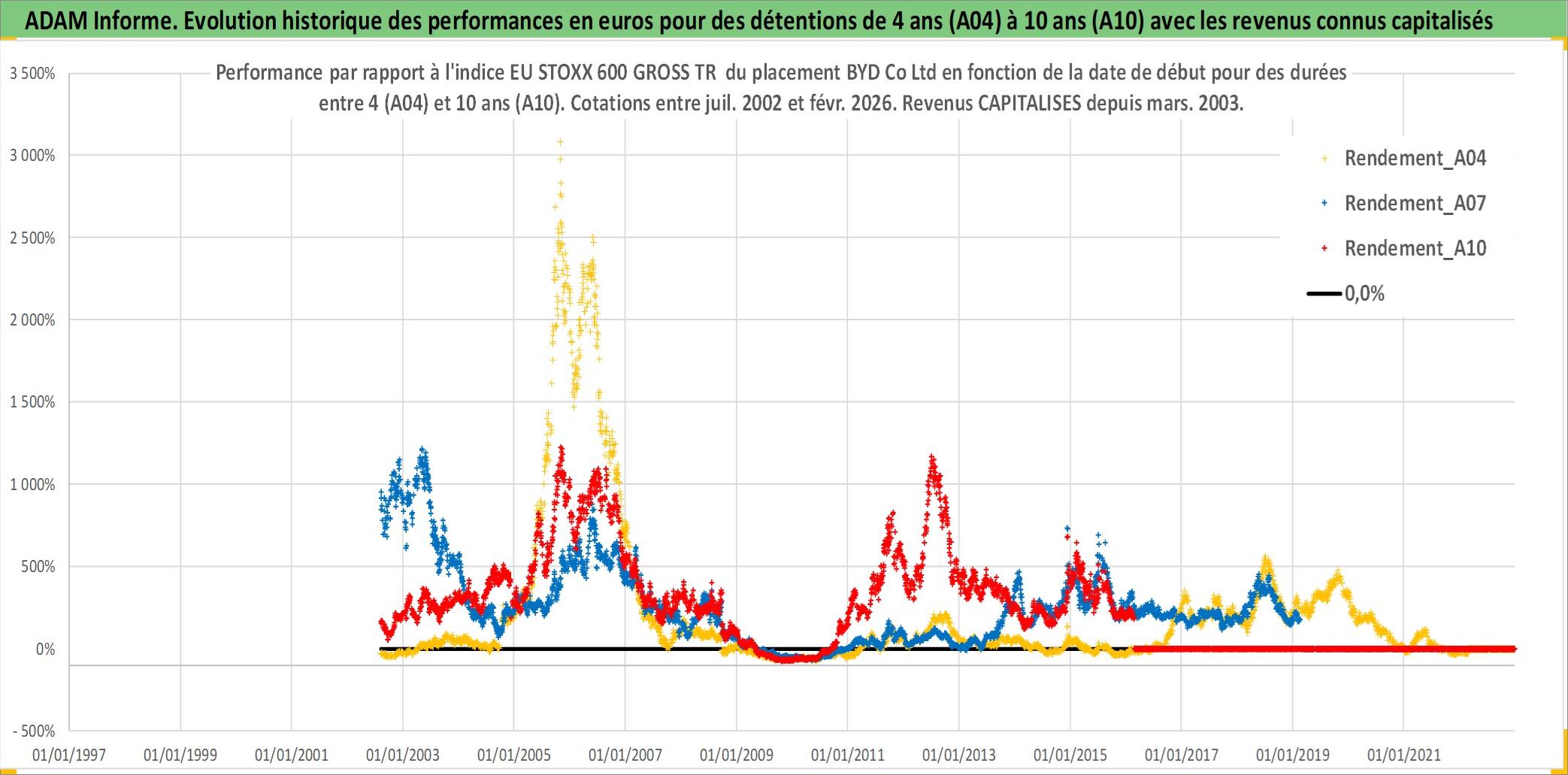Site dédié aux investisseursPage dédiée sur site financeAnalyse des valorisations hebdomadaires de l'action BYD Co Ltd. Cet actif est cote en HKD. Les valorisations sont en contrevaleur EURO et couvrent les semaines 2002W31 a 2026W09. Les revenus de cet actif financier sont pris en compte depuis la semaine 2003W10. La note globale ESG de cet actif est estimee a 8.0 (apres rebasage entre 0 et 20).