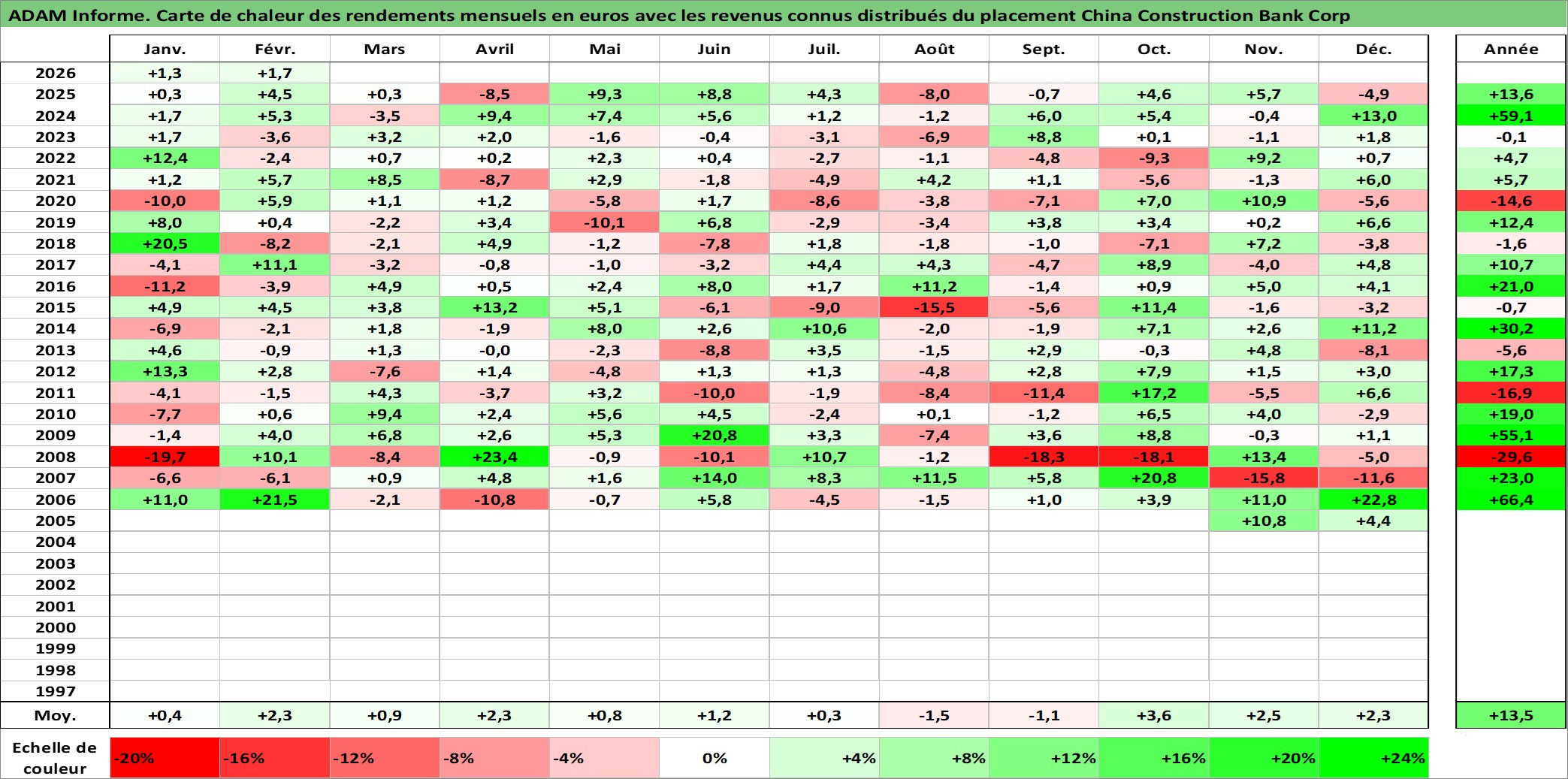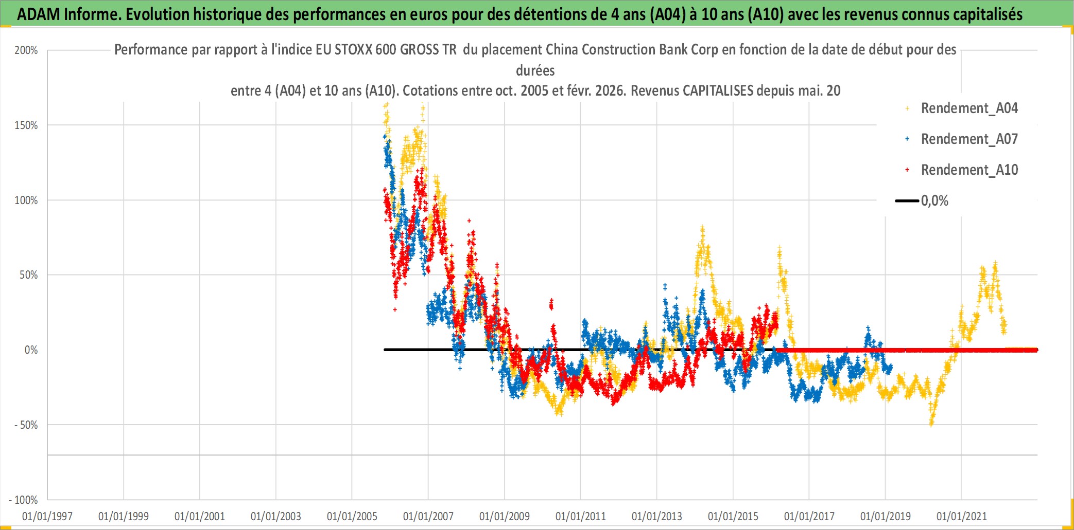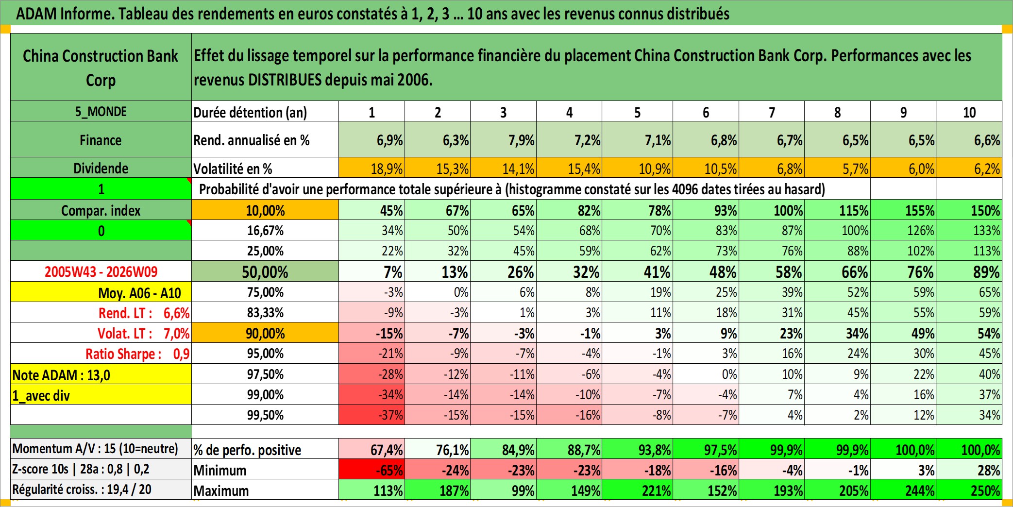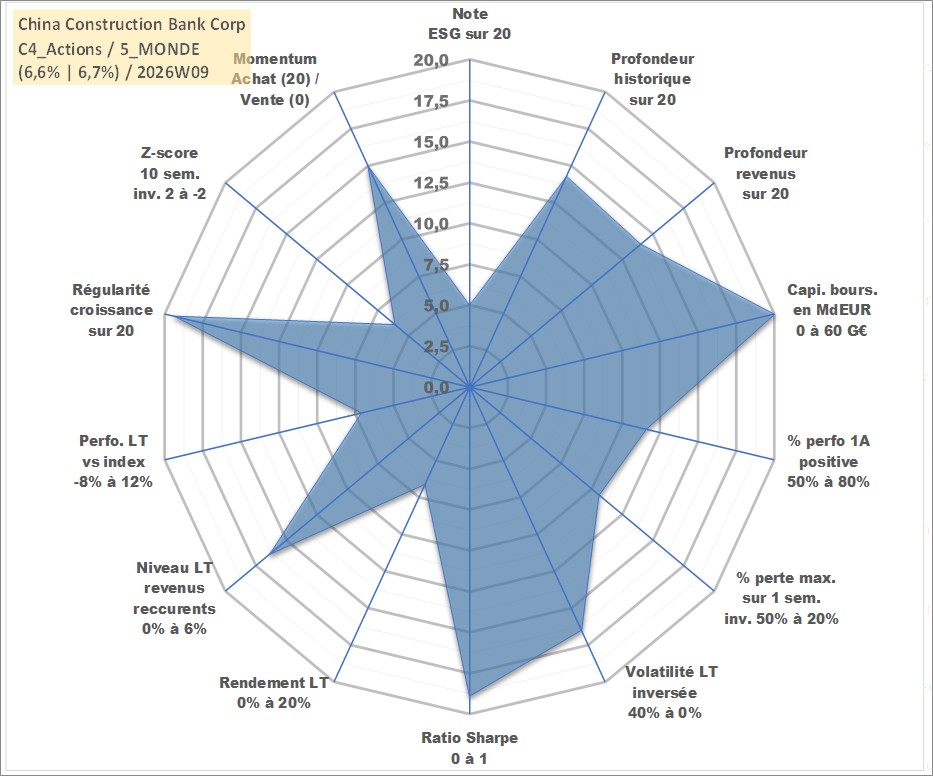 Site dédié aux investisseursPage dédiée sur site financeAnalyse des valorisations hebdomadaires de l'action China Construction Bank Corp. Cet actif est cote en HKD. Les valorisations sont en contrevaleur EURO et couvrent les semaines 2005W43 a 2026W09. Les revenus de cet actif financier sont pris en compte depuis la semaine 2006W19. La note globale ESG de cet actif est estimee a 5.0 (apres rebasage entre 0 et 20).