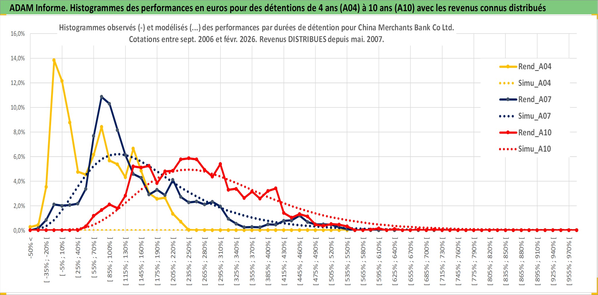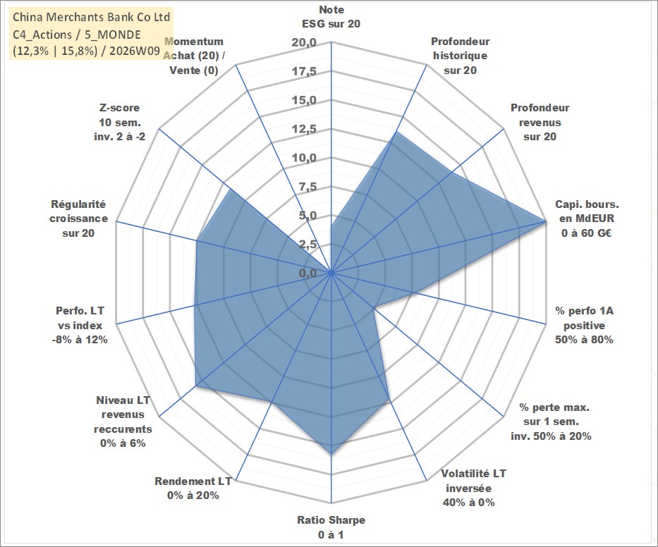 Site dédié aux investisseursPage dédiée sur site financeAnalyse des valorisations hebdomadaires de l'action China Merchants Bank Co Ltd. Cet actif est cote en HKD. Les valorisations sont en contrevaleur EURO et couvrent les semaines 2006W38 a 2026W09. Les revenus de cet actif financier sont pris en compte depuis la semaine 2007W20. La note globale ESG de cet actif est estimee a 4.0 (apres rebasage entre 0 et 20).