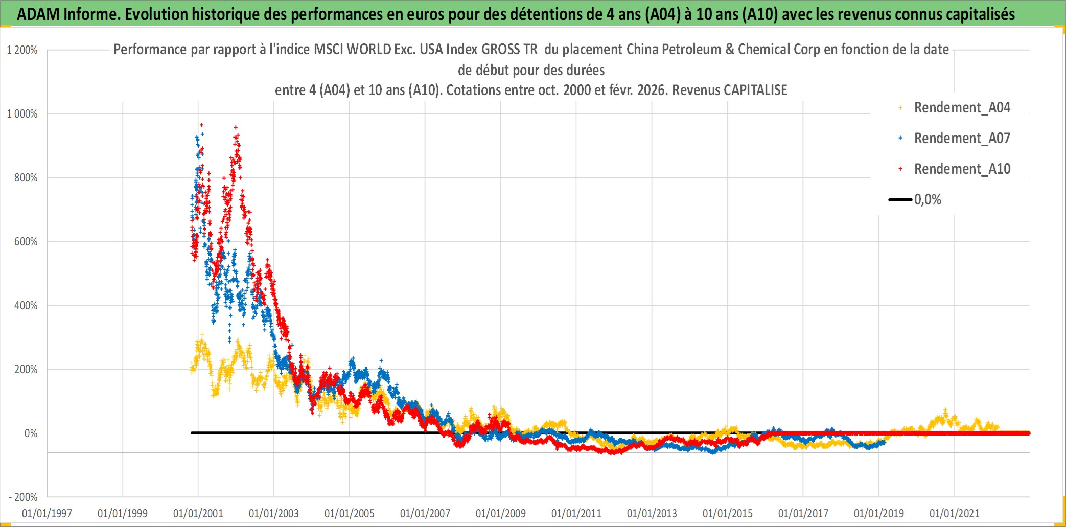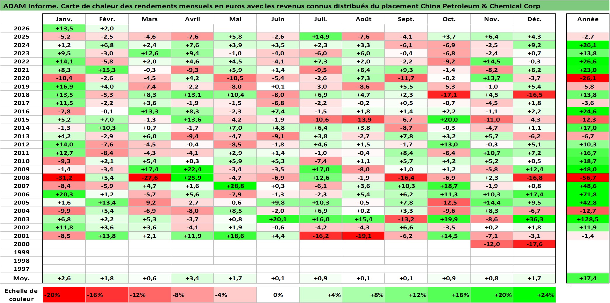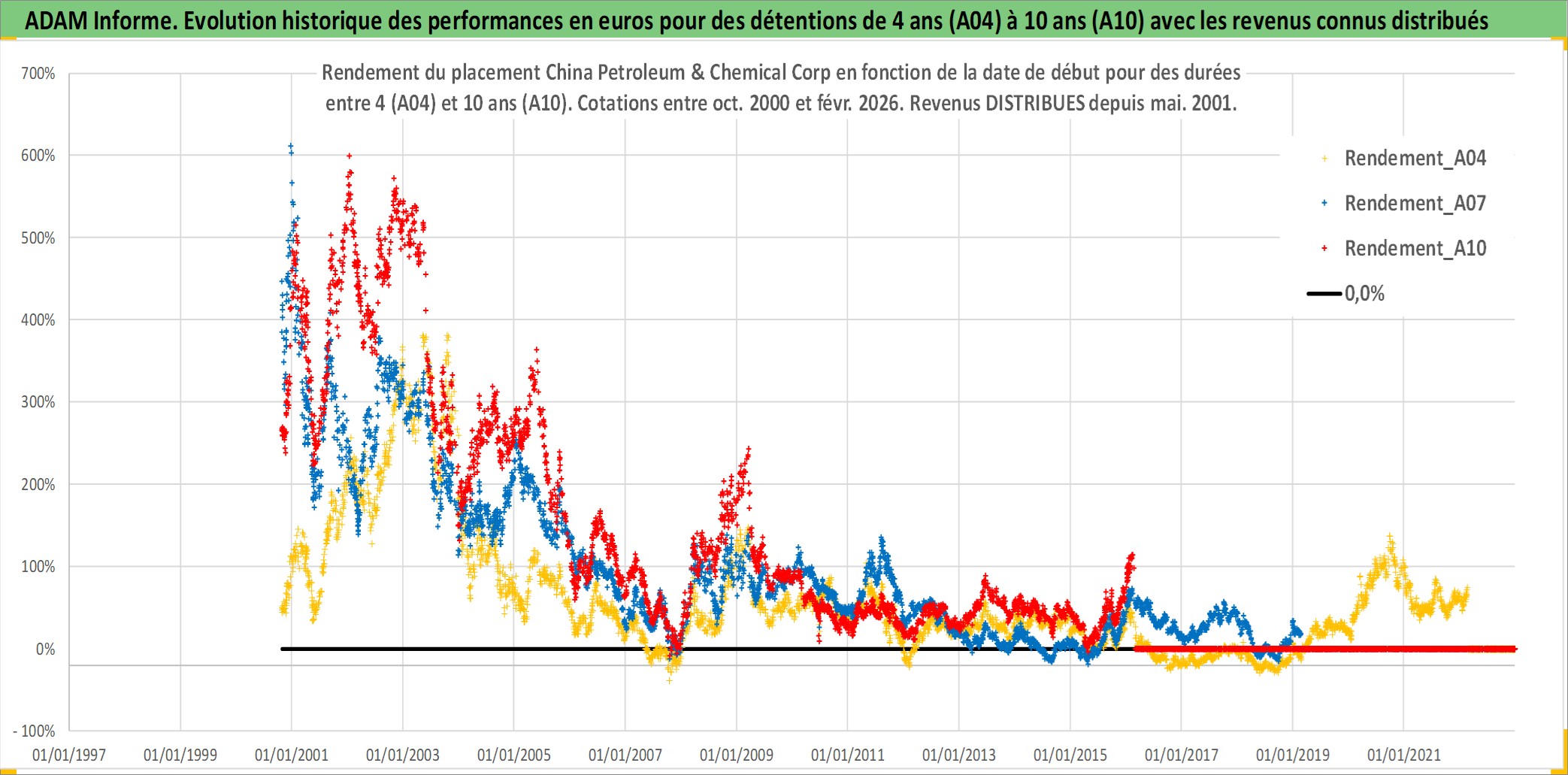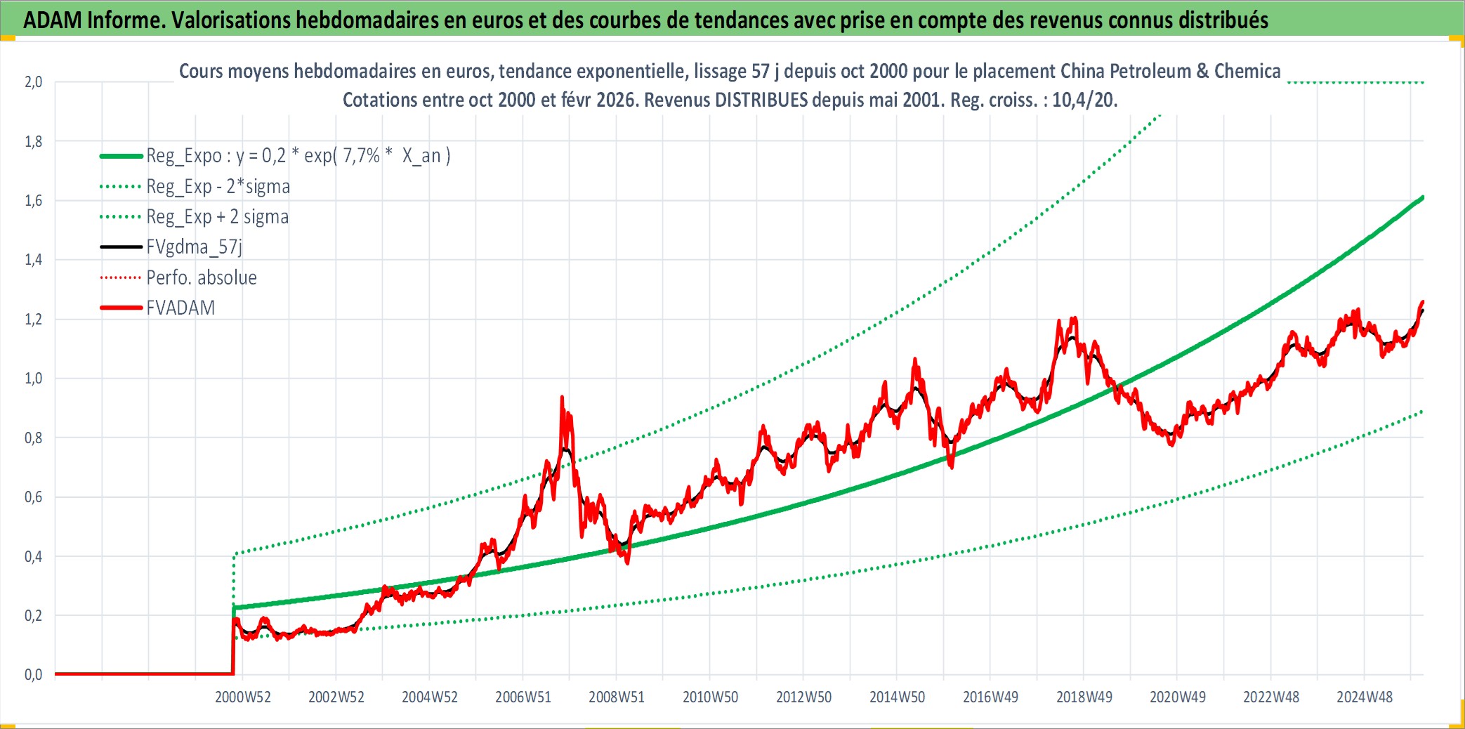 Site dédié aux investisseursPage dédiée sur site financeAnalyse des valorisations hebdomadaires de l'action China Petroleum & Chemical Corp. Cet actif est cote en HKD. Les valorisations sont en contrevaleur EURO et couvrent les semaines 2000W42 a 2026W09. Les revenus de cet actif financier sont pris en compte depuis la semaine 2001W18. La note ESG de cet actif n'est pas connue.