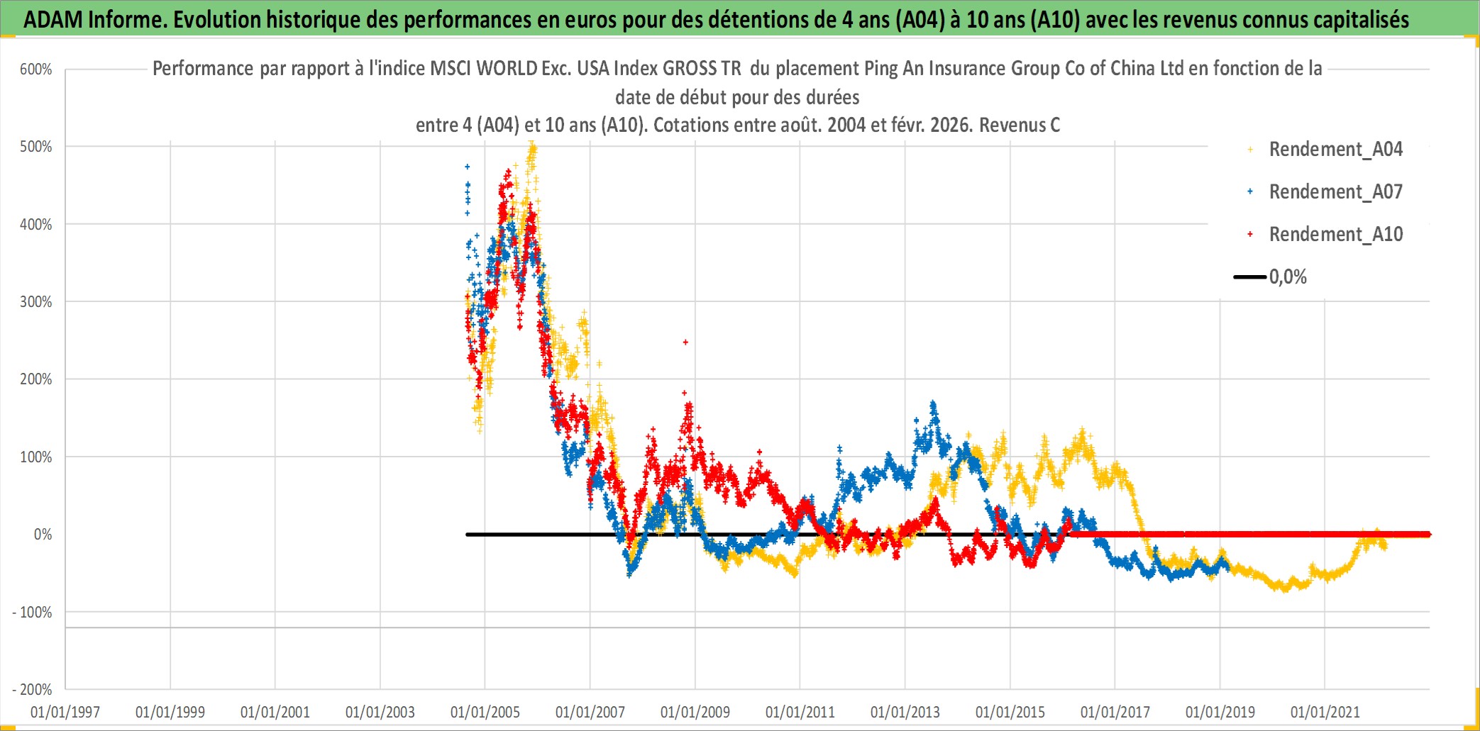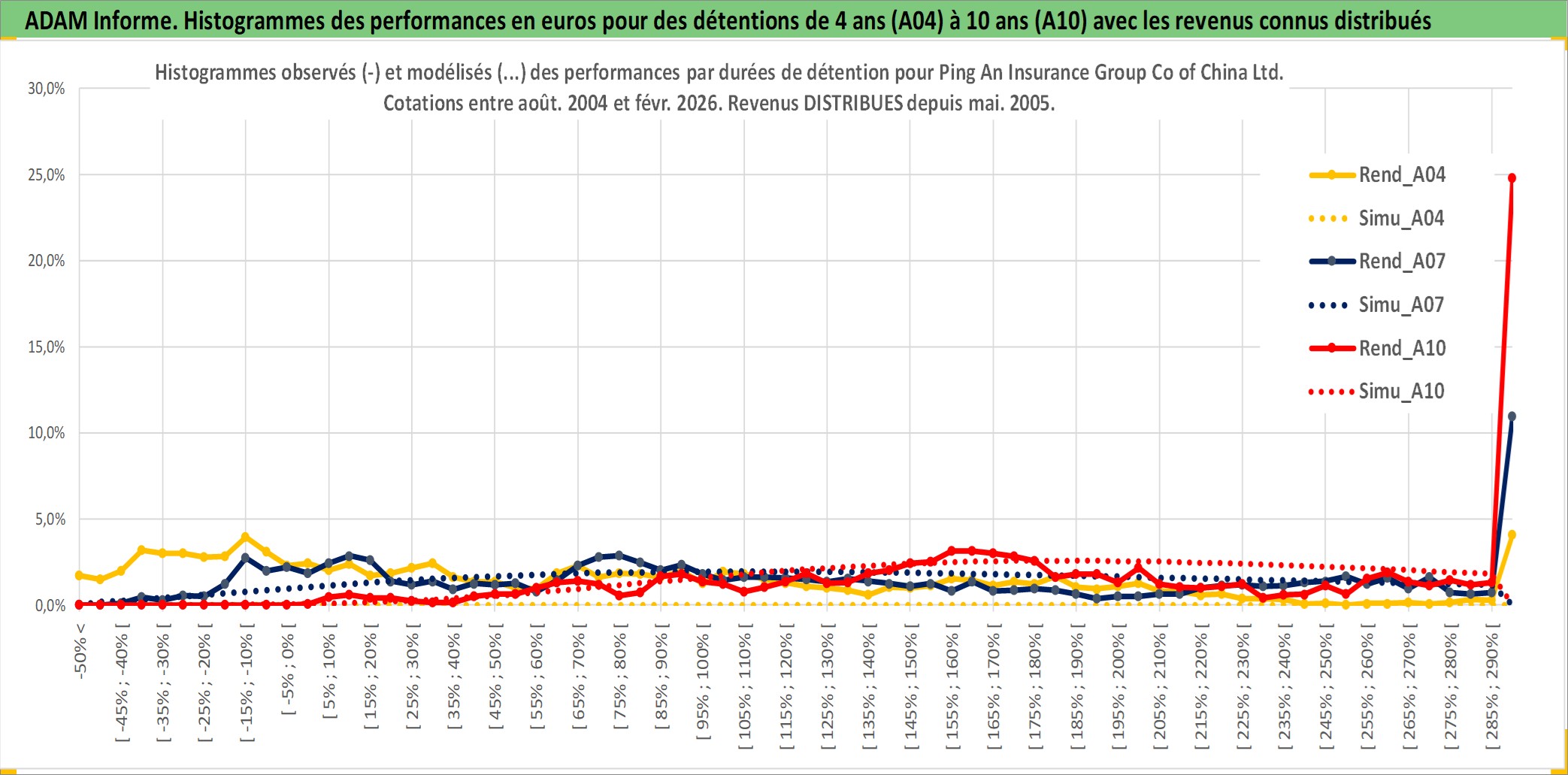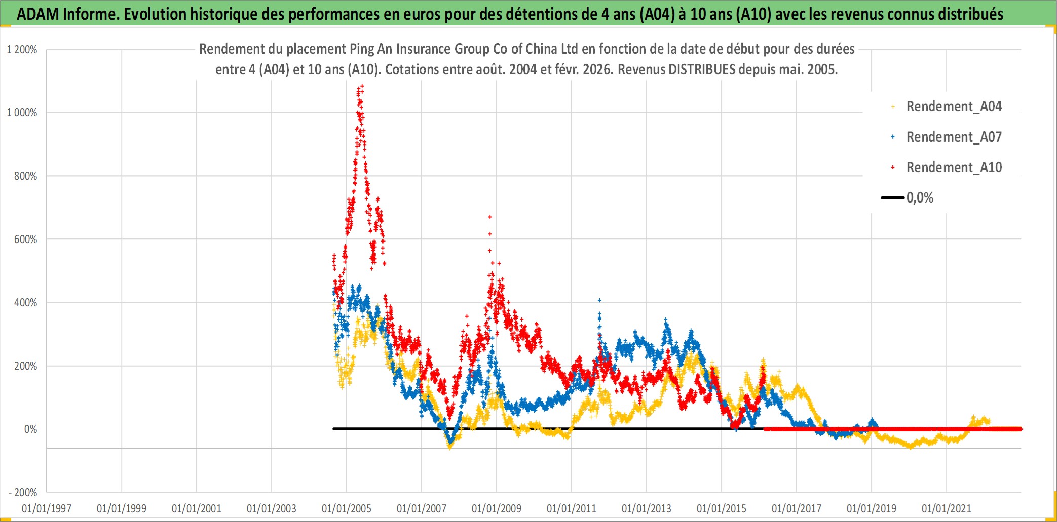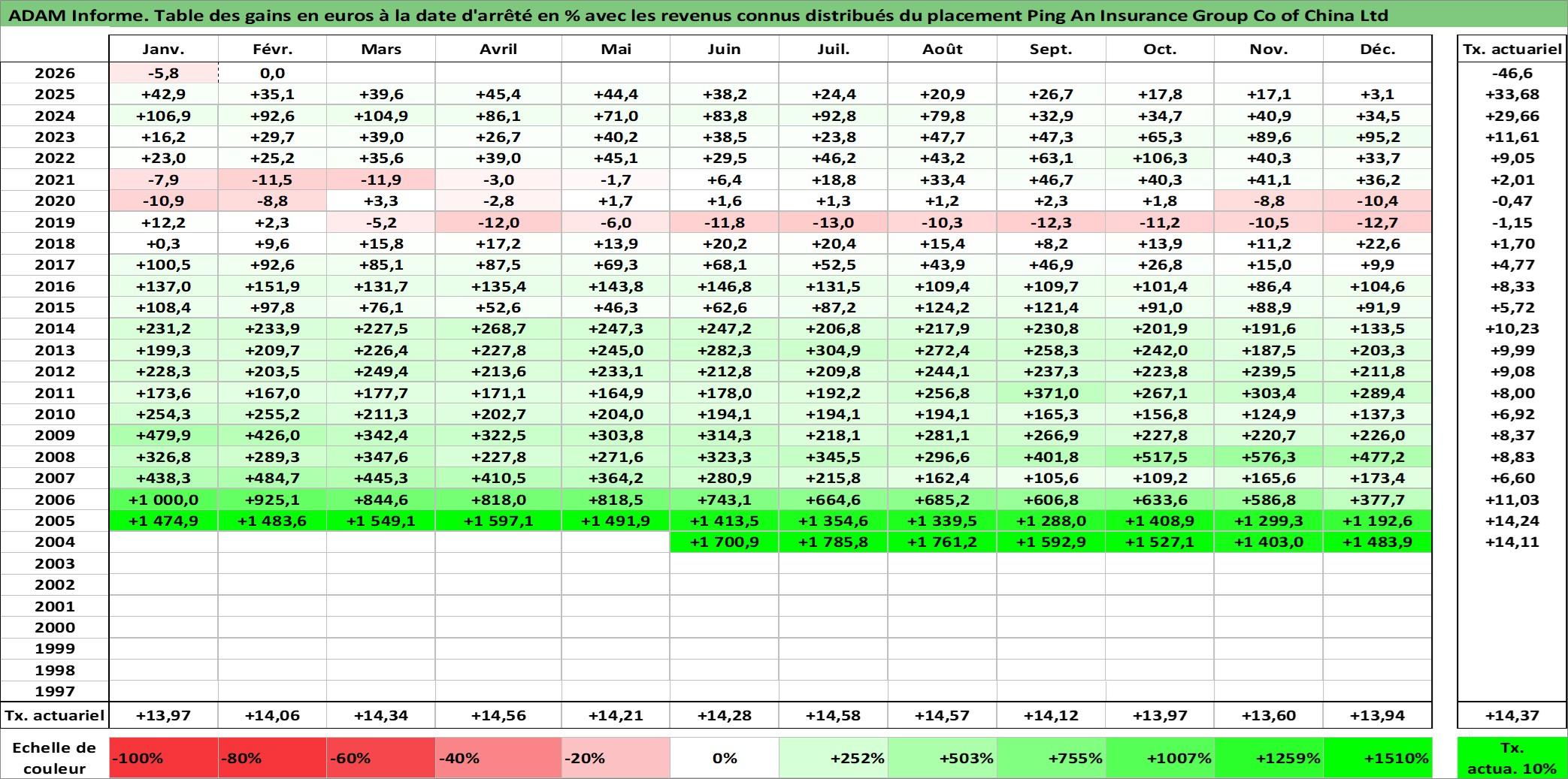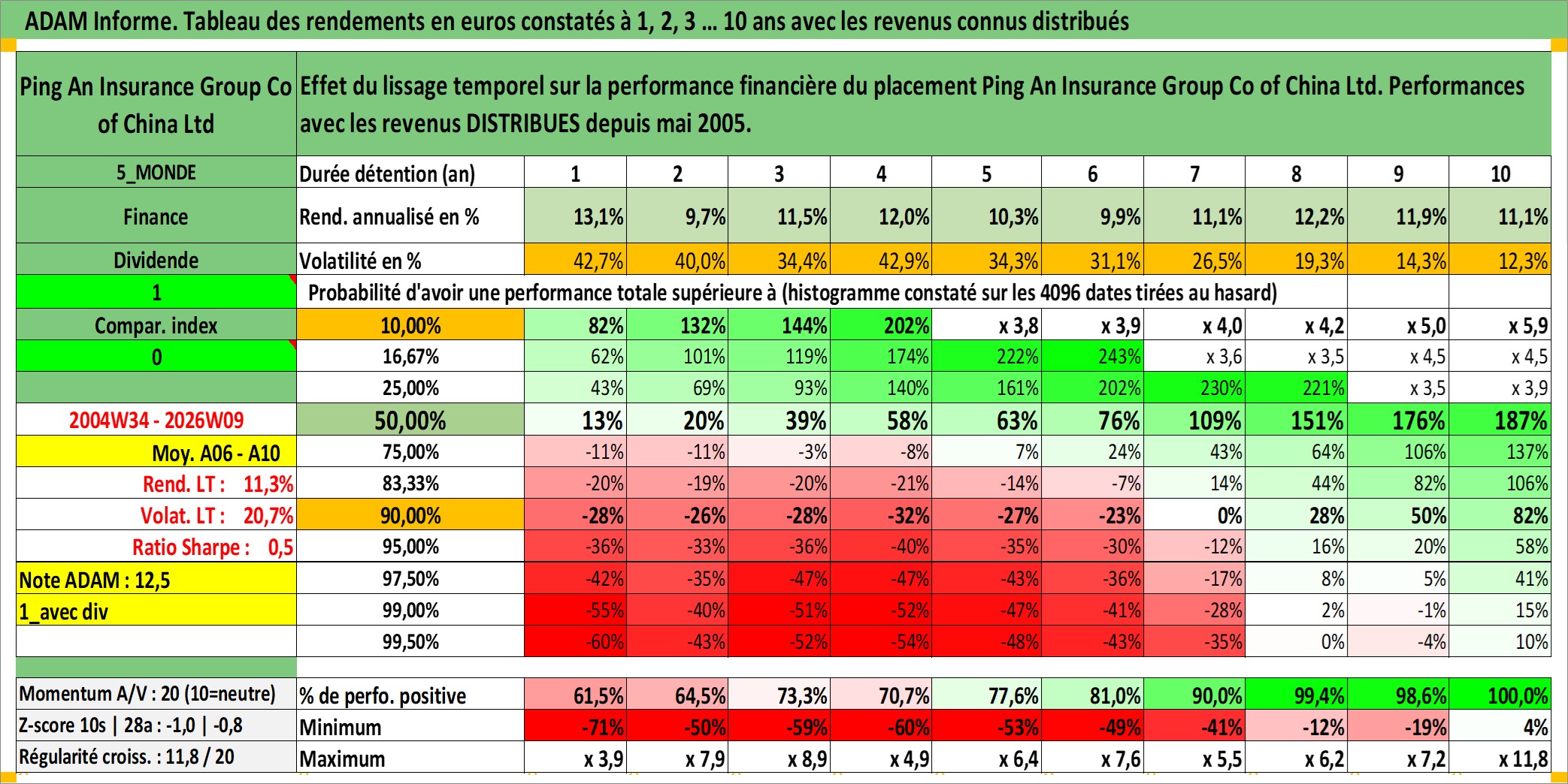 Site dédié aux investisseursPage dédiée sur site financeAnalyse des valorisations hebdomadaires de l'action Ping An Insurance Group Co of China Ltd. Cet actif est cote en HKD. Les valorisations sont en contrevaleur EURO et couvrent les semaines 2004W34 a 2026W09. Les revenus de cet actif financier sont pris en compte depuis la semaine 2005W20. La note globale ESG de cet actif est estimee a 11.0 (apres rebasage entre 0 et 20).
