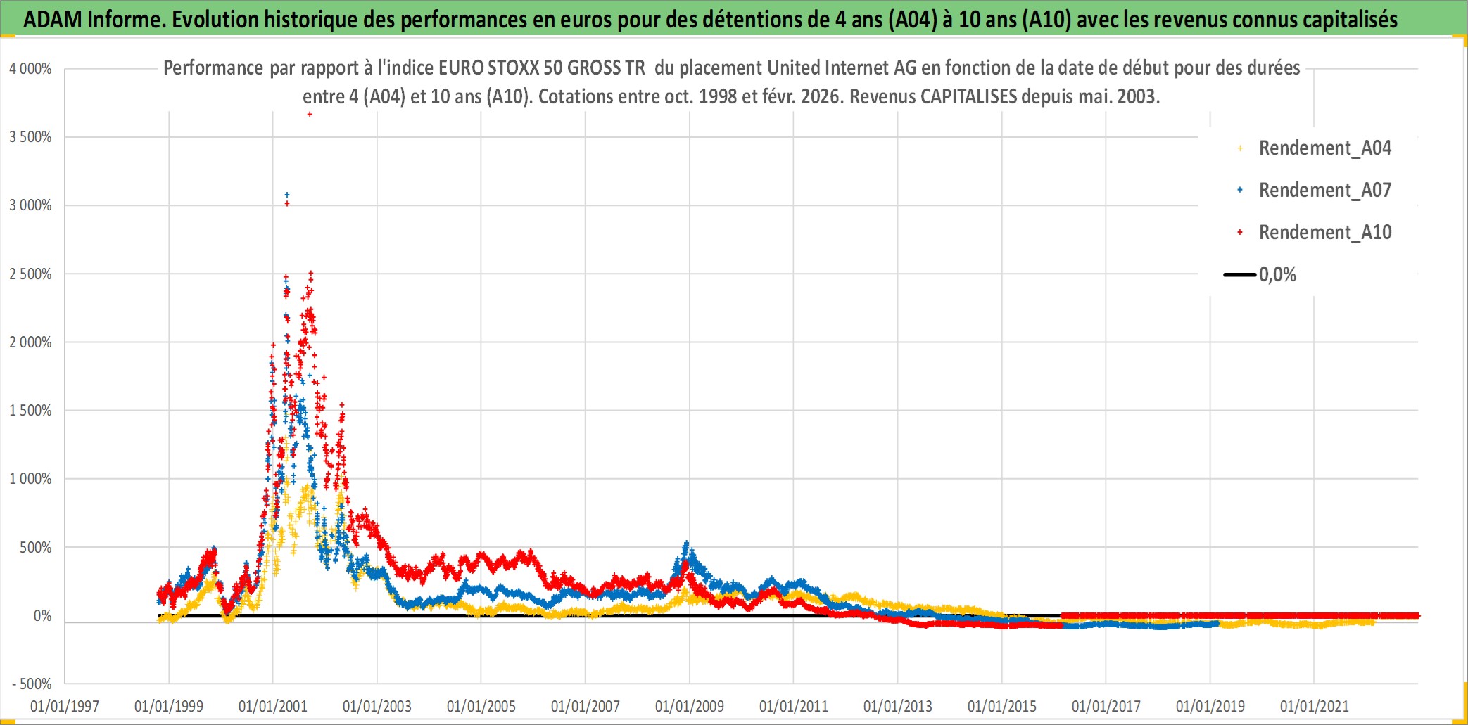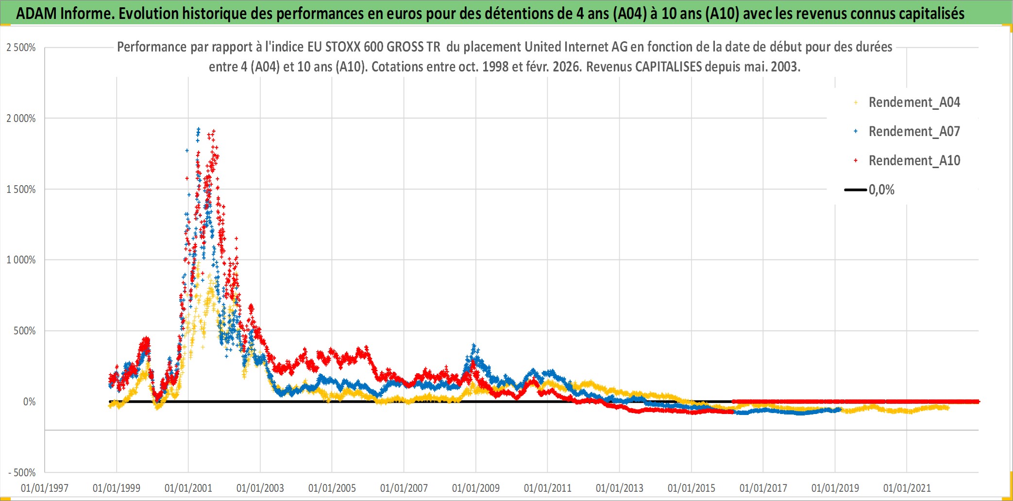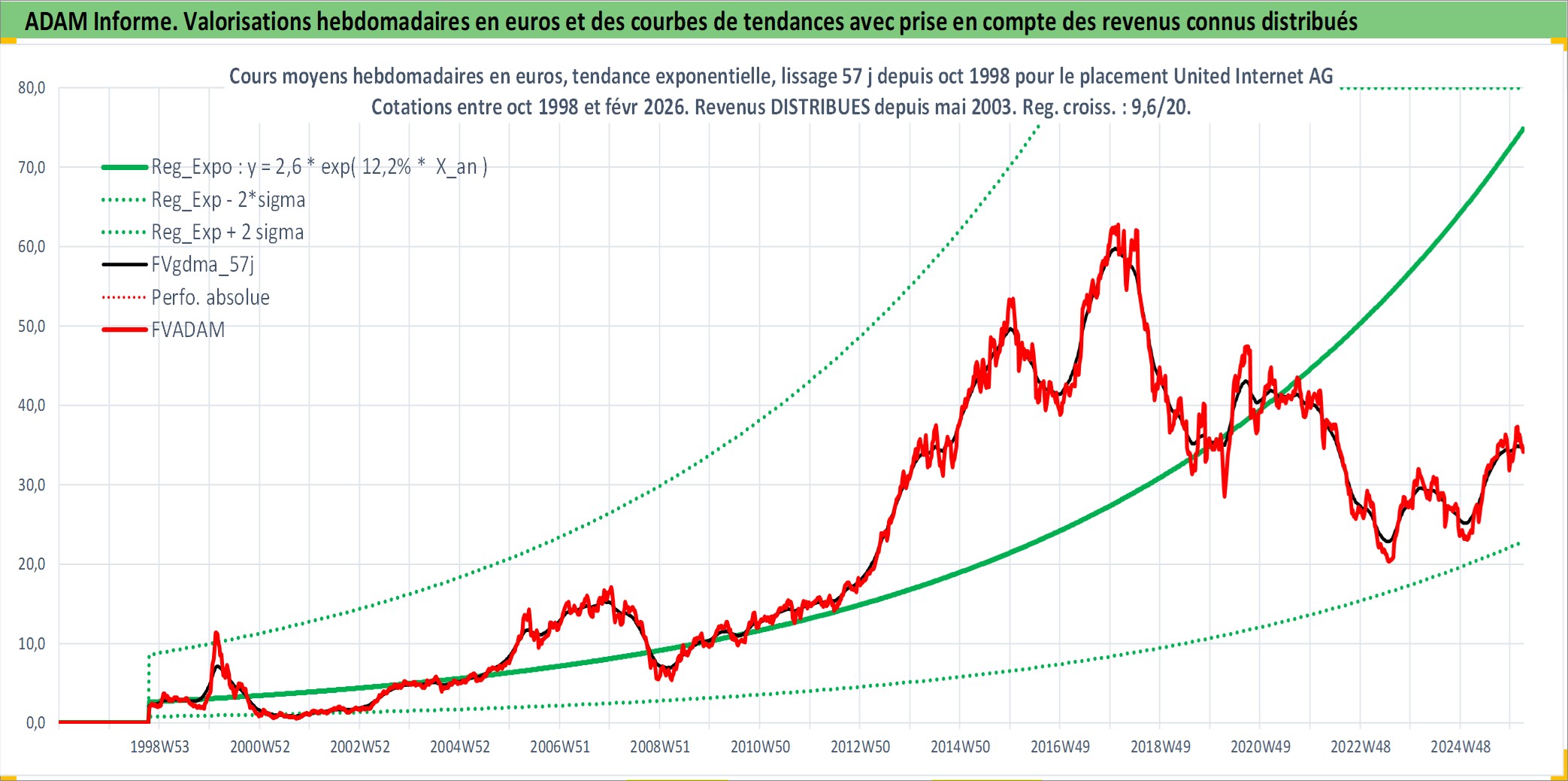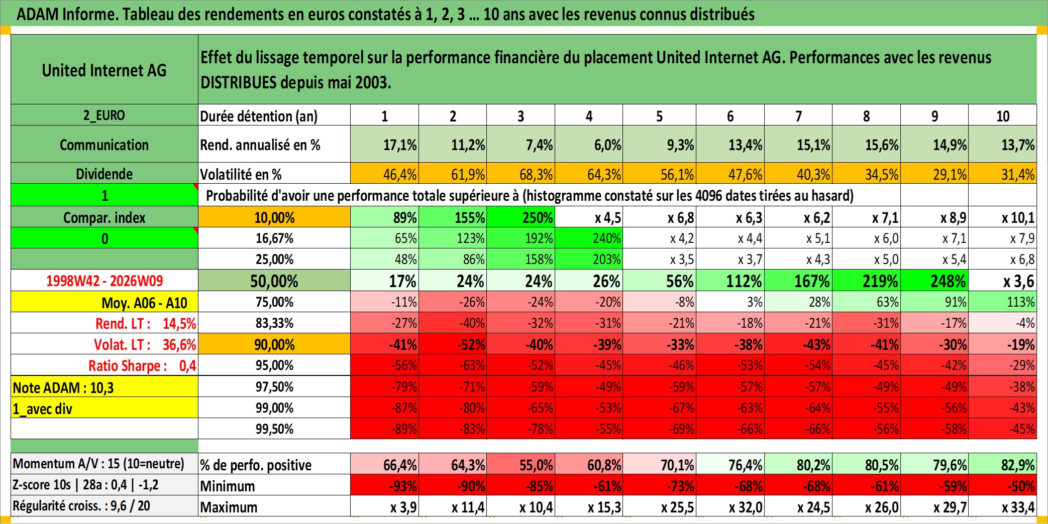 Site dédié aux investisseursPage dédiée sur site financeAnalyse des valorisations hebdomadaires de l'action United Internet AG. Cet actif est cote en EUR. Les valorisations couvrent les semaines 1998W42 a 2026W09. Les revenus de cet actif financier sont pris en compte depuis la semaine 2003W21. La note globale ESG de cet actif est estimee a 9.0 (apres rebasage entre 0 et 20).