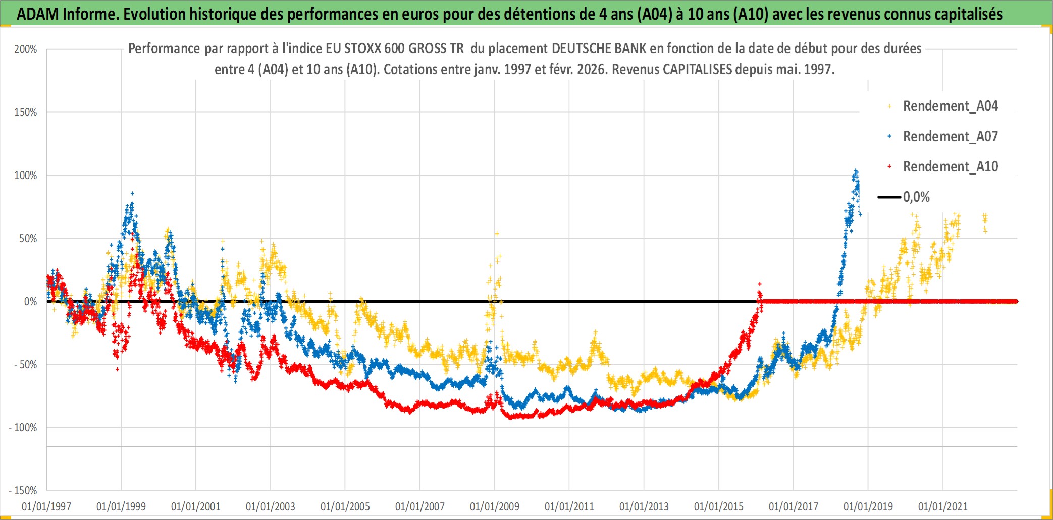 Site dédié aux investisseursPage dédiée sur site financeAnalyse des valorisations hebdomadaires de l'action DEUTSCHE BANK. Cet actif est cote en EUR. Les valorisations couvrent les semaines 1997W01 a 2026W09. Les revenus de cet actif financier sont pris en compte depuis la semaine 1997W21. La note globale ESG de cet actif est estimee a 6.0 (apres rebasage entre 0 et 20).
