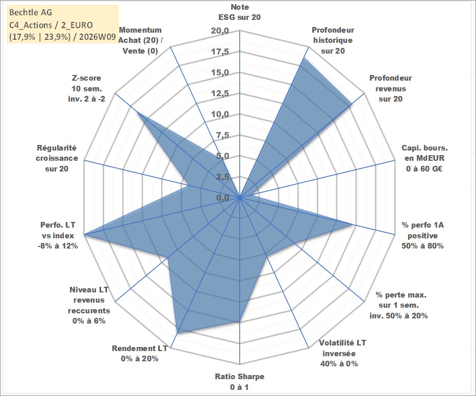 Site dédié aux investisseursPage dédiée sur site financeAnalyse des valorisations hebdomadaires de l'action Bechtle AG. Cet actif est cote en EUR. Les valorisations couvrent les semaines 2000W13 a 2026W09. Les revenus de cet actif financier sont pris en compte depuis la semaine 2001W23. La note ESG de cet actif n'est pas connue.
