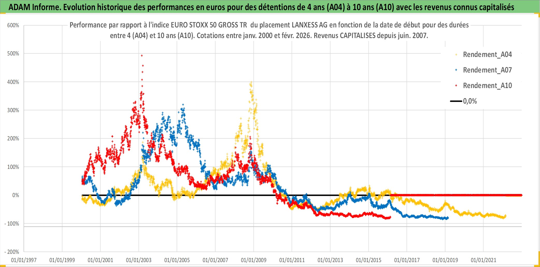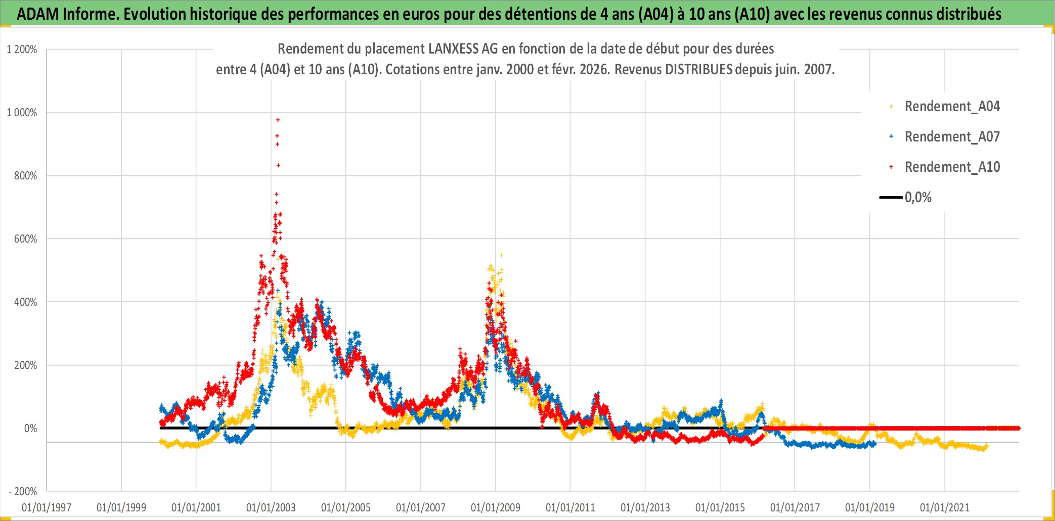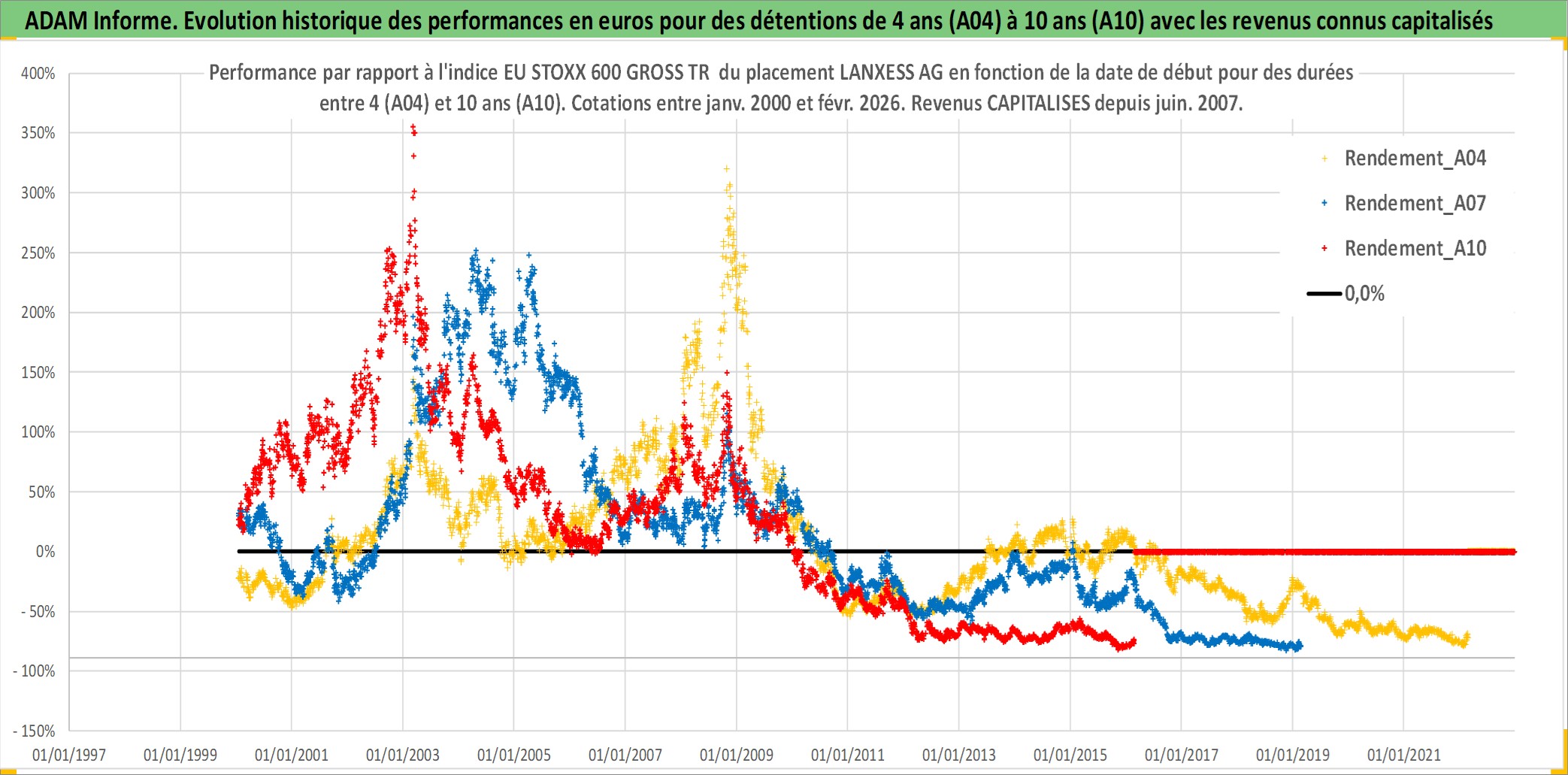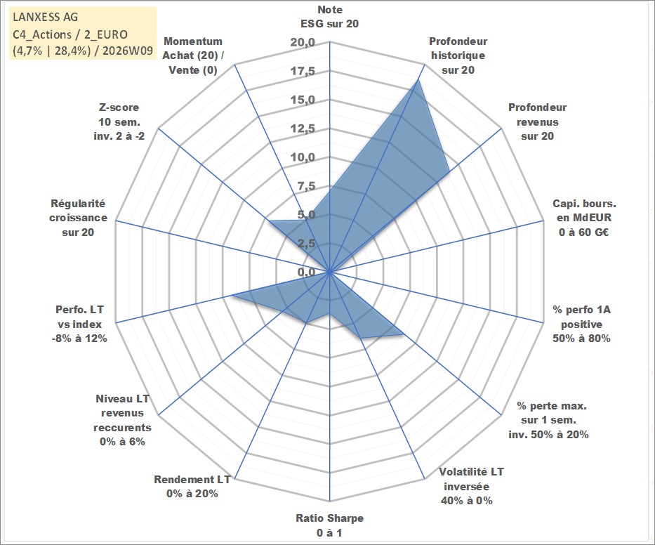 Site dédié aux investisseursPage dédiée sur site financeAnalyse des valorisations hebdomadaires de l'action LANXESS AG. Cet actif est cote en EUR. Les valorisations couvrent les semaines 2000W01 a 2026W09. Les revenus de cet actif financier sont pris en compte depuis la semaine 2007W22. La note globale ESG de cet actif est estimee a 7.0 (apres rebasage entre 0 et 20).