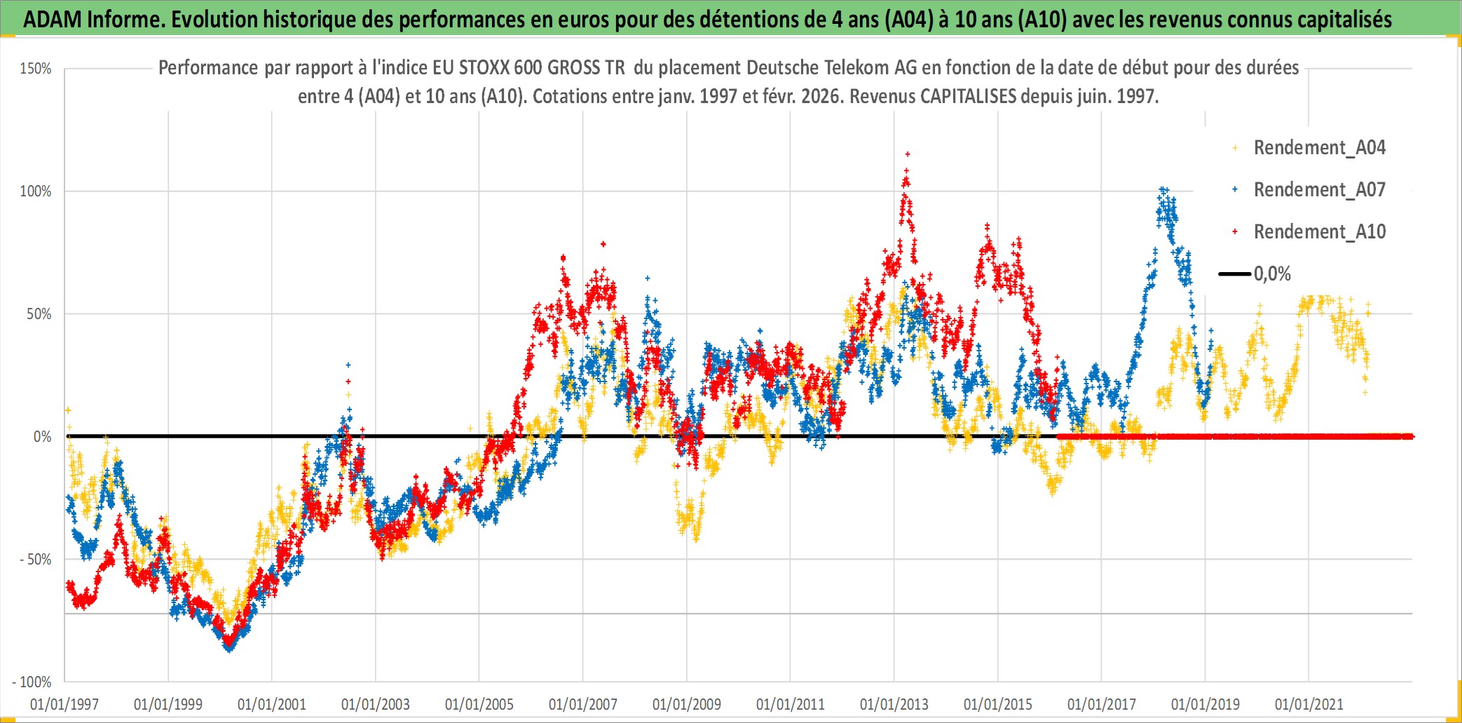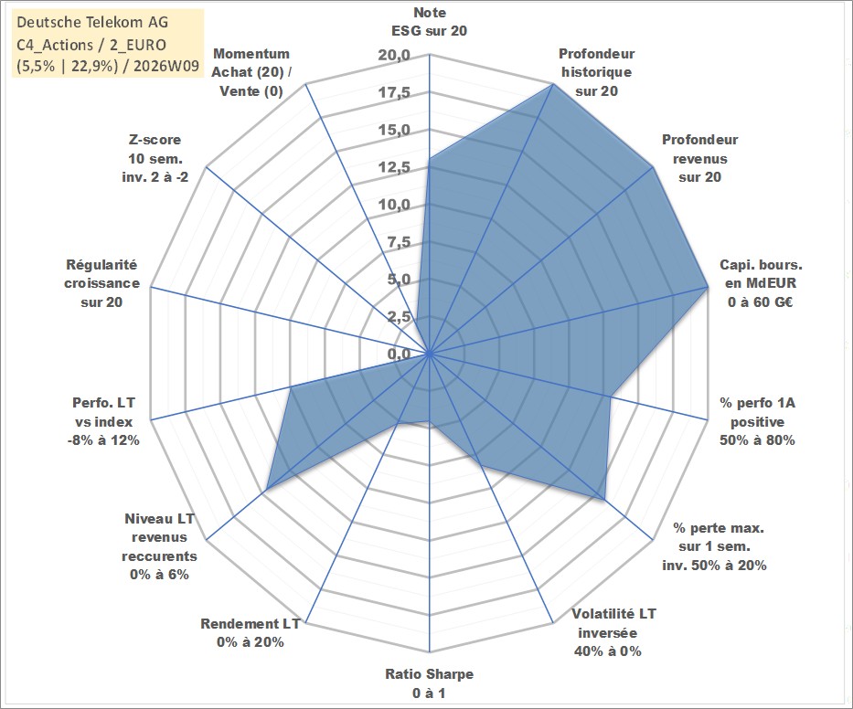 Site dédié aux investisseursPage dédiée sur site financeAnalyse des valorisations hebdomadaires de l'action Deutsche Telekom AG. Cet actif est cote en EUR. Les valorisations couvrent les semaines 1997W01 a 2026W09. Les revenus de cet actif financier sont pris en compte depuis la semaine 1997W26. La note globale ESG de cet actif est estimee a 13.0 (apres rebasage entre 0 et 20).