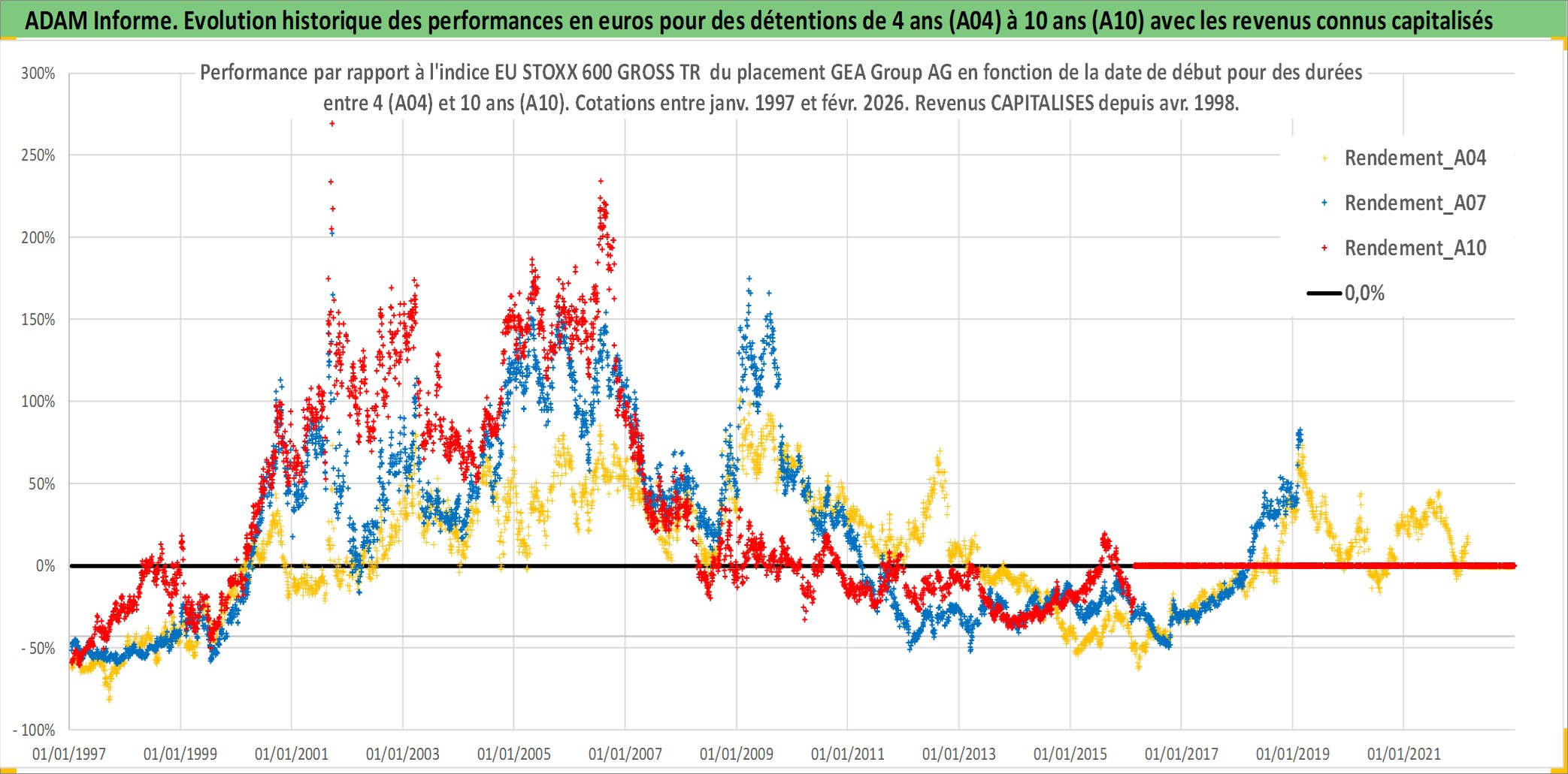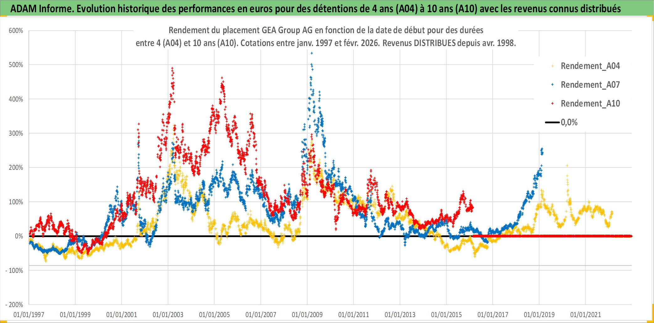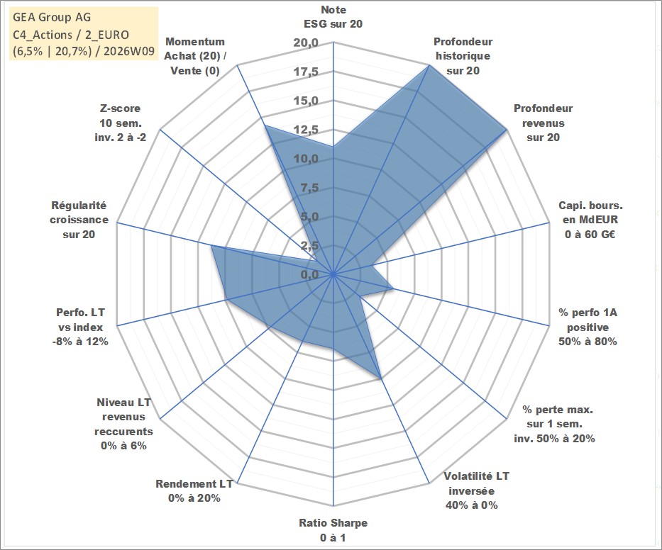 Site dédié aux investisseursPage dédiée sur site financeAnalyse des valorisations hebdomadaires de l'action GEA Group AG. Cet actif est cote en EUR. Les valorisations couvrent les semaines 1997W01 a 2026W09. Les revenus de cet actif financier sont pris en compte depuis la semaine 1998W14. La note globale ESG de cet actif est estimee a 11.0 (apres rebasage entre 0 et 20).