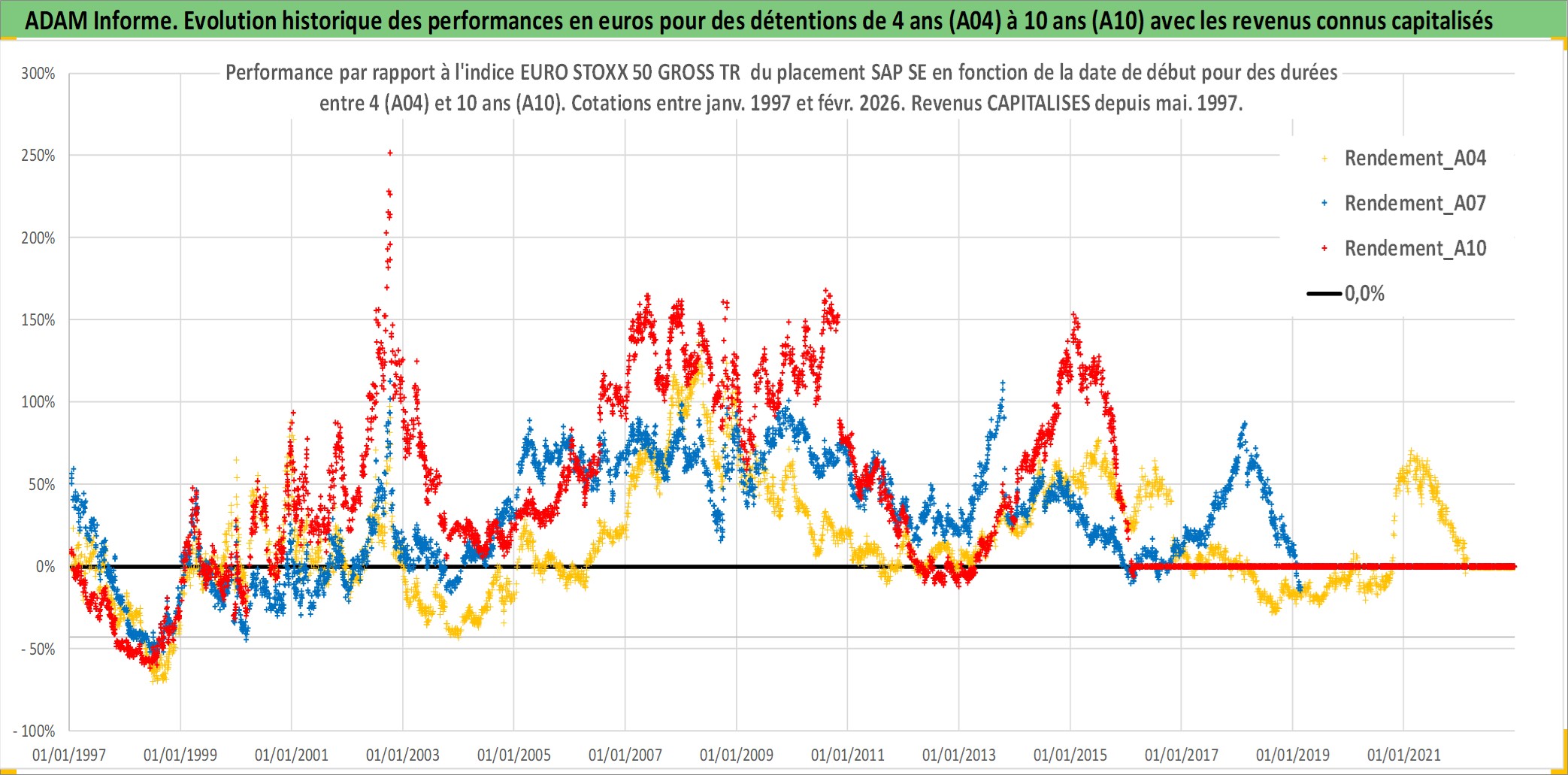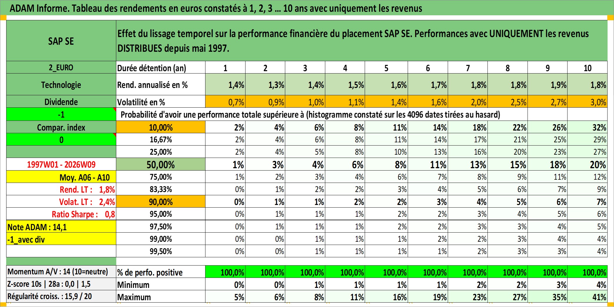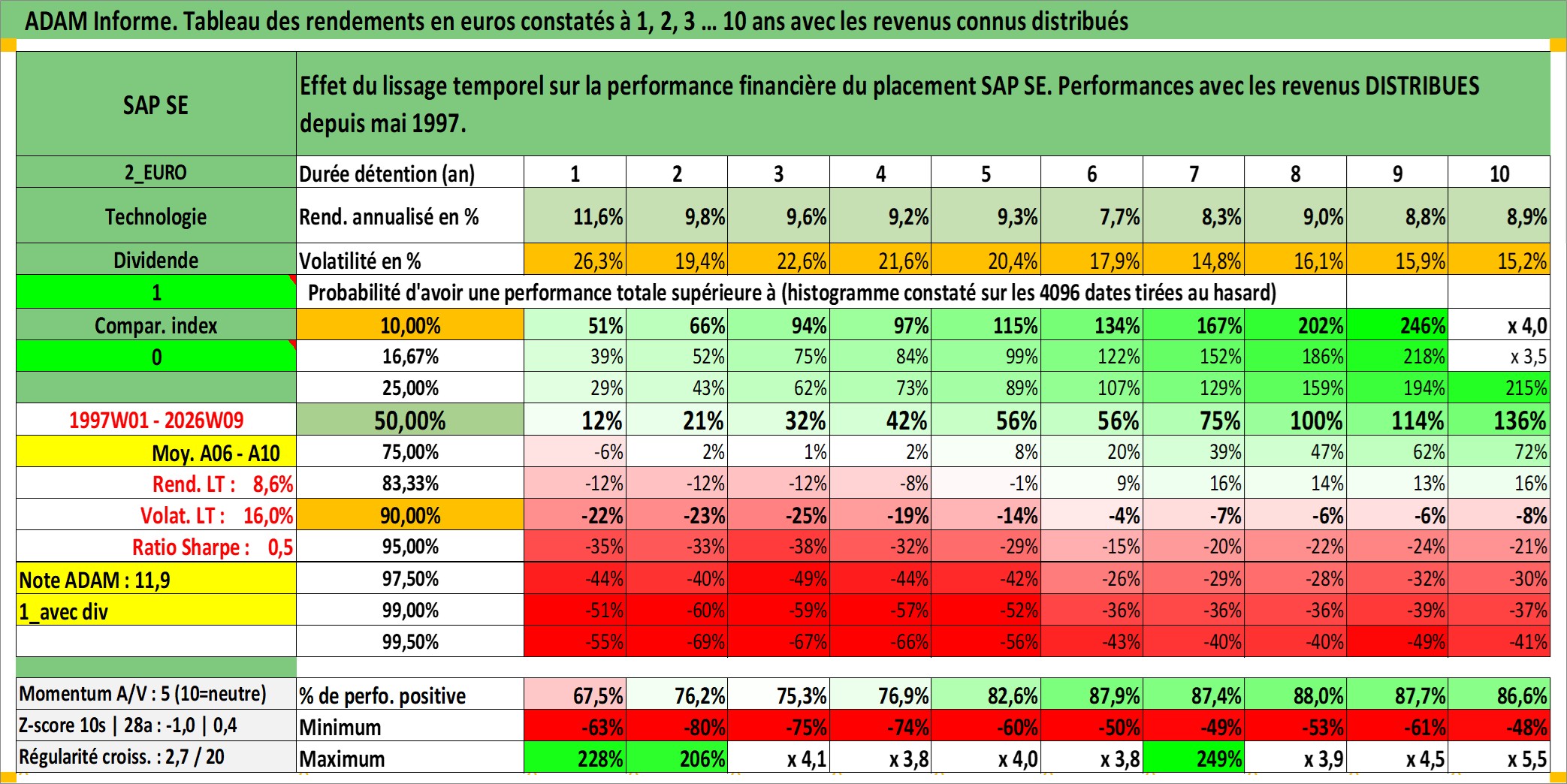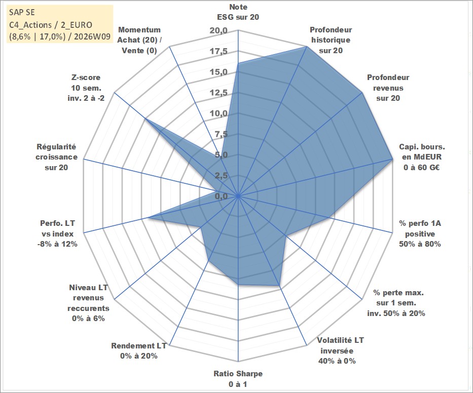 Site dédié aux investisseursPage dédiée sur site financeAnalyse des valorisations hebdomadaires de l'action SAP SE. Cet actif est cote en EUR. Les valorisations couvrent les semaines 1997W01 a 2026W09. Les revenus de cet actif financier sont pris en compte depuis la semaine 1997W19. La note globale ESG de cet actif est estimee a 16.0 (apres rebasage entre 0 et 20).