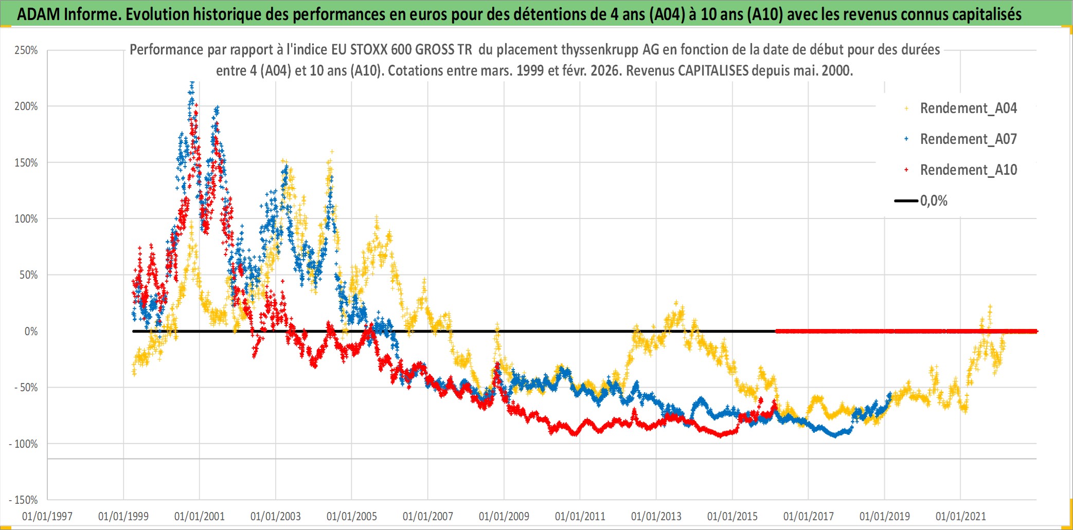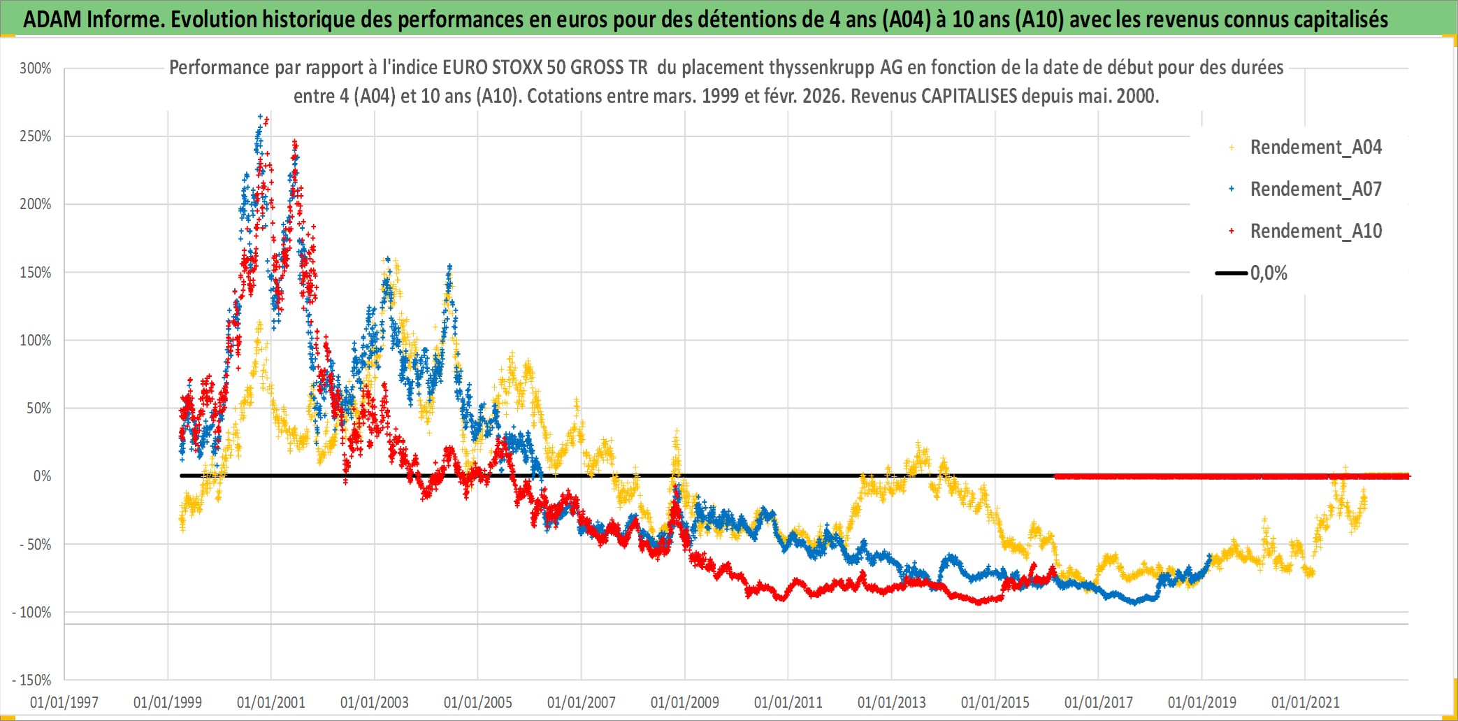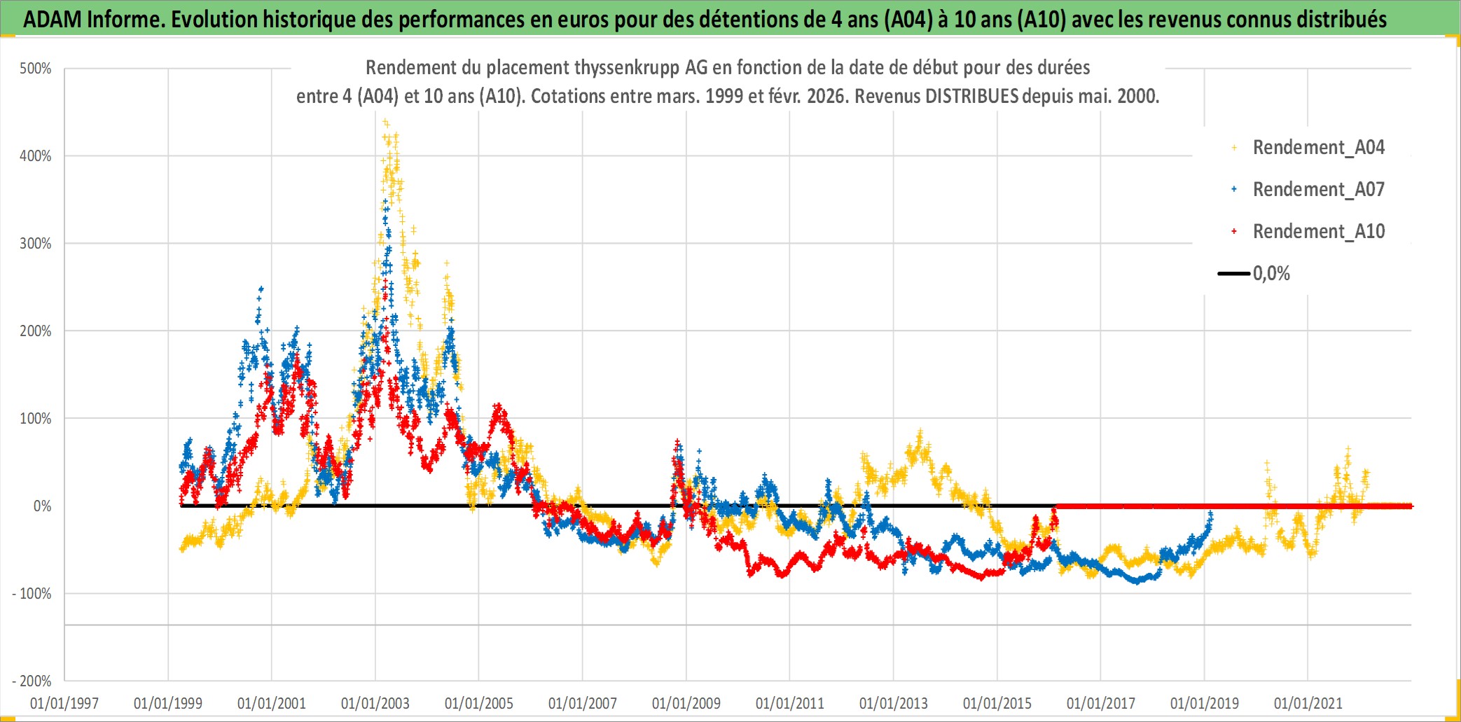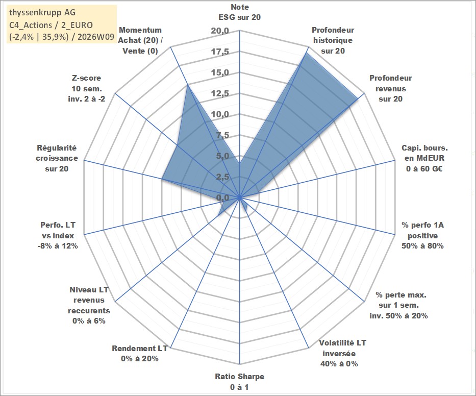Site dédié aux investisseursPage dédiée sur site financeAnalyse des valorisations hebdomadaires de l'action thyssenkrupp AG. Cet actif est cote en EUR. Les valorisations couvrent les semaines 1999W12 a 2026W09. Les revenus de cet actif financier sont pris en compte depuis la semaine 2000W21. La note globale ESG de cet actif est estimee a 4.0 (apres rebasage entre 0 et 20).