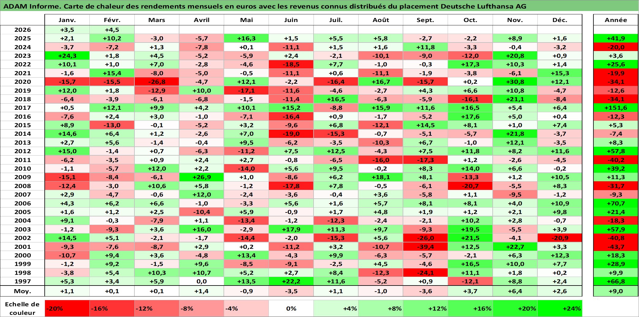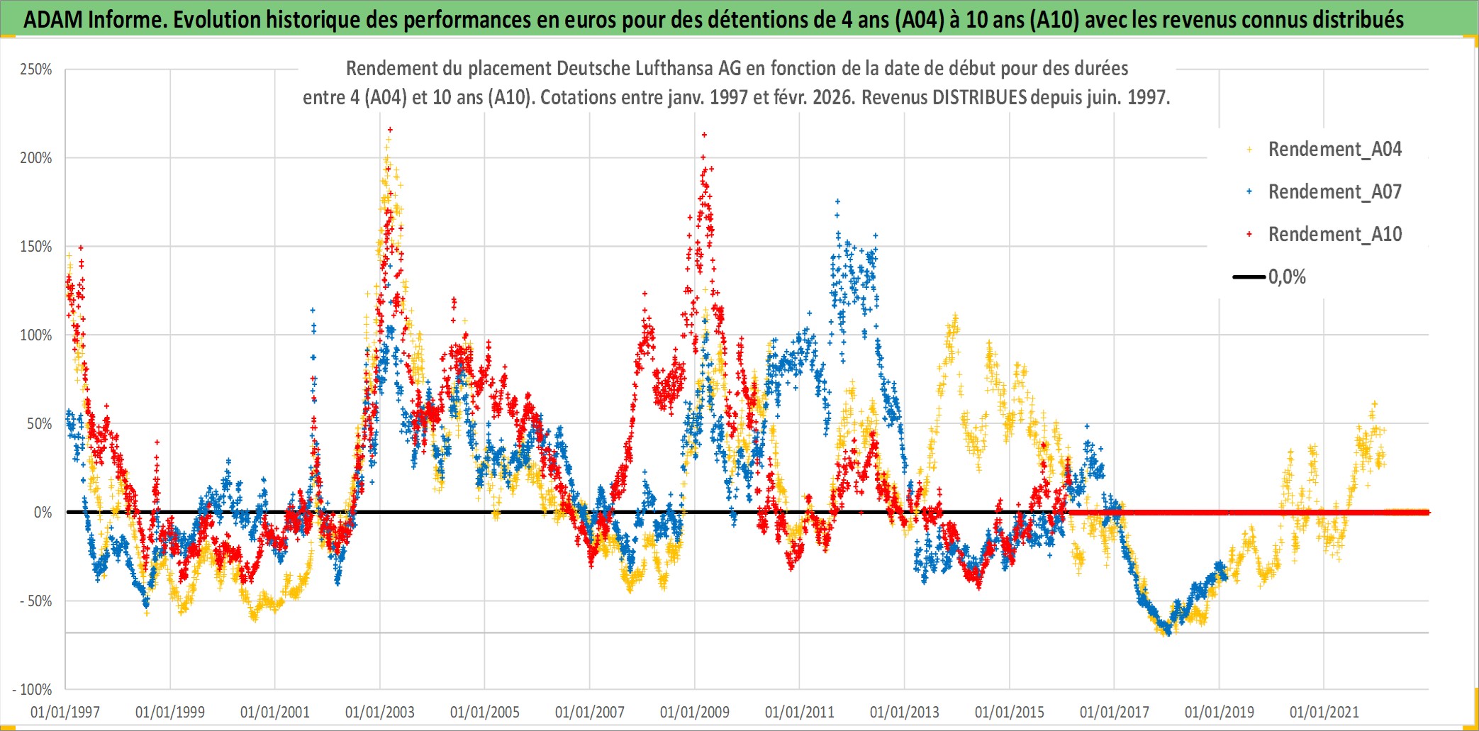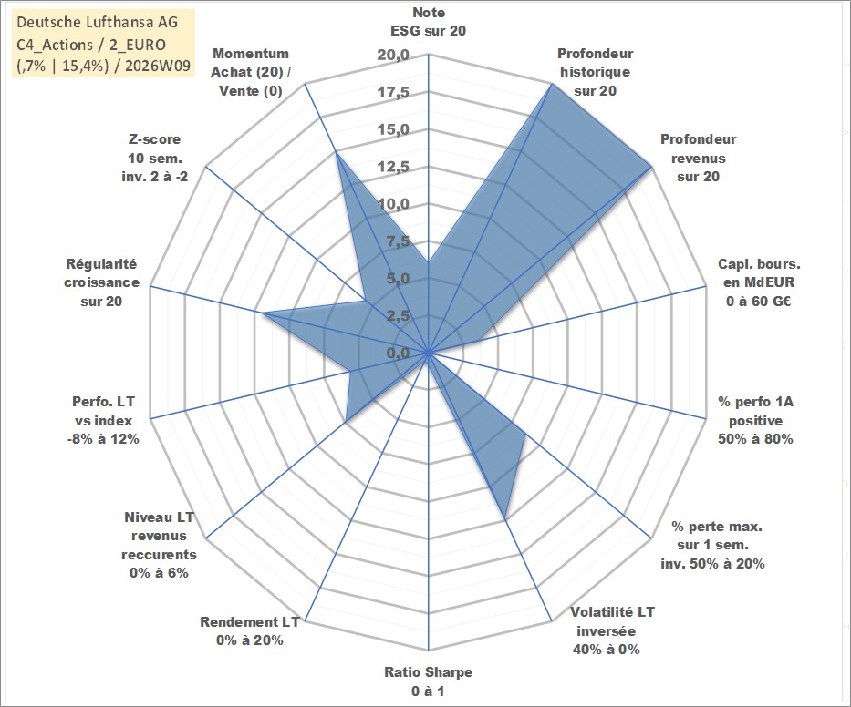 Site dédié aux investisseursPage dédiée sur site financeAnalyse des valorisations hebdomadaires de l'action Deutsche Lufthansa AG. Cet actif est cote en EUR. Les valorisations couvrent les semaines 1997W01 a 2026W09. Les revenus de cet actif financier sont pris en compte depuis la semaine 1997W26. La note globale ESG de cet actif est estimee a 6.0 (apres rebasage entre 0 et 20).