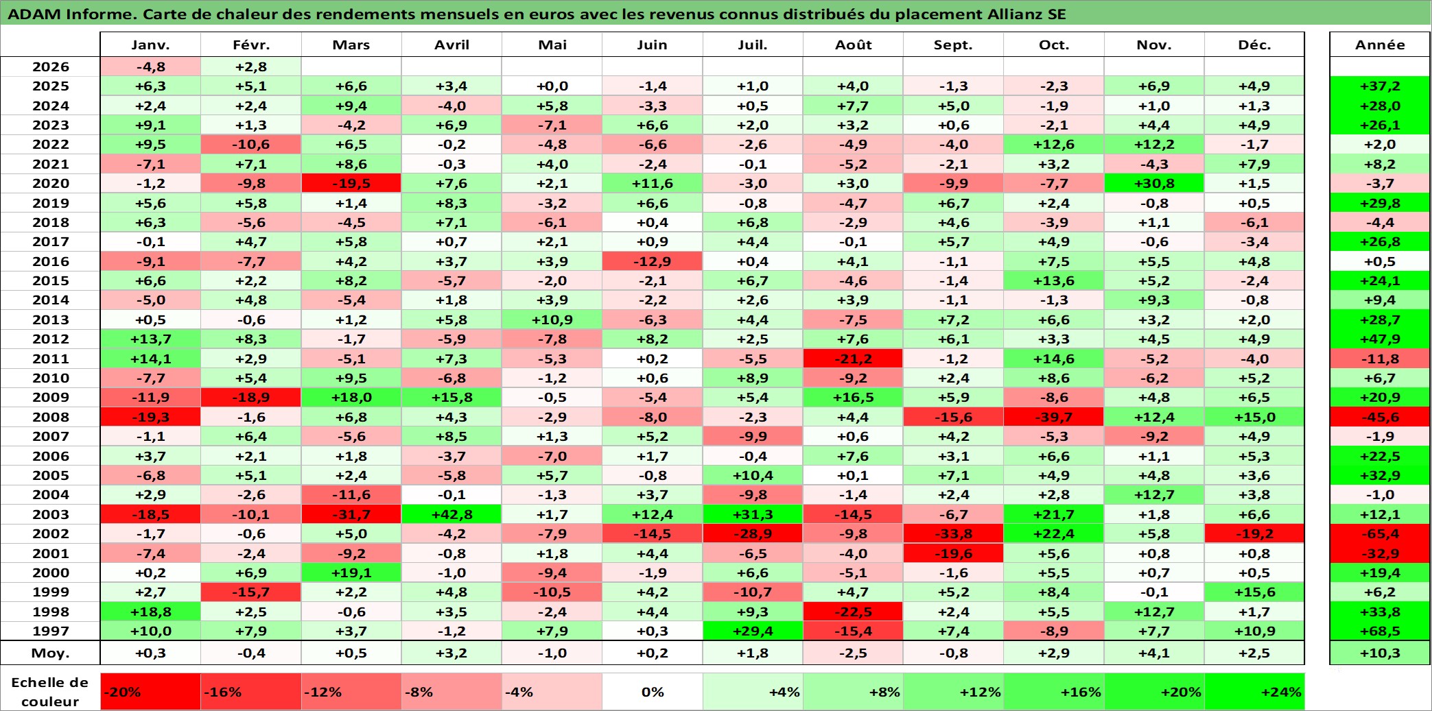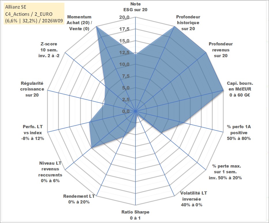 Site dédié aux investisseursPage dédiée sur site financeAnalyse des valorisations hebdomadaires de l'action Allianz SE. Cet actif est cote en EUR. Les valorisations couvrent les semaines 1997W01 a 2026W09. Les revenus de cet actif financier sont pris en compte depuis la semaine 1997W28. La note globale ESG de cet actif est estimee a 12.0 (apres rebasage entre 0 et 20).