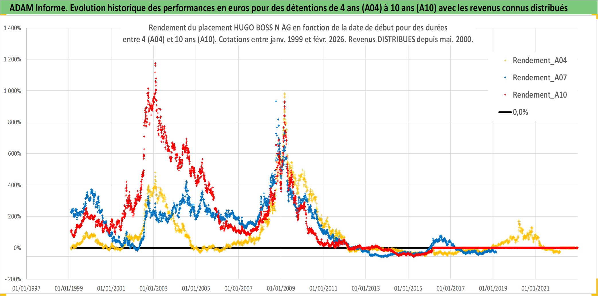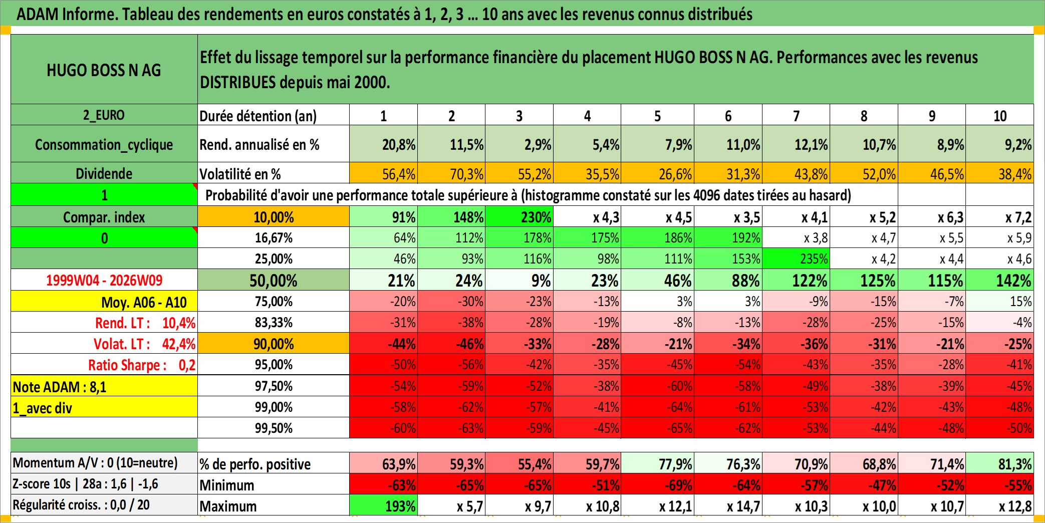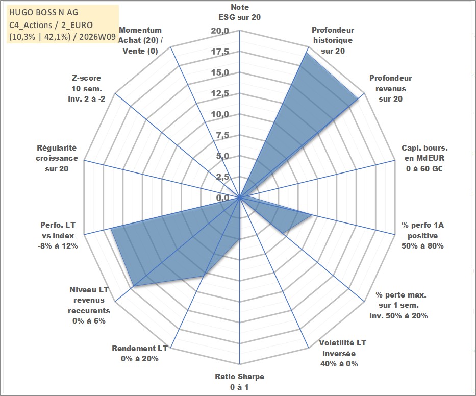 Site dédié aux investisseursPage dédiée sur site financeAnalyse des valorisations hebdomadaires de l'action HUGO BOSS N AG. Cet actif est cote en EUR. Les valorisations couvrent les semaines 1999W04 a 2026W09. Les revenus de cet actif financier sont pris en compte depuis la semaine 2000W21. La note ESG de cet actif n'est pas connue.