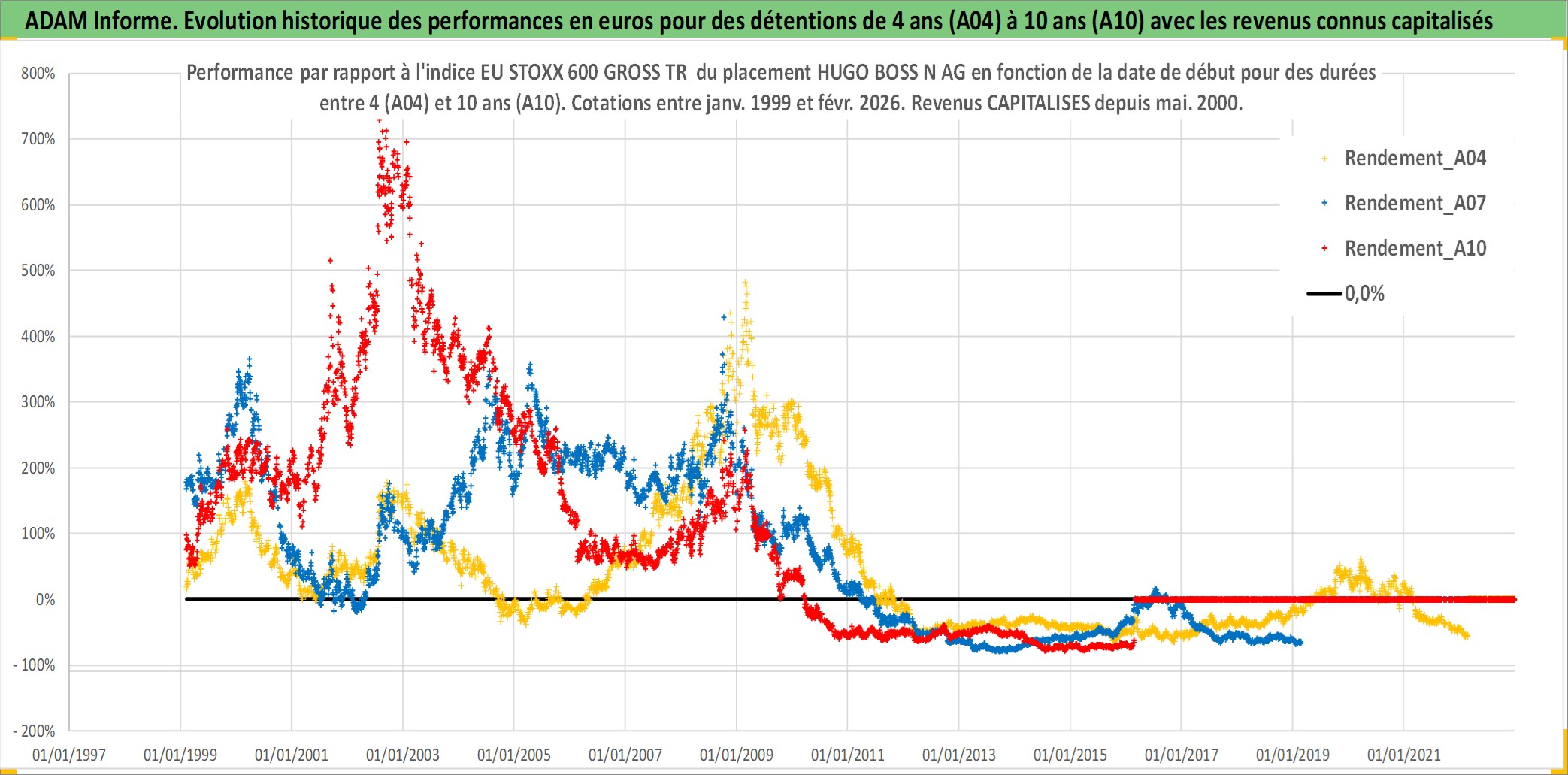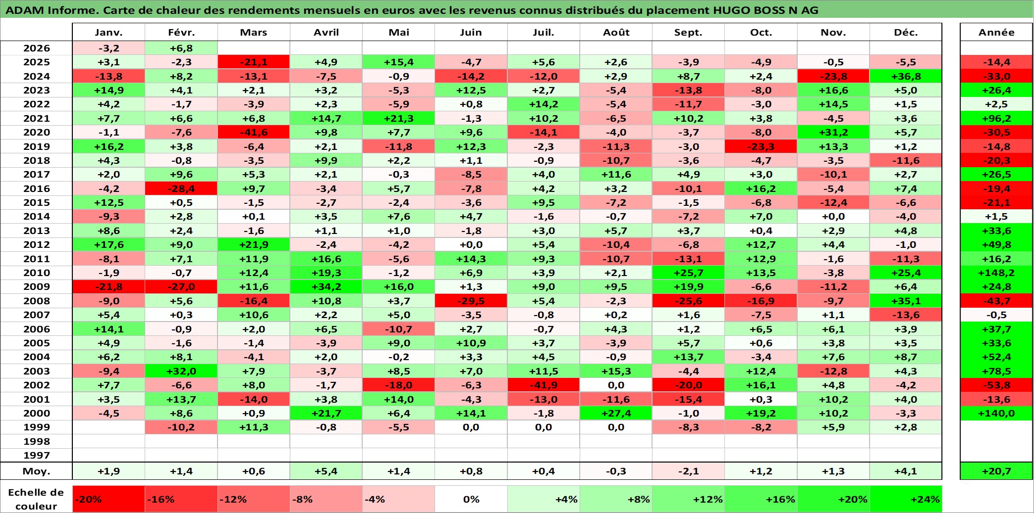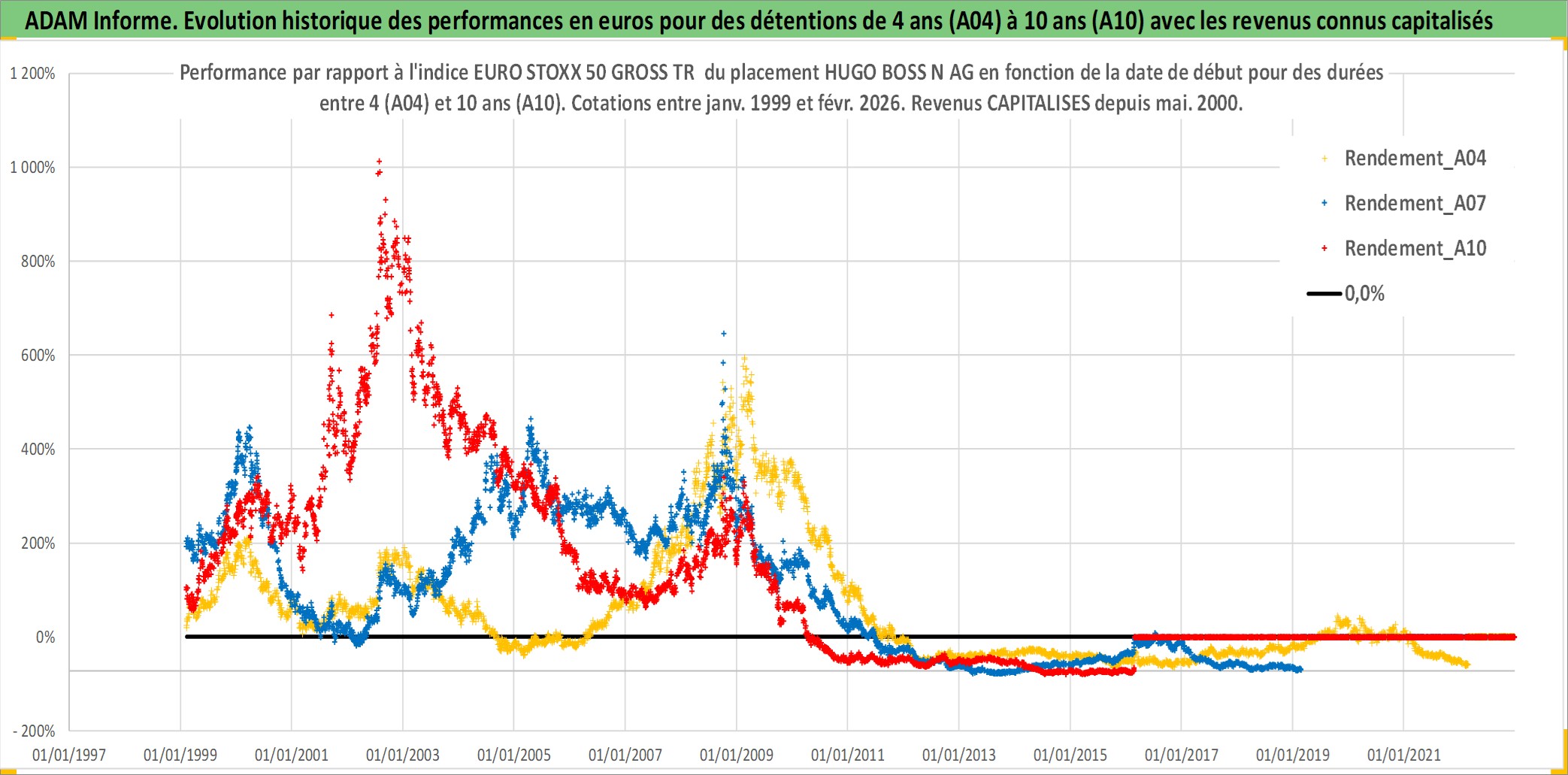 Site dédié aux investisseursPage dédiée sur site financeAnalyse des valorisations hebdomadaires de l'action HUGO BOSS N AG. Cet actif est cote en EUR. Les valorisations couvrent les semaines 1999W04 a 2026W09. Les revenus de cet actif financier sont pris en compte depuis la semaine 2000W21. La note ESG de cet actif n'est pas connue.