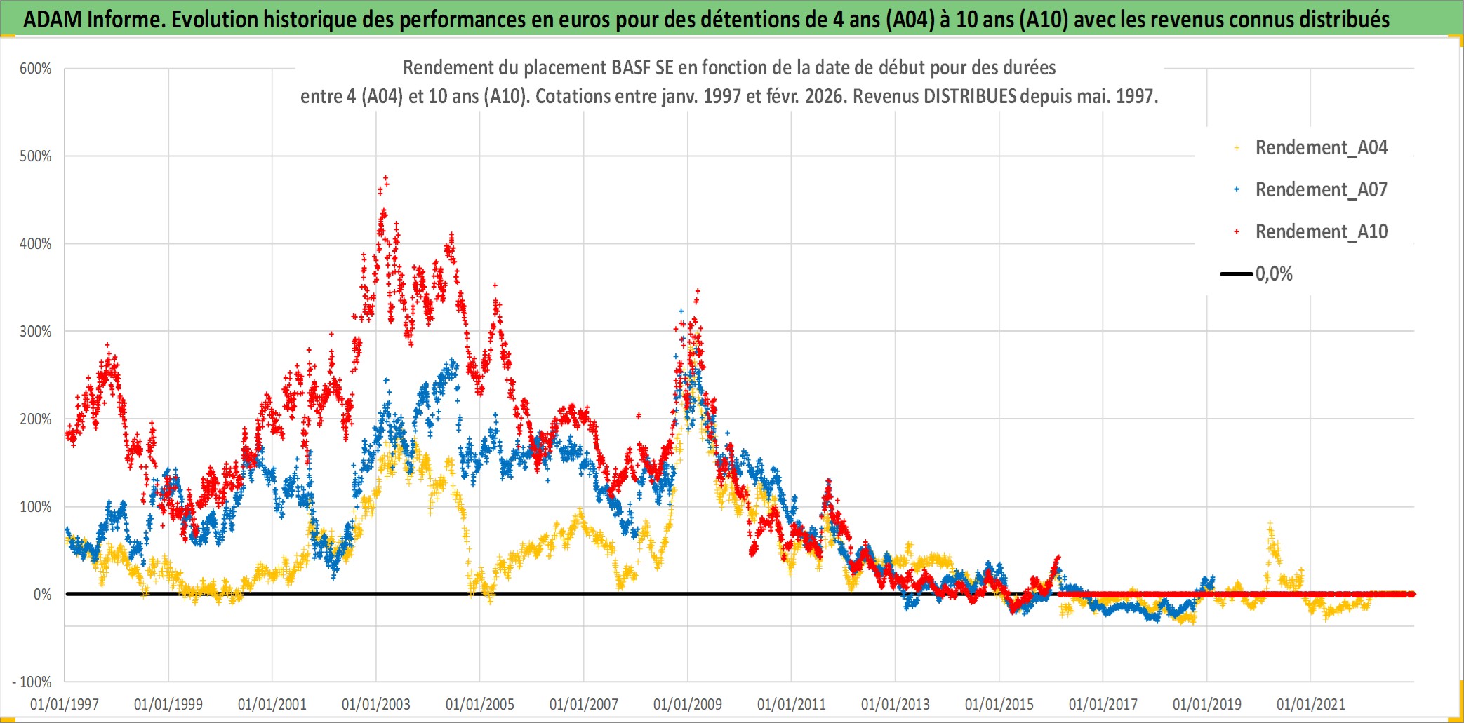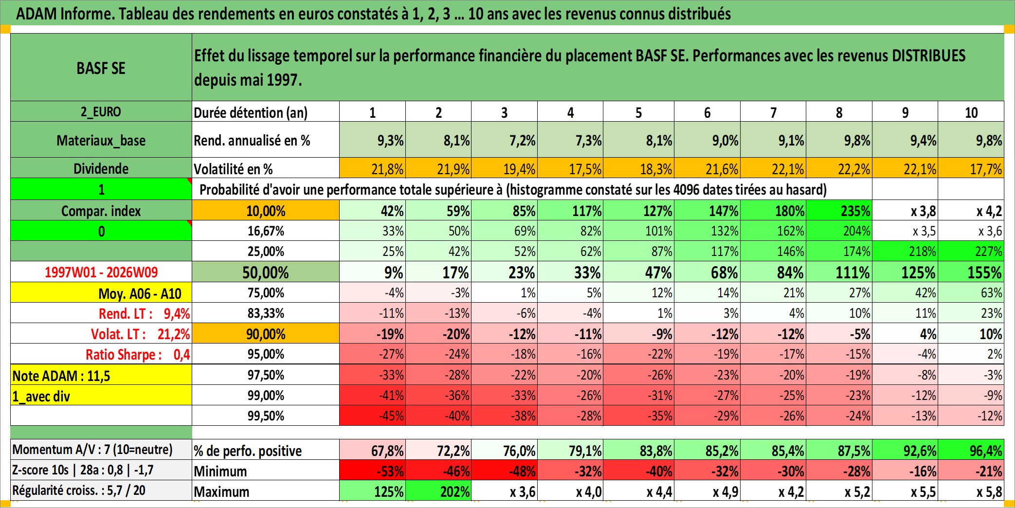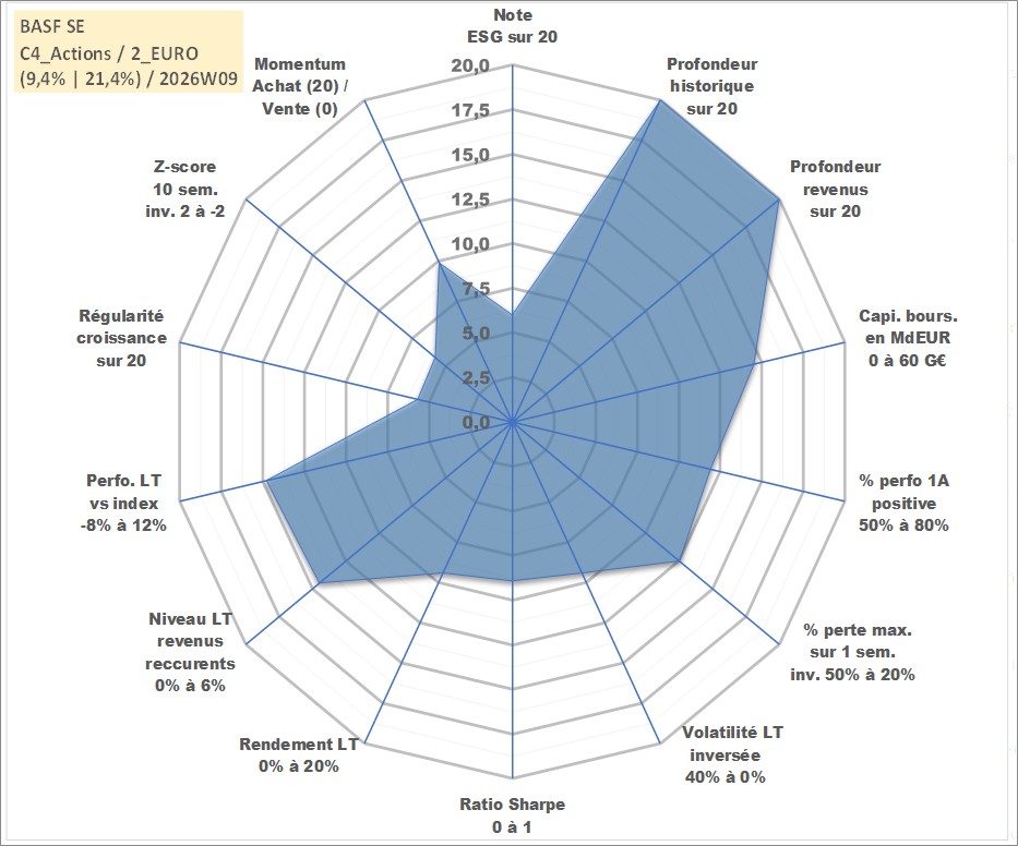 Site dédié aux investisseursPage dédiée sur site financeAnalyse des valorisations hebdomadaires de l'action BASF SE. Cet actif est cote en EUR. Les valorisations couvrent les semaines 1997W01 a 2026W09. Les revenus de cet actif financier sont pris en compte depuis la semaine 1997W20. La note globale ESG de cet actif est estimee a 6.0 (apres rebasage entre 0 et 20).