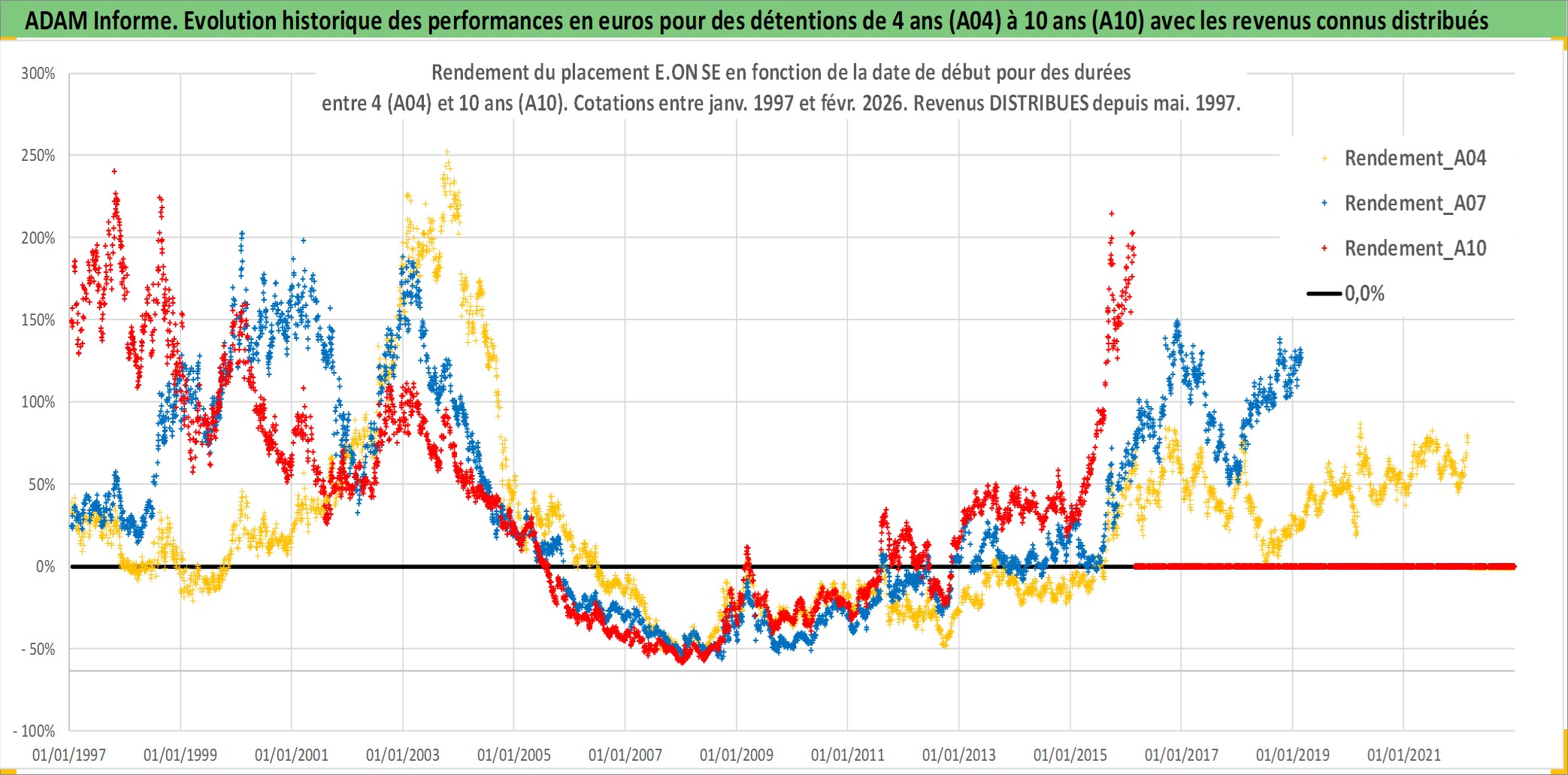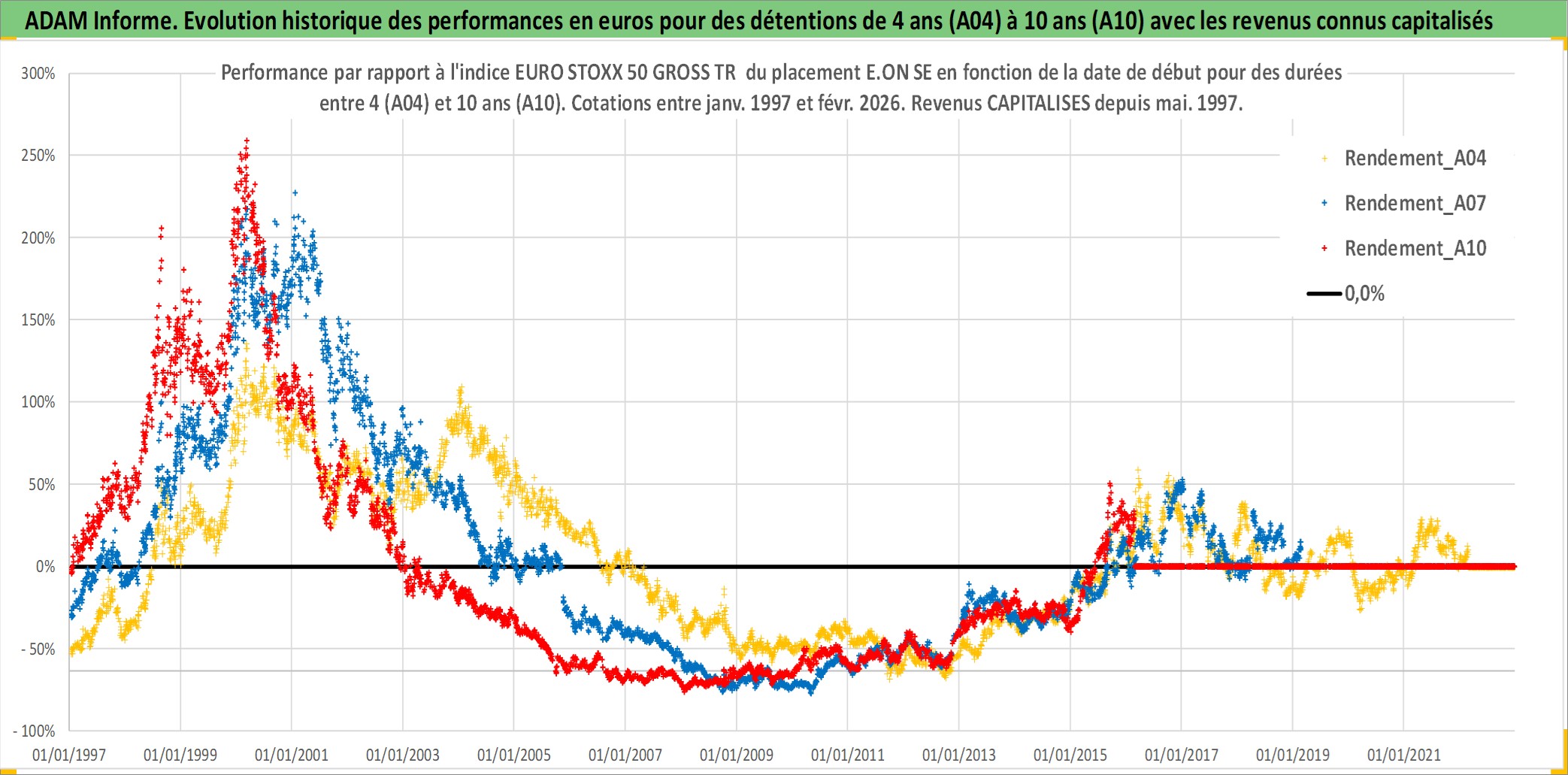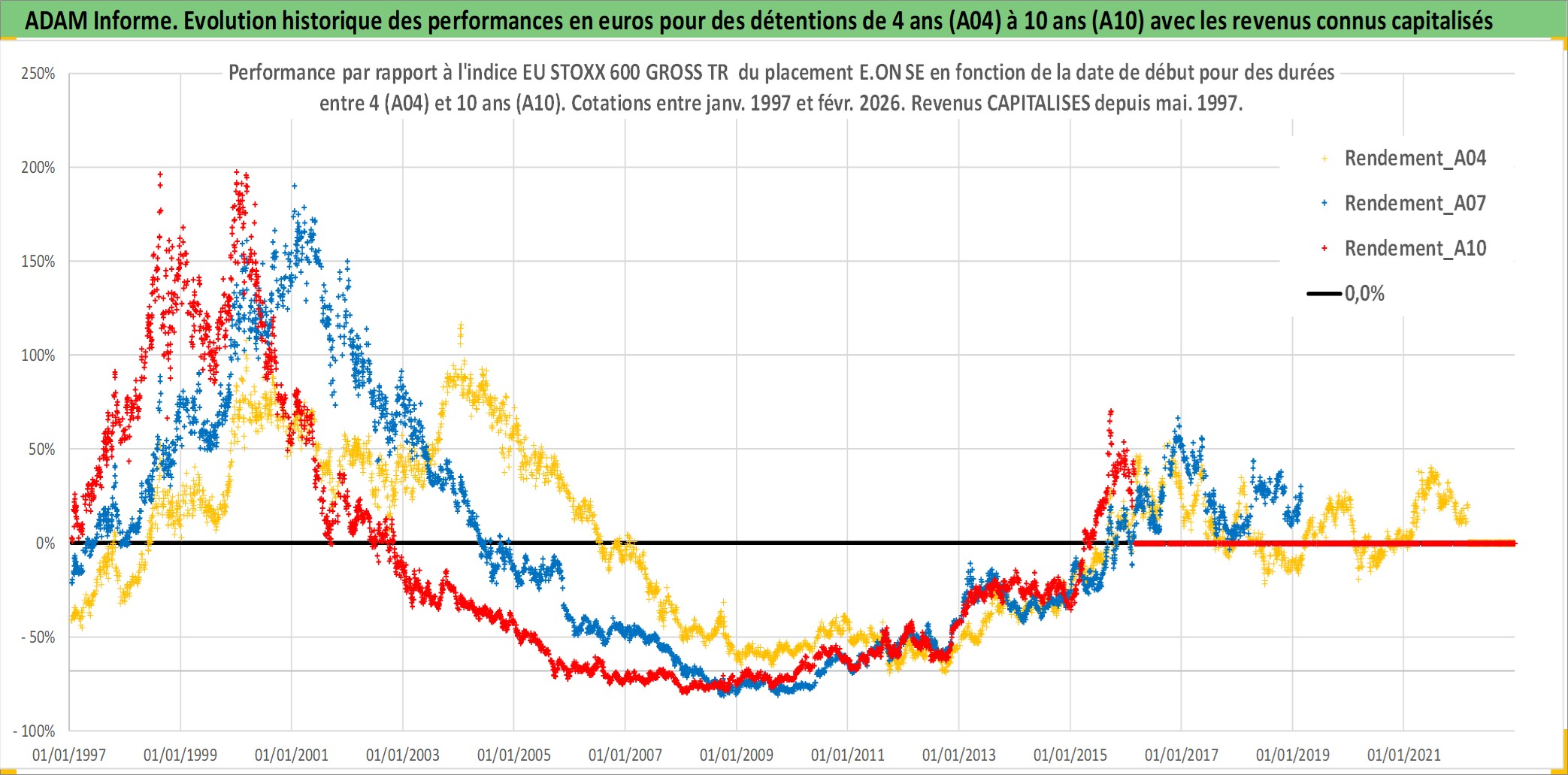 Site dédié aux investisseursPage dédiée sur site financeAnalyse des valorisations hebdomadaires de l'action E.ON SE. Cet actif est cote en EUR. Les valorisations couvrent les semaines 1997W01 a 2026W09. Les revenus de cet actif financier sont pris en compte depuis la semaine 1997W21. La note globale ESG de cet actif est estimee a 8.0 (apres rebasage entre 0 et 20).