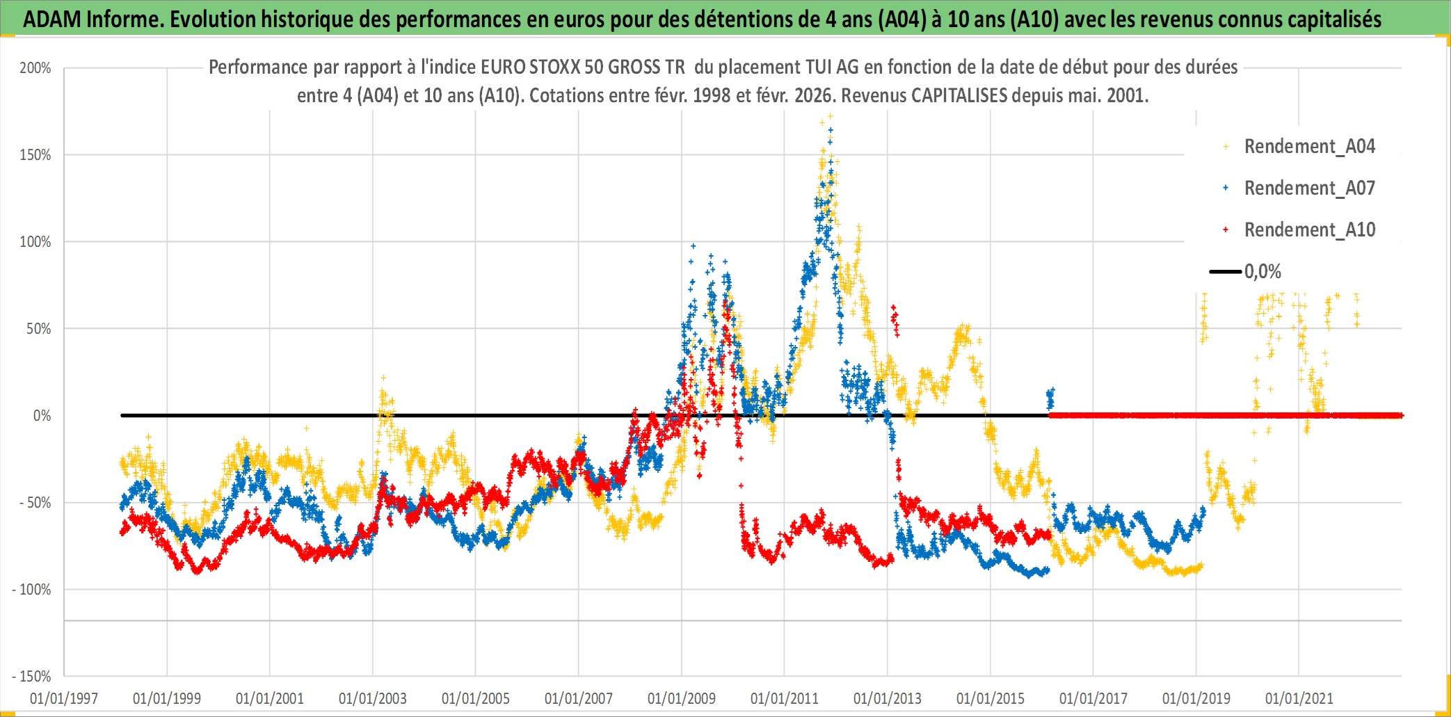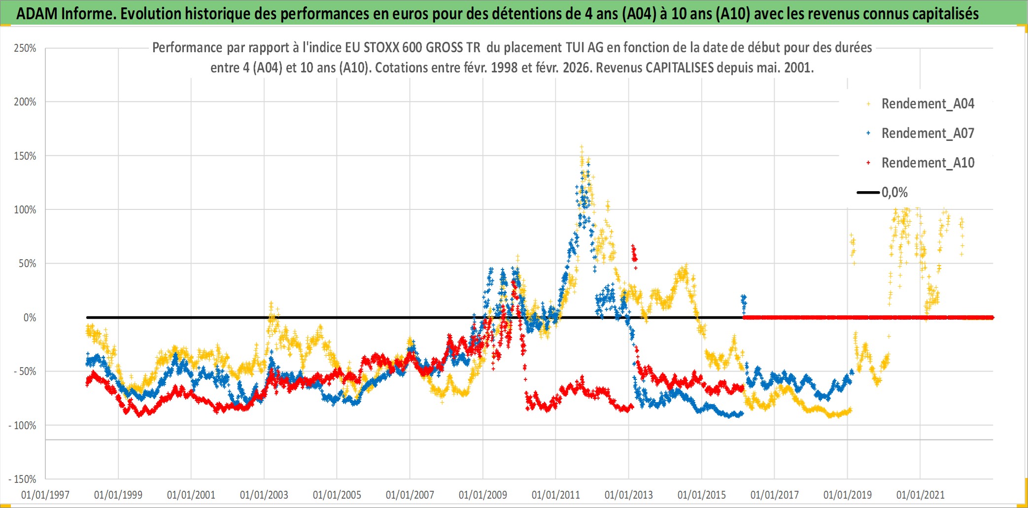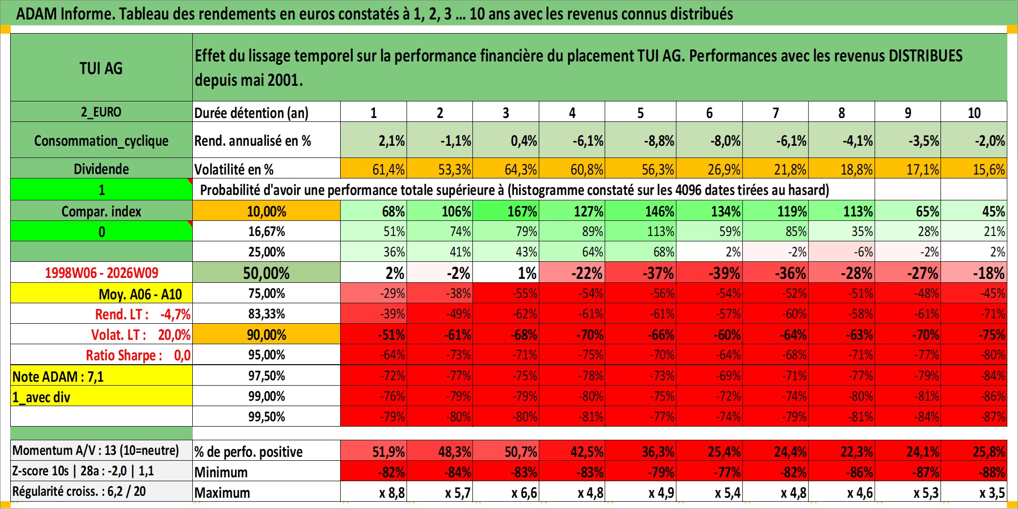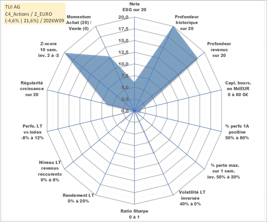 Site dédié aux investisseursPage dédiée sur site financeAnalyse des valorisations hebdomadaires de l'action TUI AG. Cet actif est cote en EUR. Les valorisations couvrent les semaines 1998W06 a 2026W09. Les revenus de cet actif financier sont pris en compte depuis la semaine 2001W21. La note globale ESG de cet actif est estimee a 6.0 (apres rebasage entre 0 et 20).