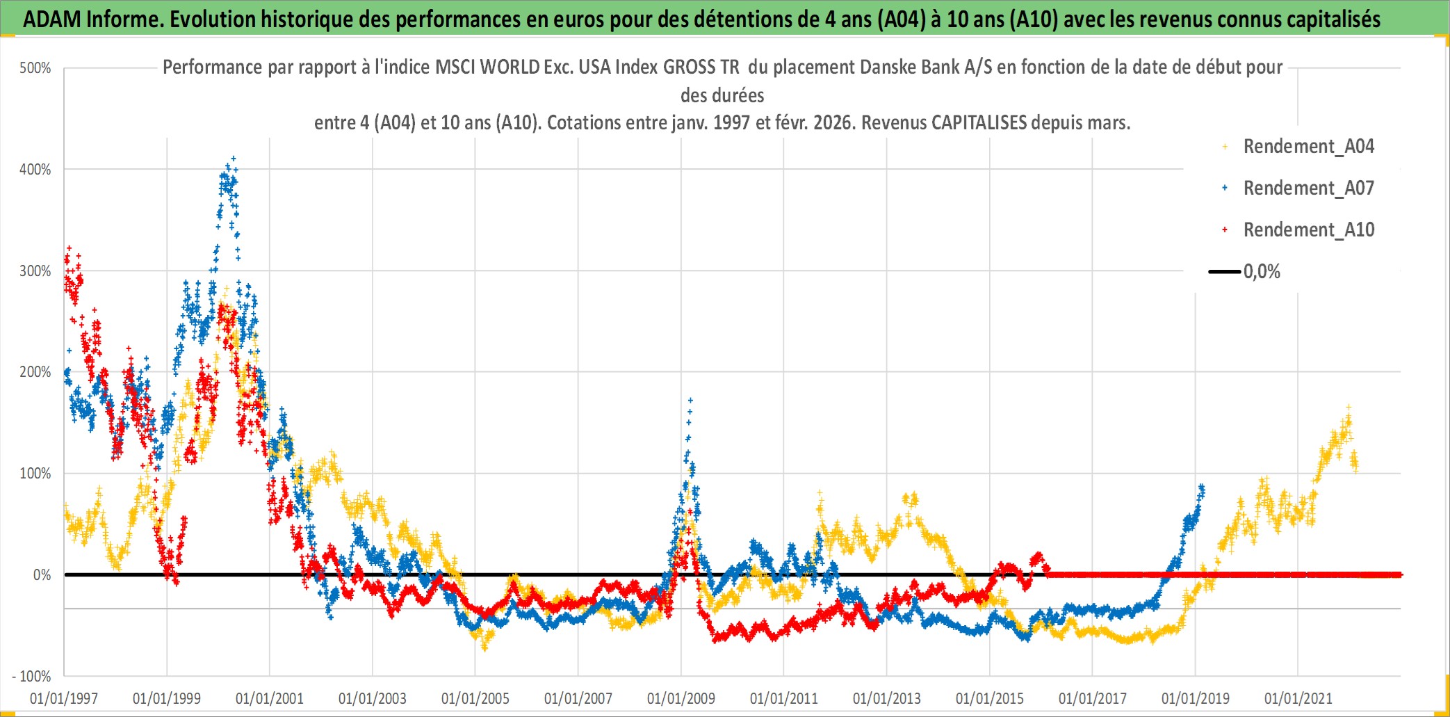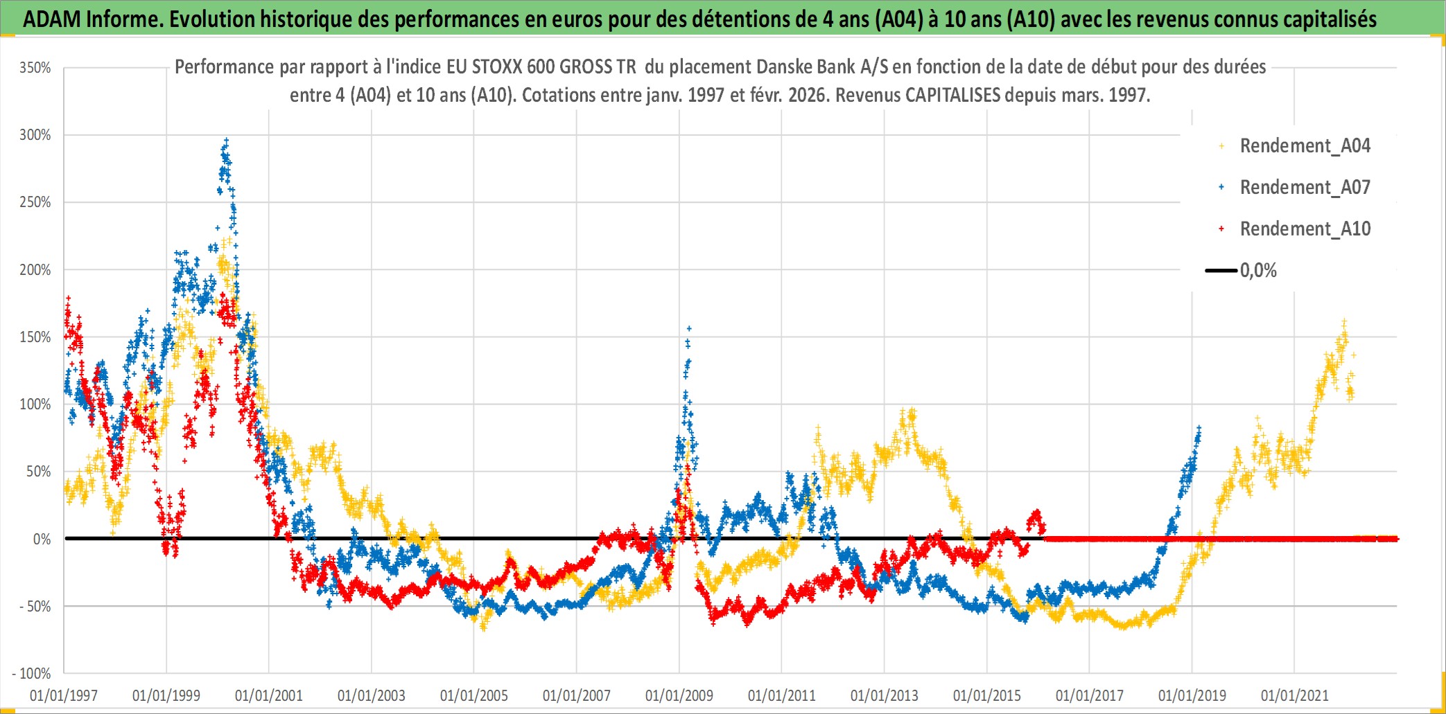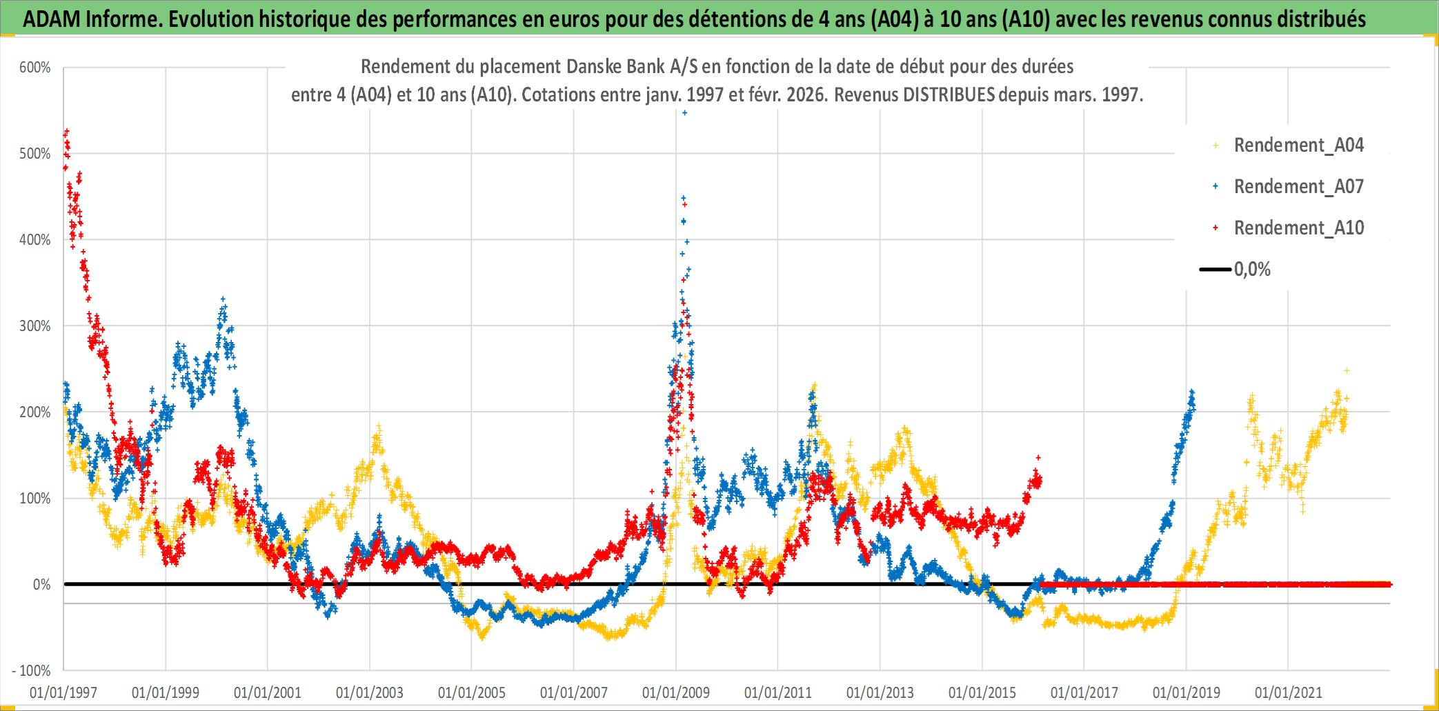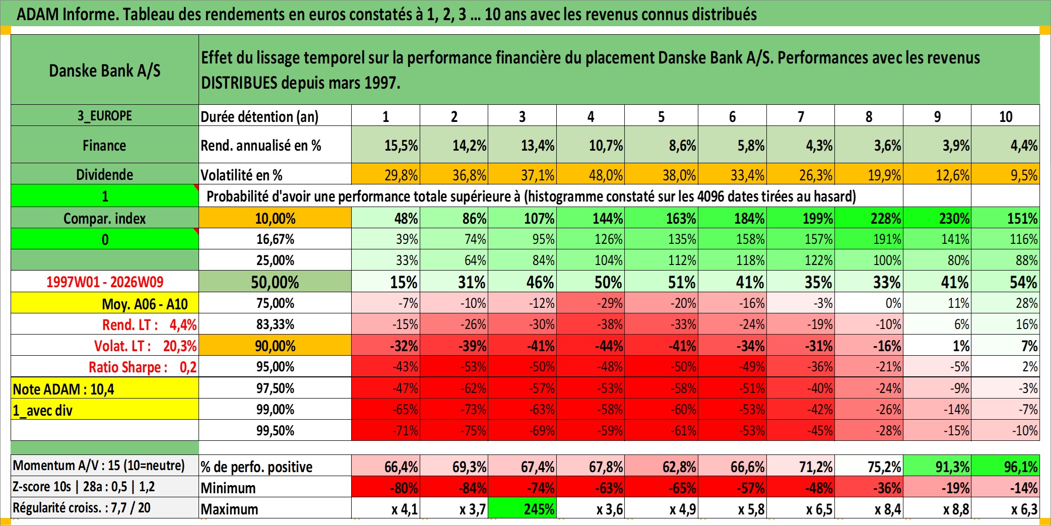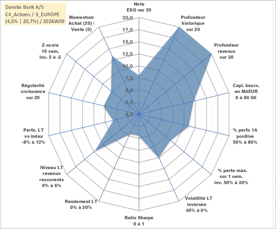 Site dédié aux investisseursPage dédiée sur site financeAnalyse des valorisations hebdomadaires de l'action Danske Bank A/S. Cet actif est cote en DKK. Les valorisations sont en contrevaleur EURO et couvrent les semaines 1997W01 a 2026W09. Les revenus de cet actif financier sont pris en compte depuis la semaine 1997W12. La note globale ESG de cet actif est estimee a 8.0 (apres rebasage entre 0 et 20).