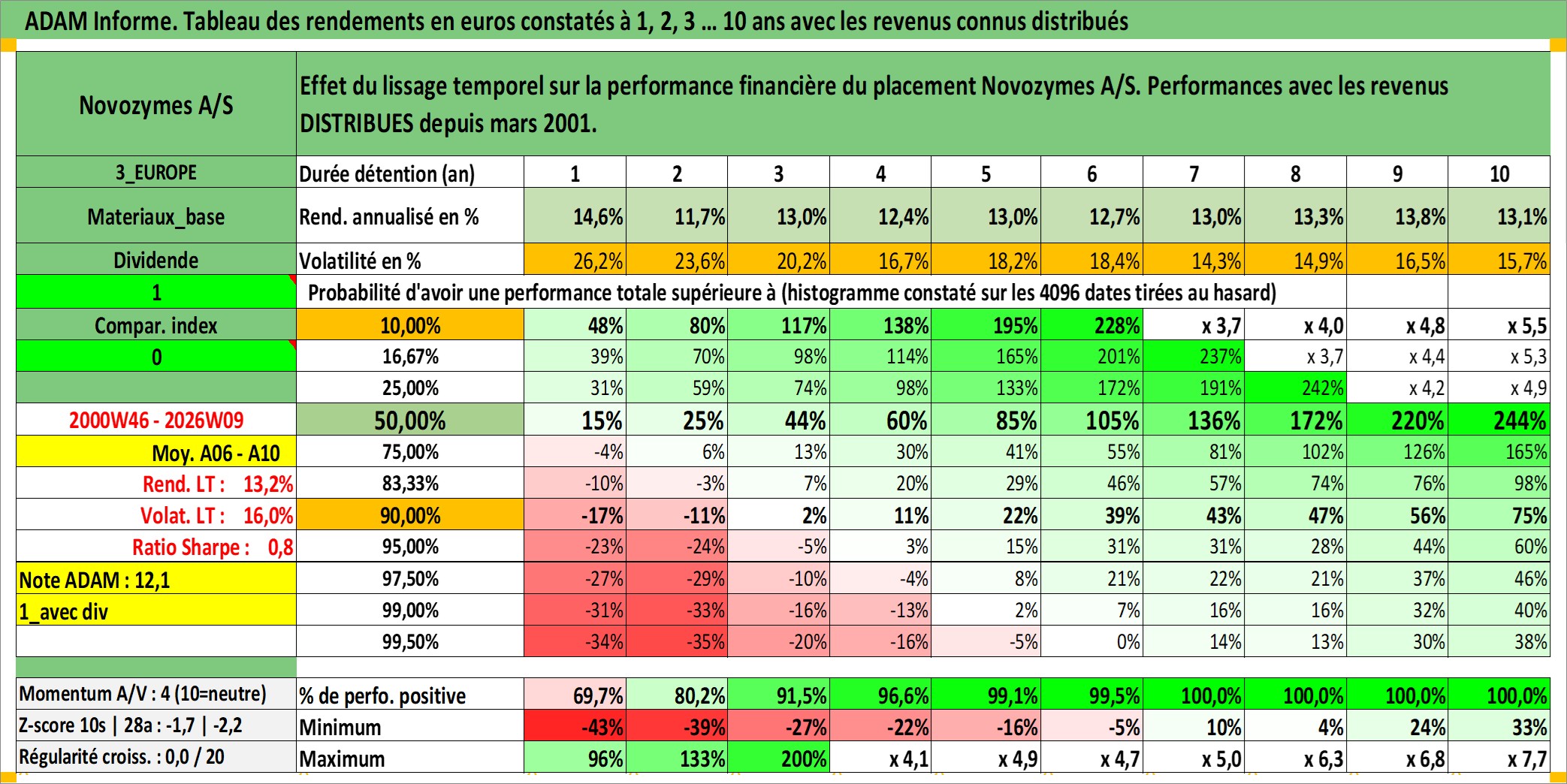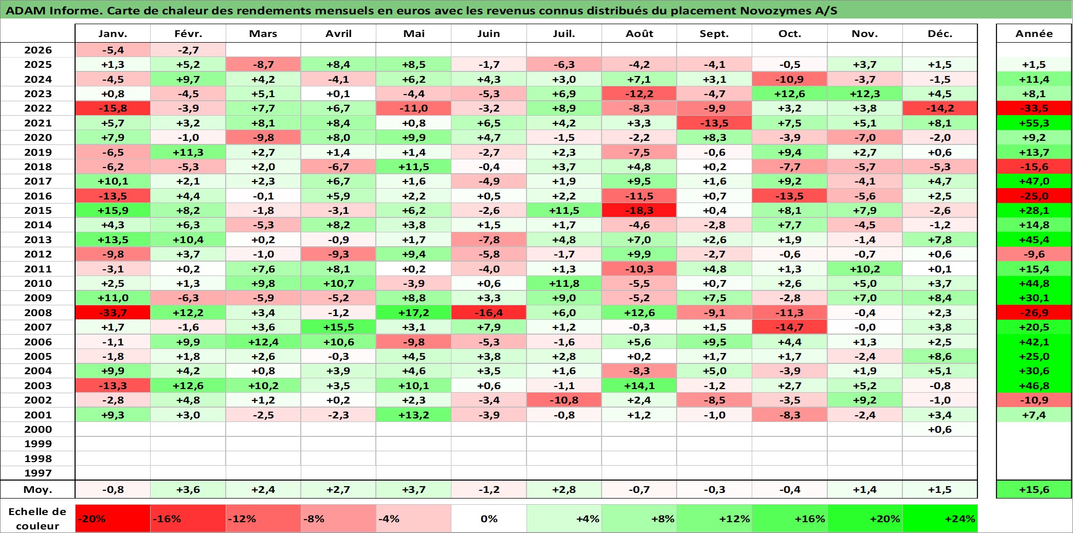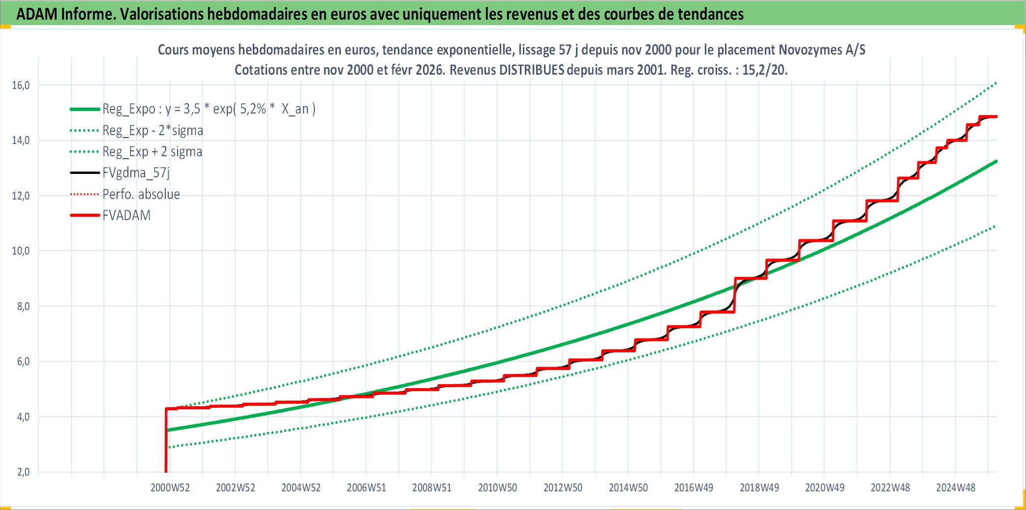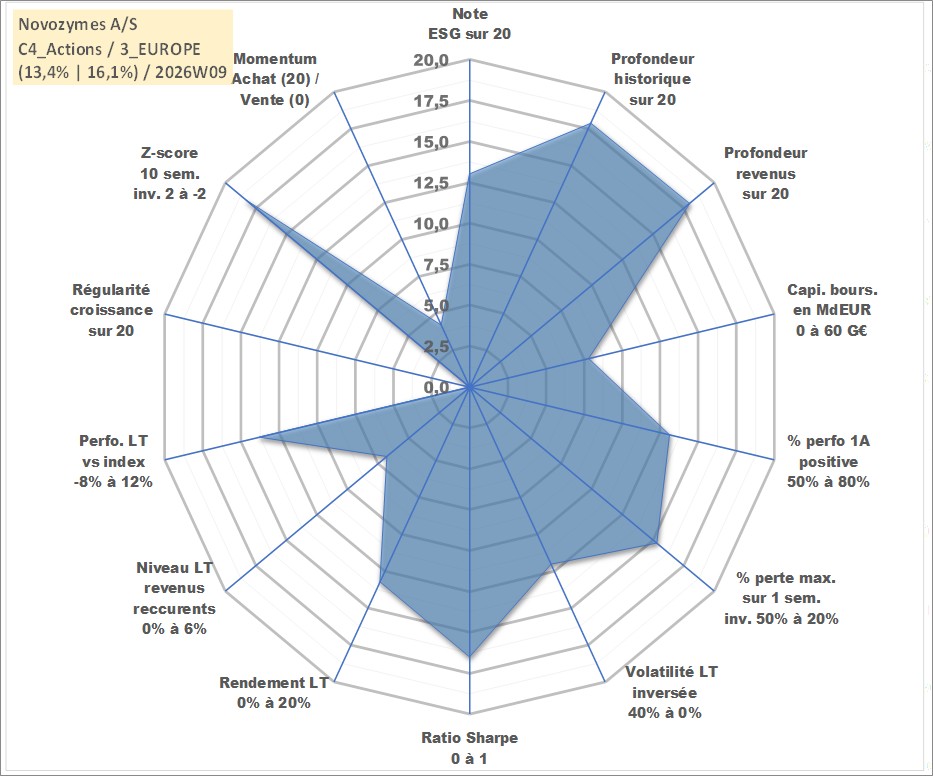 Site dédié aux investisseursPage dédiée sur site financeAnalyse des valorisations hebdomadaires de l'action Novozymes A/S. Cet actif est cote en DKK. Les valorisations sont en contrevaleur EURO et couvrent les semaines 2000W46 a 2026W09. Les revenus de cet actif financier sont pris en compte depuis la semaine 2001W12. La note globale ESG de cet actif est estimee a 13.0 (apres rebasage entre 0 et 20).