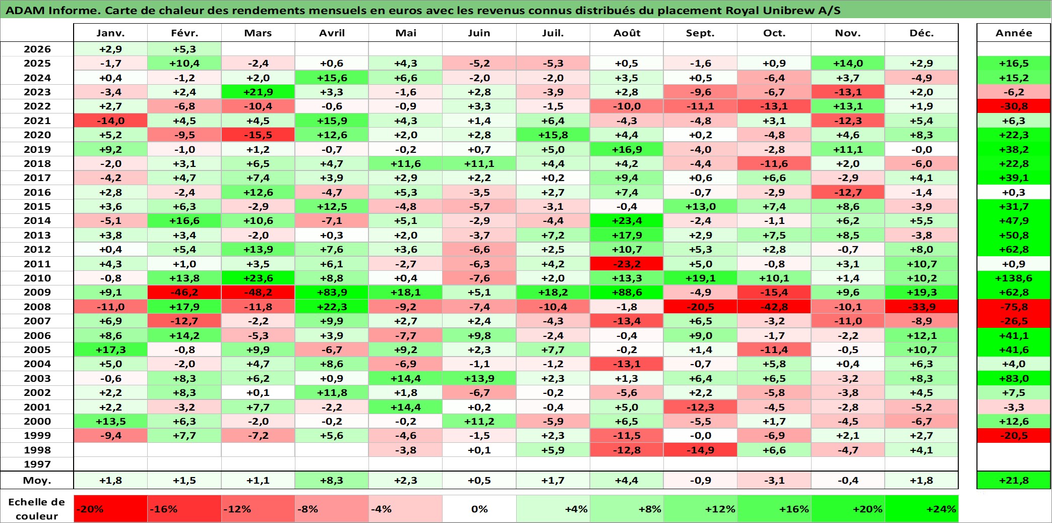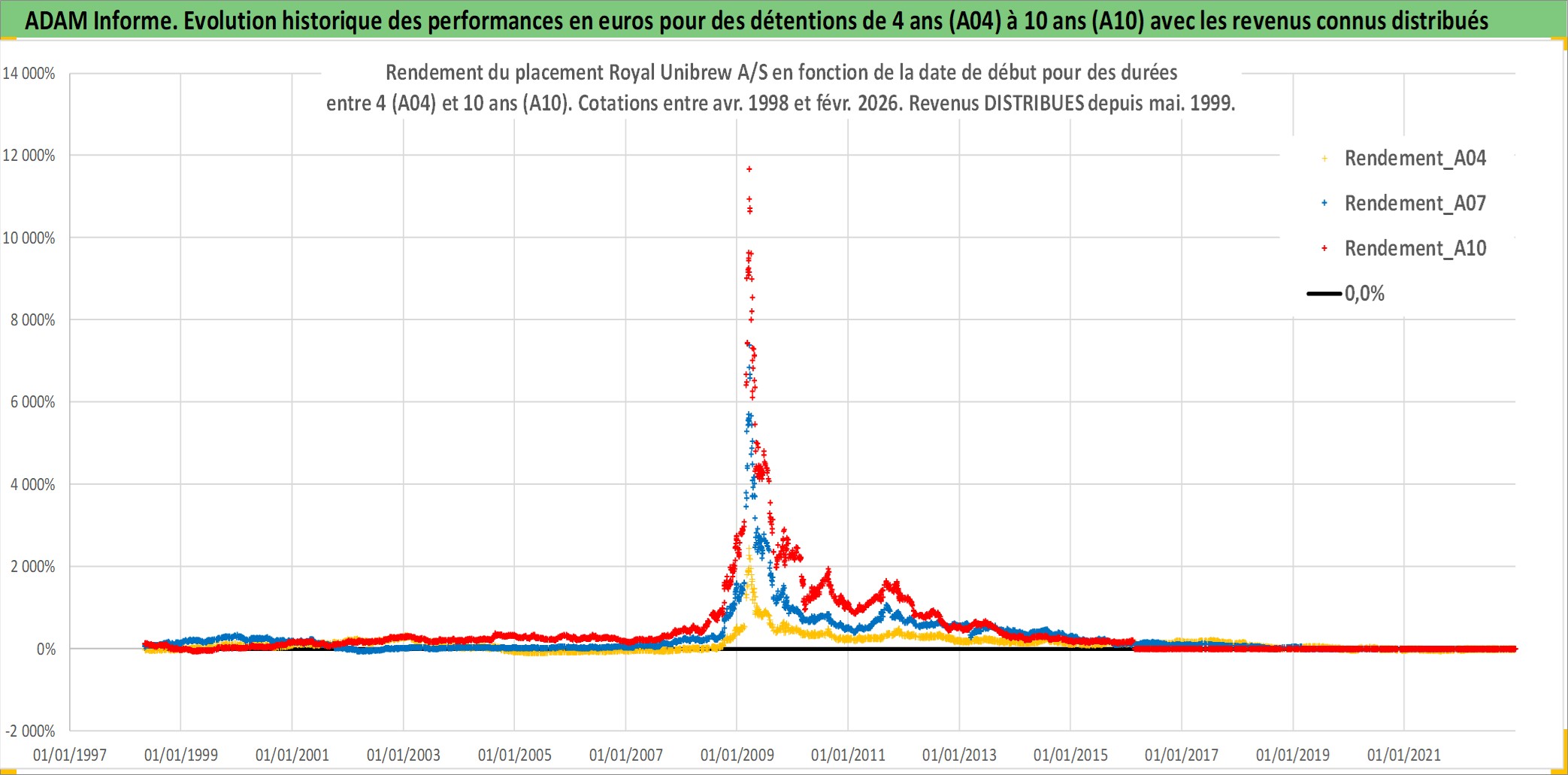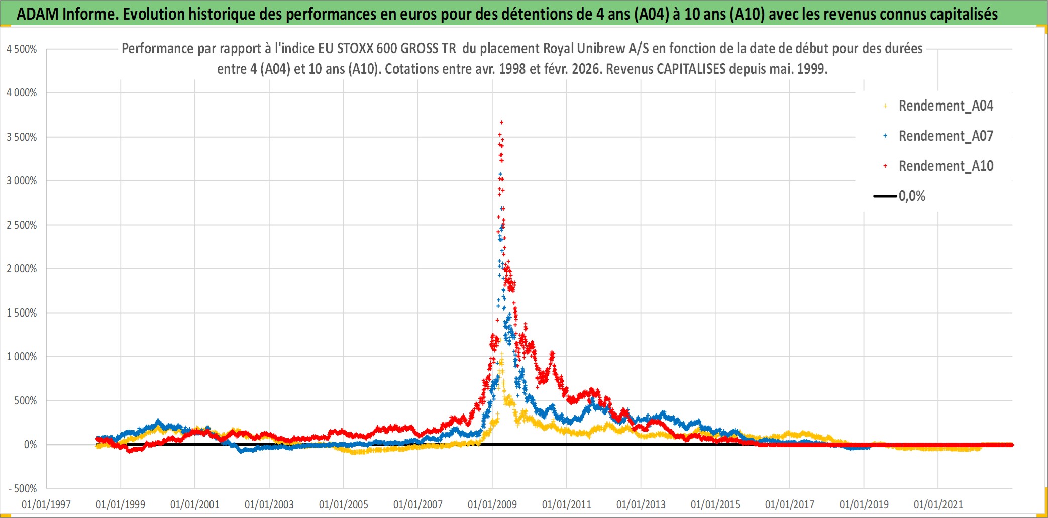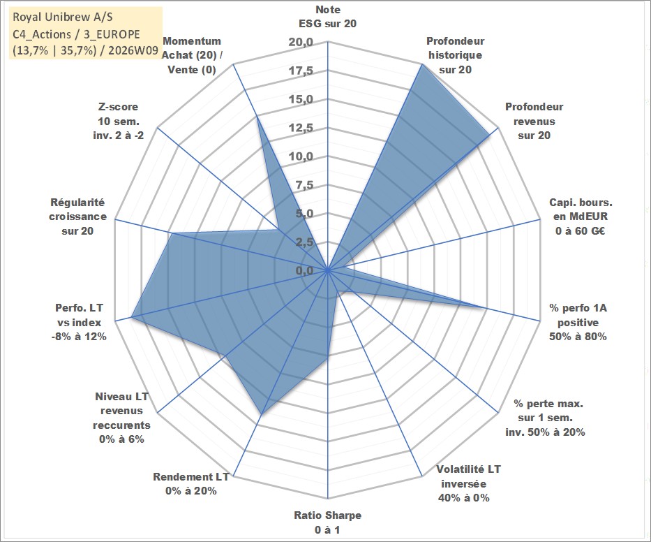 Site dédié aux investisseursPage dédiée sur site financeAnalyse des valorisations hebdomadaires de l'action Royal Unibrew A/S. Cet actif est cote en DKK. Les valorisations sont en contrevaleur EURO et couvrent les semaines 1998W18 a 2026W09. Les revenus de cet actif financier sont pris en compte depuis la semaine 1999W19. La note ESG de cet actif n'est pas connue.