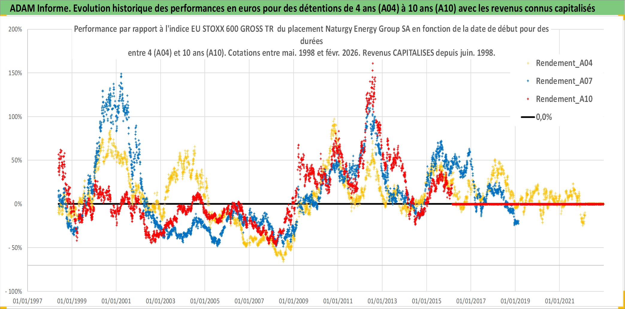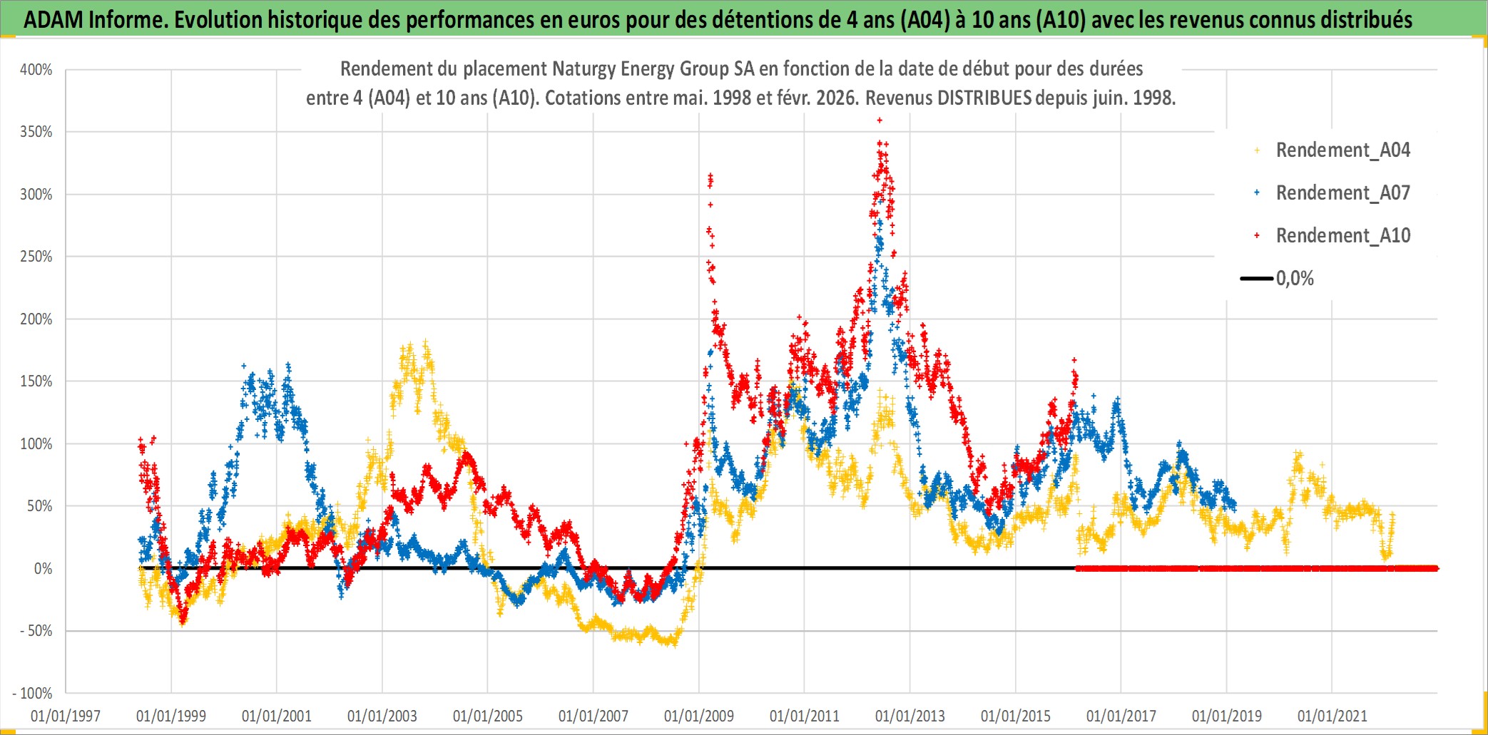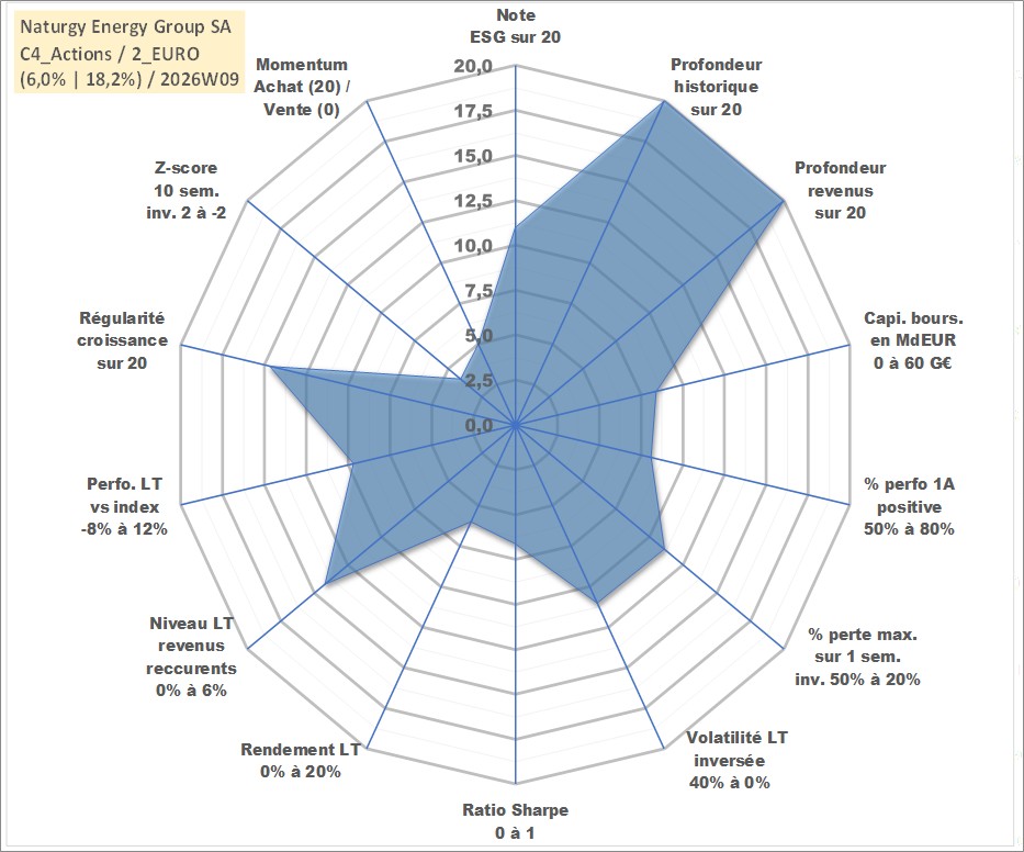 Site dédié aux investisseursPage dédiée sur site financeAnalyse des valorisations hebdomadaires de l'action Naturgy Energy Group SA. Cet actif est cote en EUR. Les valorisations couvrent les semaines 1998W20 a 2026W09. Les revenus de cet actif financier sont pris en compte depuis la semaine 1998W27. La note globale ESG de cet actif est estimee a 11.0 (apres rebasage entre 0 et 20).