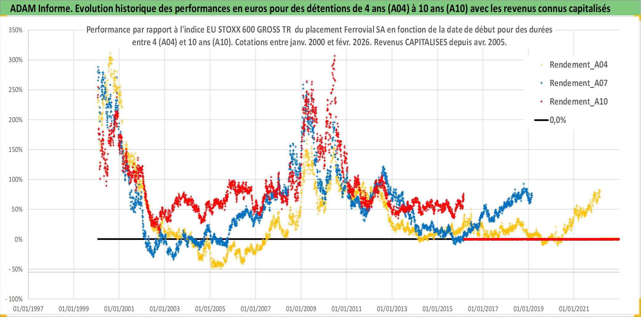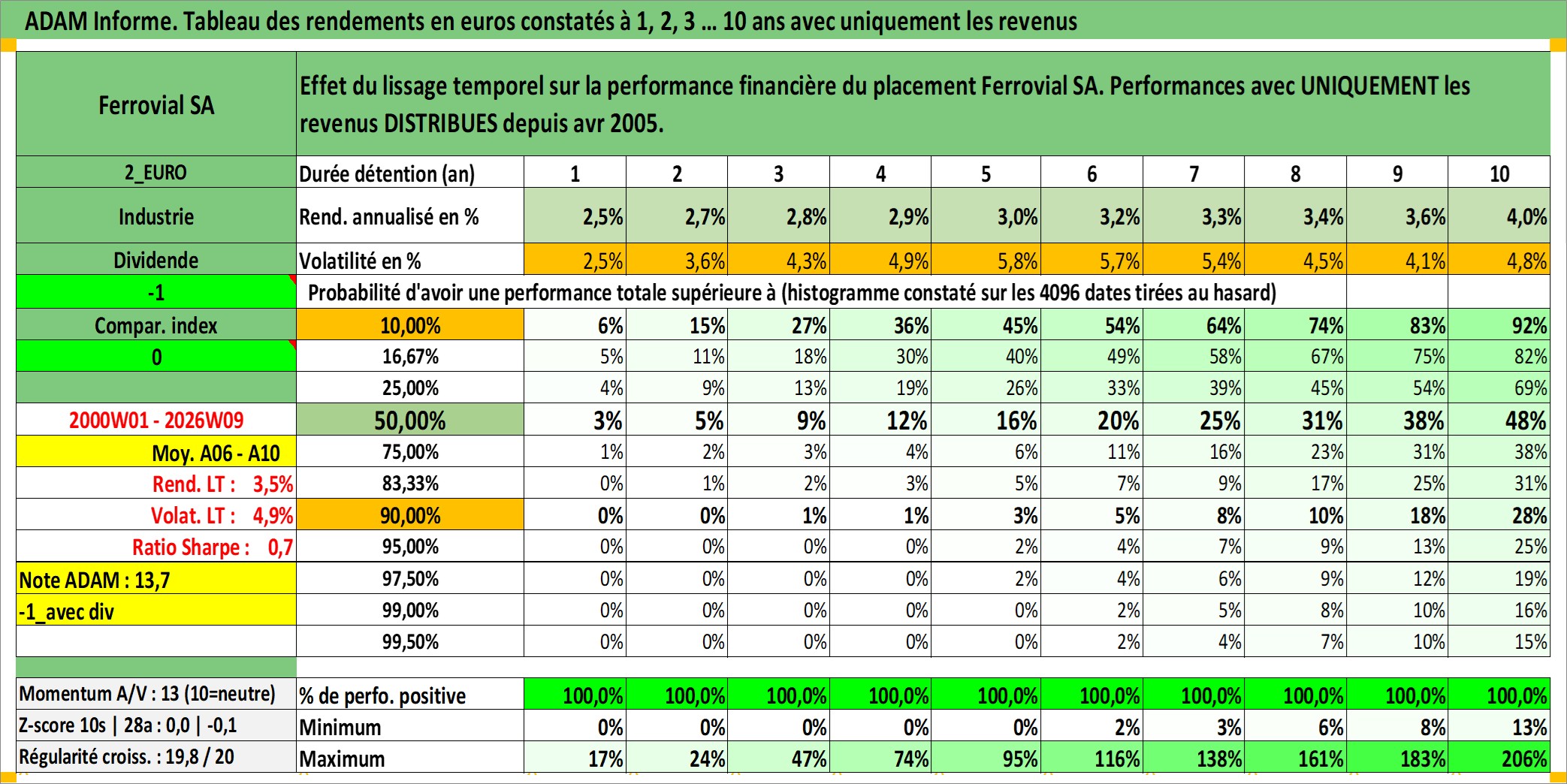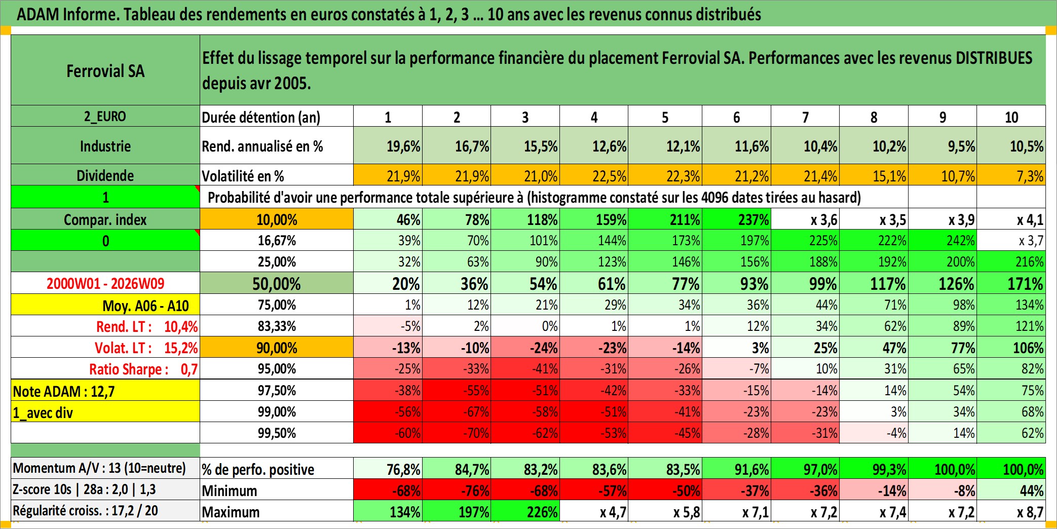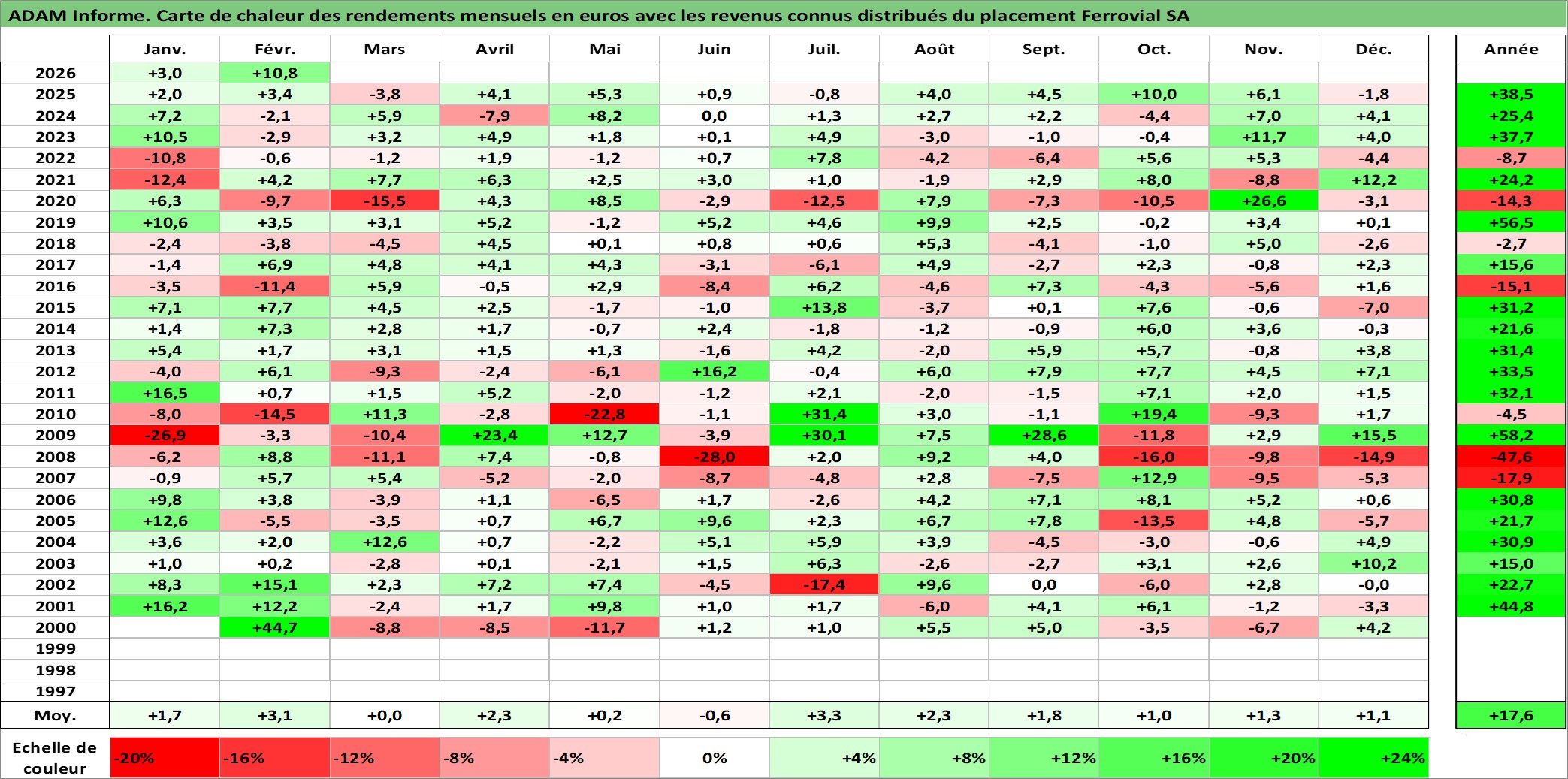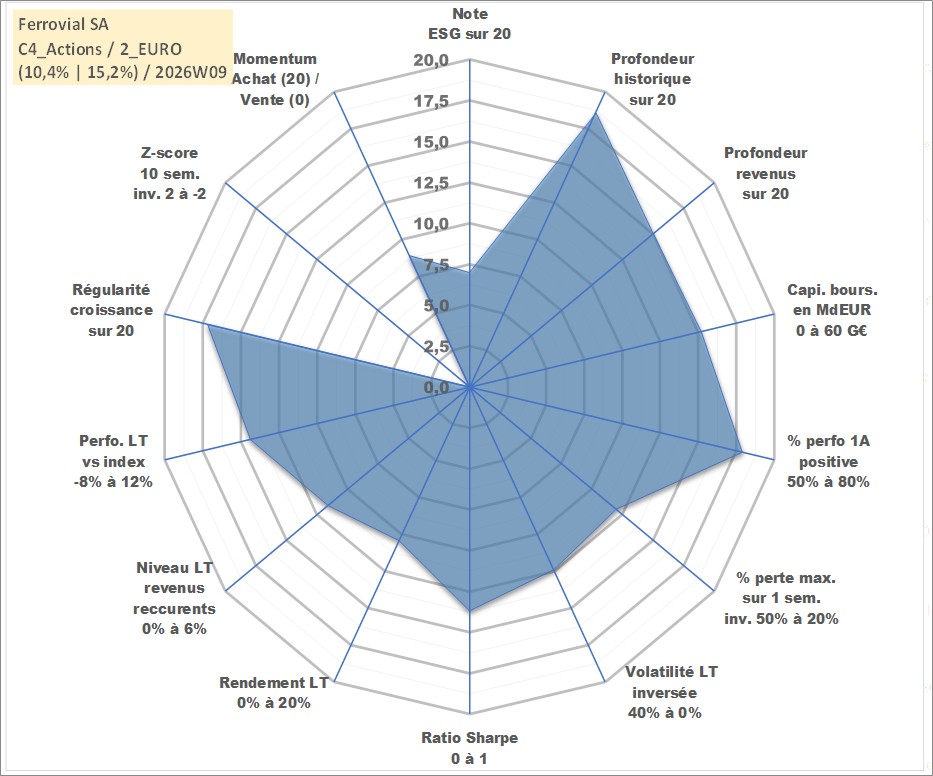 Site dédié aux investisseursPage dédiée sur site financeAnalyse des valorisations hebdomadaires de l'action Ferrovial SA. Cet actif est cote en EUR. Les valorisations couvrent les semaines 2000W01 a 2026W09. Les revenus de cet actif financier sont pris en compte depuis la semaine 2005W15. La note globale ESG de cet actif est estimee a 7.0 (apres rebasage entre 0 et 20).