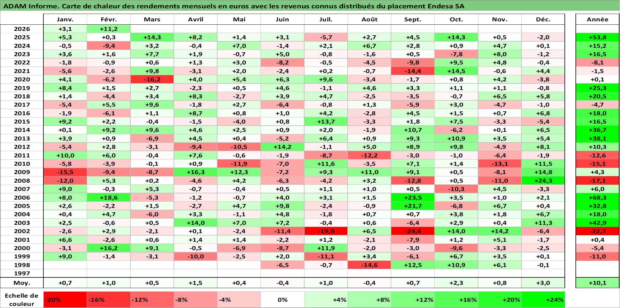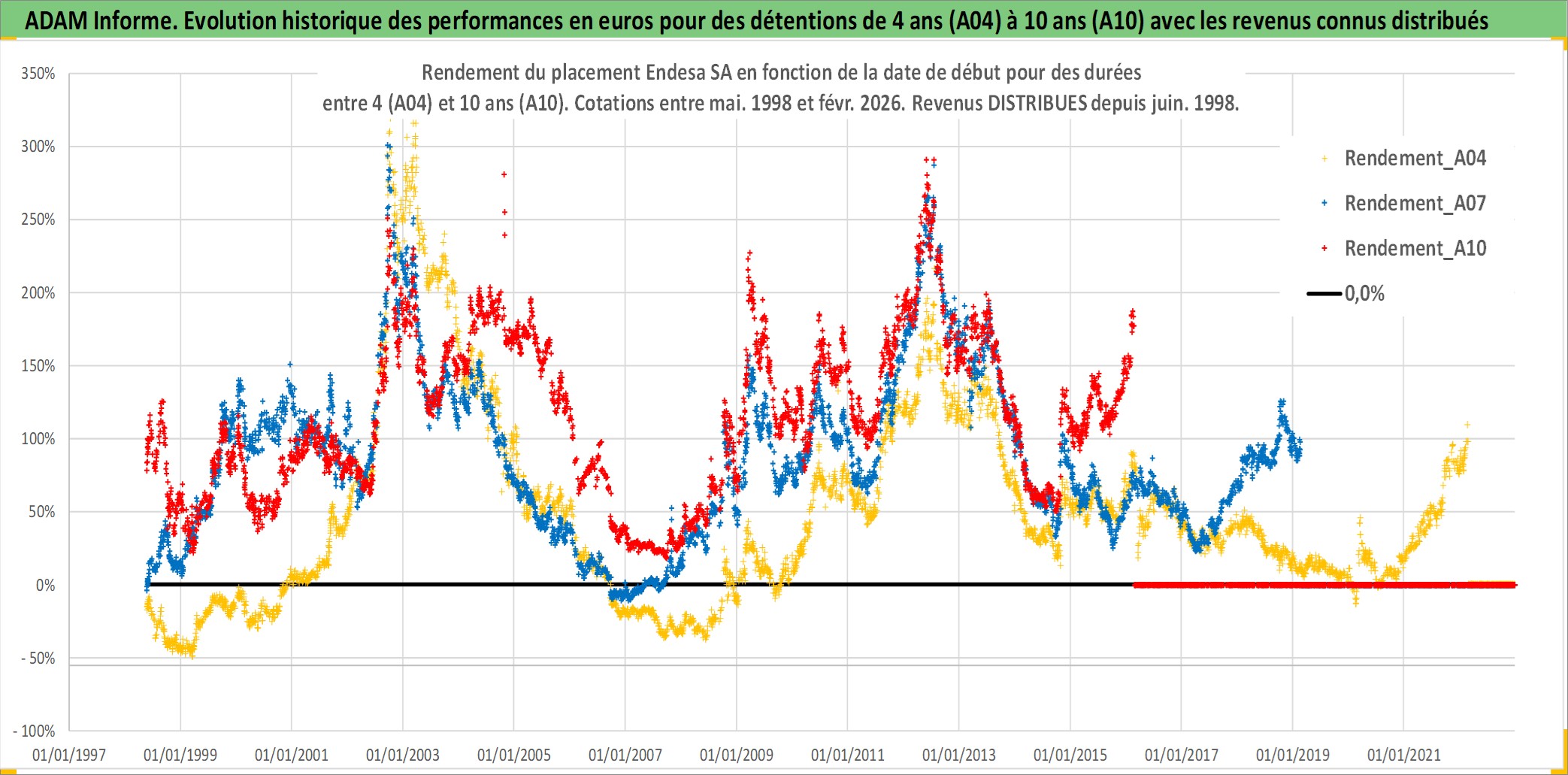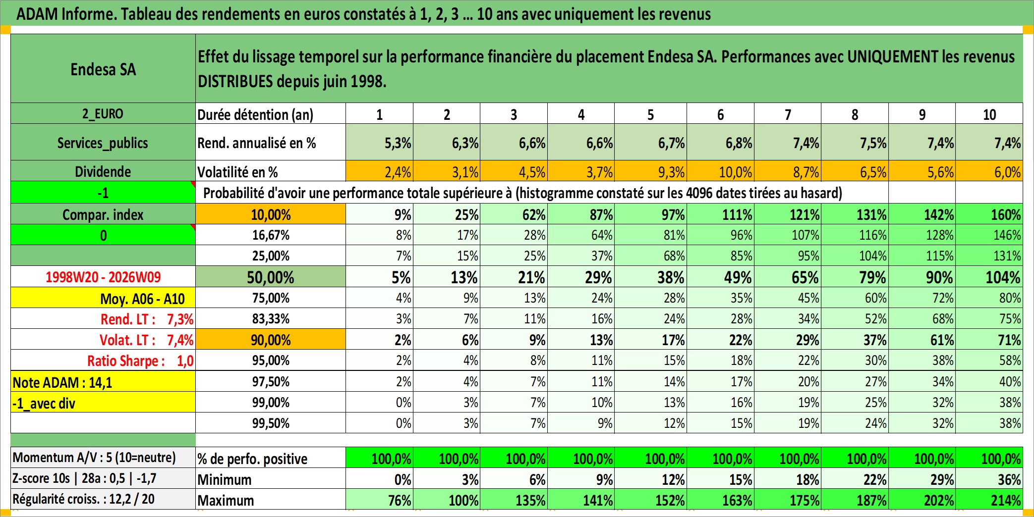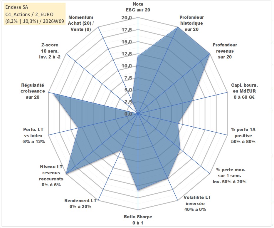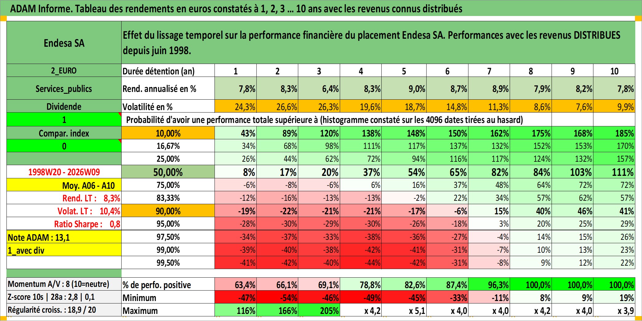 Site dédié aux investisseursPage dédiée sur site financeAnalyse des valorisations hebdomadaires de l'action Endesa SA. Cet actif est cote en EUR. Les valorisations couvrent les semaines 1998W20 a 2026W09. Les revenus de cet actif financier sont pris en compte depuis la semaine 1998W25. La note globale ESG de cet actif est estimee a 12.0 (apres rebasage entre 0 et 20).