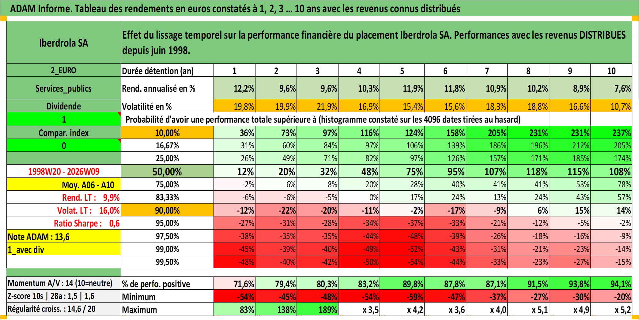 Site dédié aux investisseursPage dédiée sur site financeAnalyse des valorisations hebdomadaires de l'action Iberdrola SA. Cet actif est cote en EUR. Les valorisations couvrent les semaines 1998W20 a 2026W09. Les revenus de cet actif financier sont pris en compte depuis la semaine 1998W27. La note globale ESG de cet actif est estimee a 10.0 (apres rebasage entre 0 et 20).