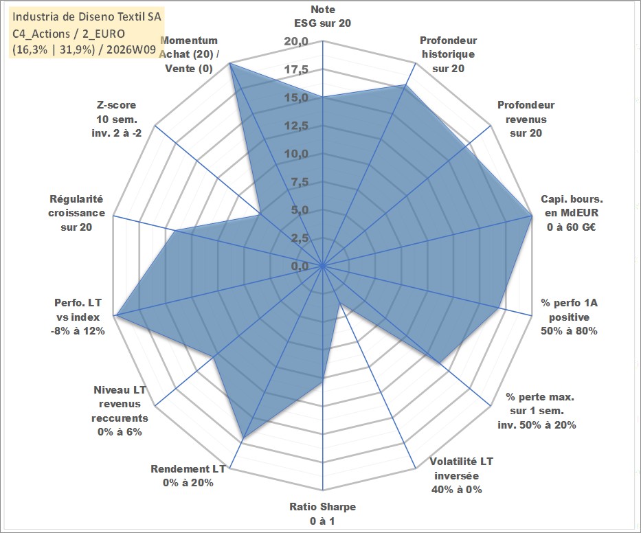Site dédié aux investisseursPage dédiée sur site financeAnalyse des valorisations hebdomadaires de l'action Industria de Diseno Textil SA. Cet actif est cote en EUR. Les valorisations couvrent les semaines 2001W21 a 2026W09. Les revenus de cet actif financier sont pris en compte depuis la semaine 2002W30. La note globale ESG de cet actif est estimee a 15.0 (apres rebasage entre 0 et 20).
