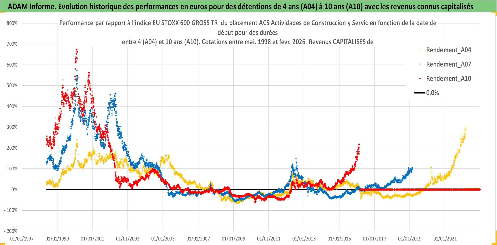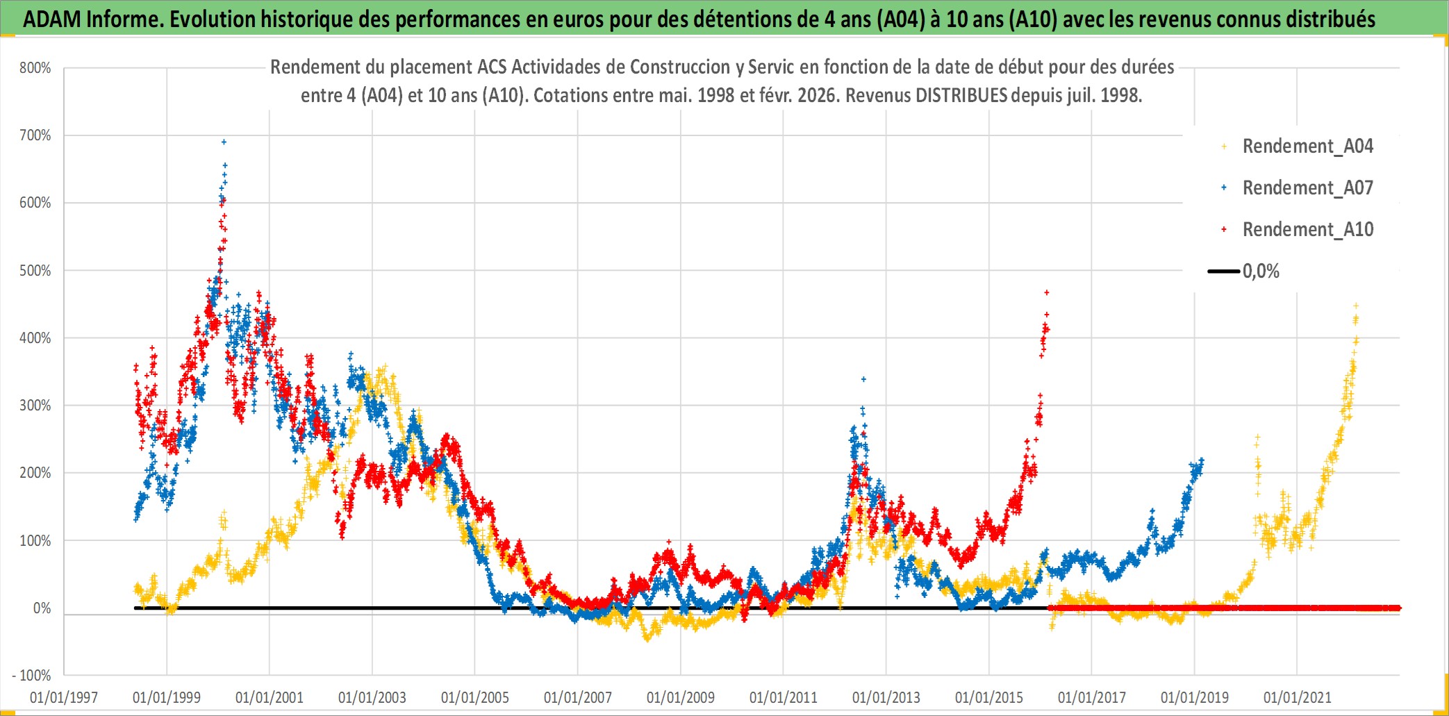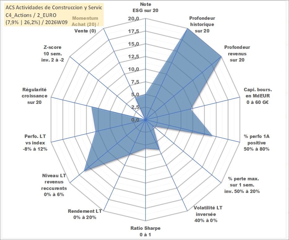 Site dédié aux investisseursPage dédiée sur site financeAnalyse des valorisations hebdomadaires de l'action ACS Actividades de Construccion y Servic. Cet actif est cote en EUR. Les valorisations couvrent les semaines 1998W20 a 2026W09. Les revenus de cet actif financier sont pris en compte depuis la semaine 1998W29. La note globale ESG de cet actif est estimee a 5.0 (apres rebasage entre 0 et 20).