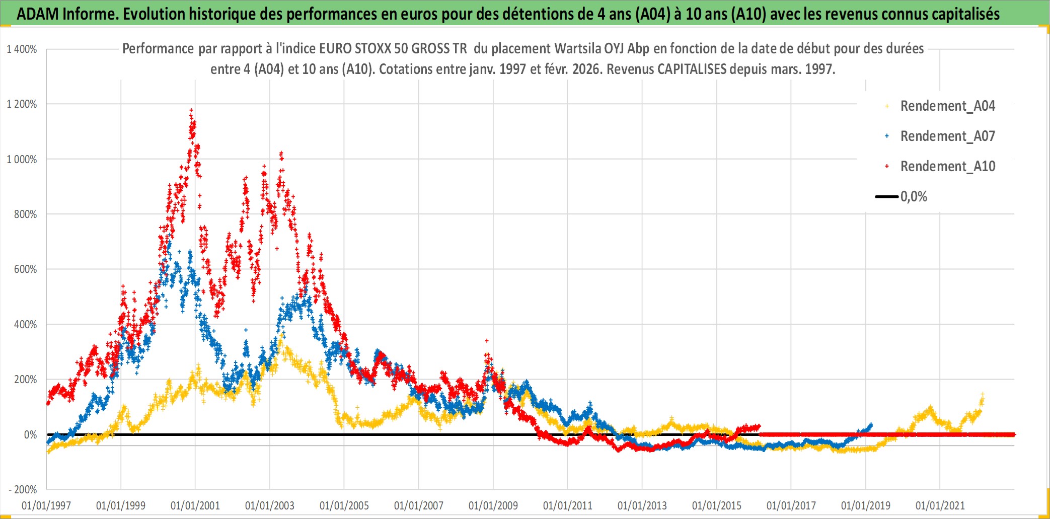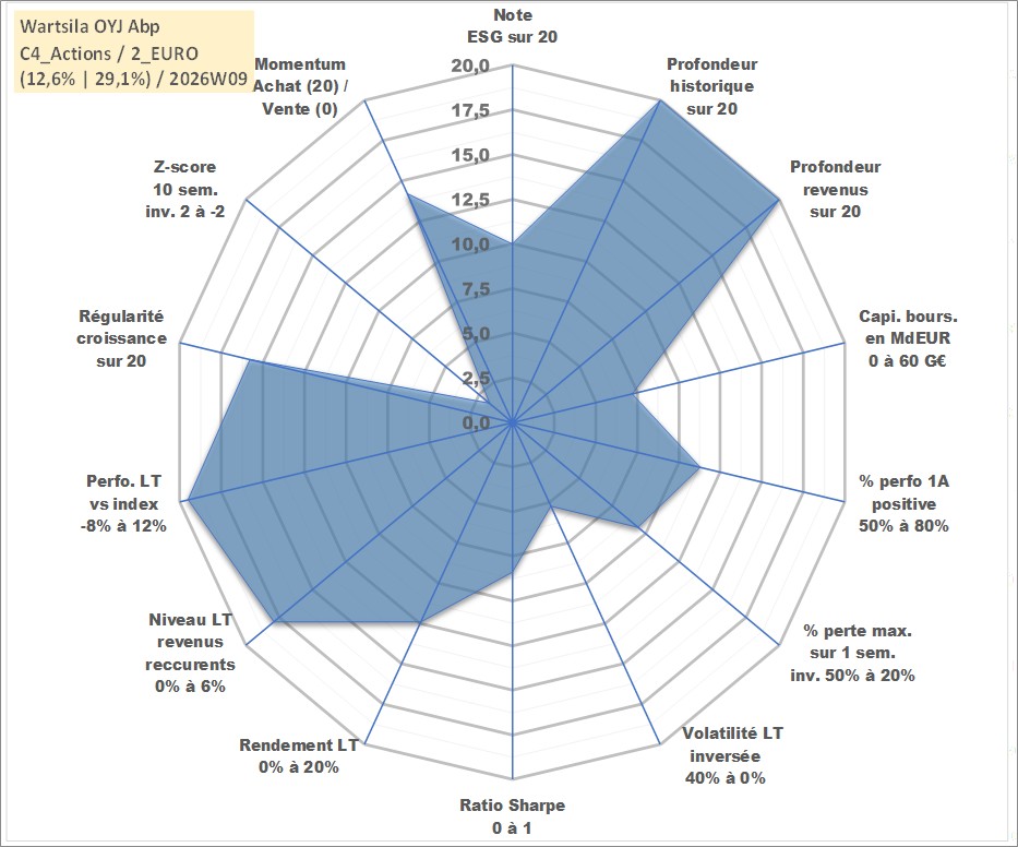 Site dédié aux investisseursPage dédiée sur site financeAnalyse des valorisations hebdomadaires de l'action Wartsila OYJ Abp. Cet actif est cote en EUR. Les valorisations couvrent les semaines 1997W01 a 2026W09. Les revenus de cet actif financier sont pris en compte depuis la semaine 1997W13. La note globale ESG de cet actif est estimee a 10.0 (apres rebasage entre 0 et 20).