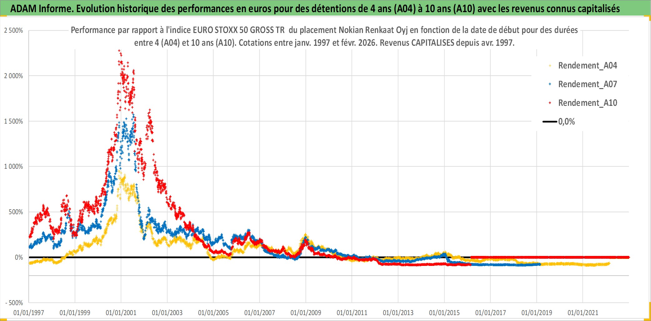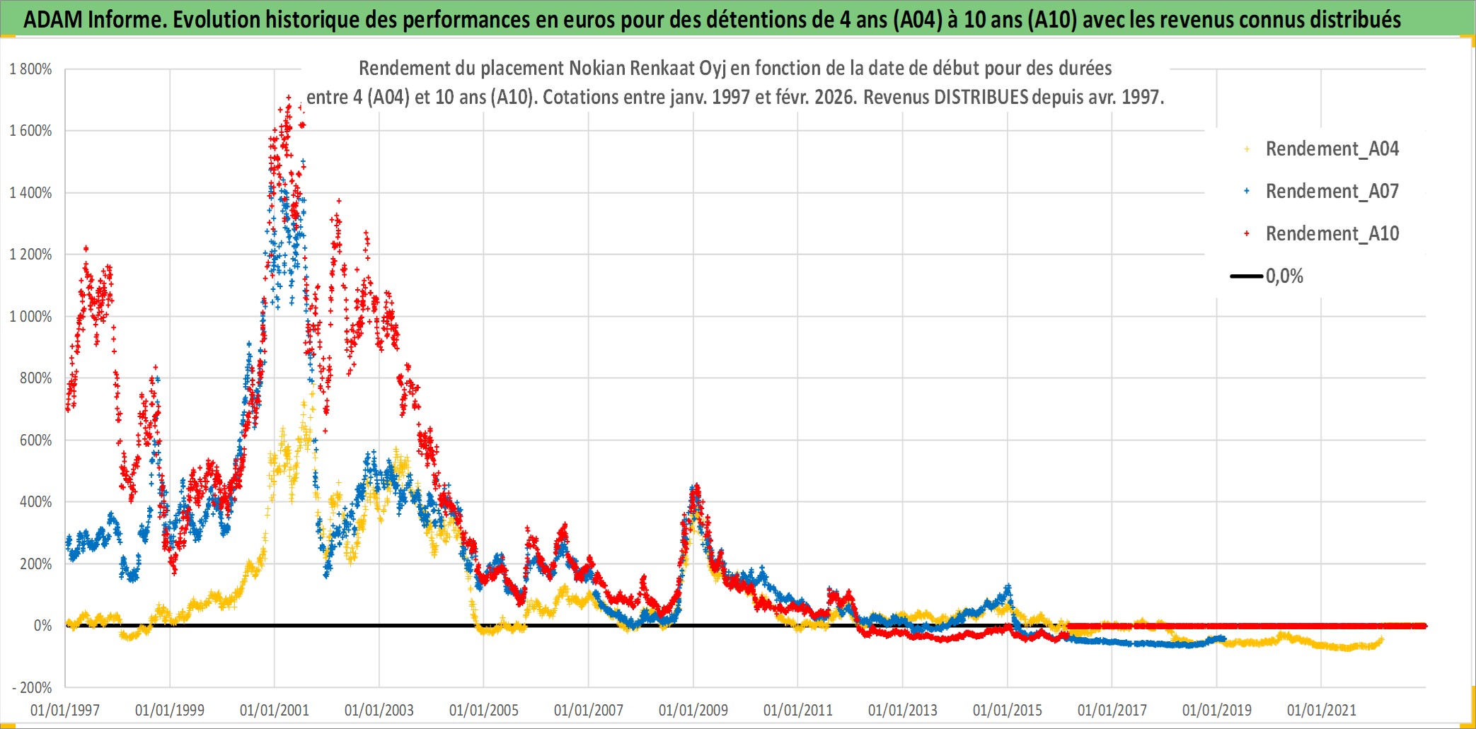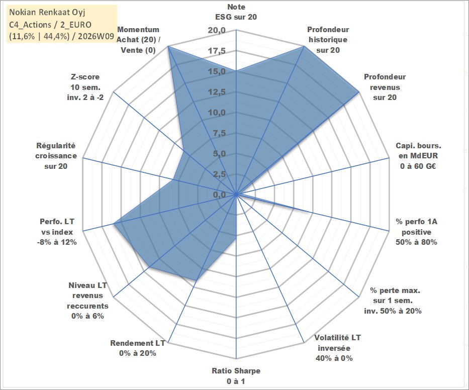 Site dédié aux investisseursPage dédiée sur site financeAnalyse des valorisations hebdomadaires de l'action Nokian Renkaat Oyj. Cet actif est cote en EUR. Les valorisations couvrent les semaines 1997W01 a 2026W09. Les revenus de cet actif financier sont pris en compte depuis la semaine 1997W14. La note globale ESG de cet actif est estimee a 15.0 (apres rebasage entre 0 et 20).
